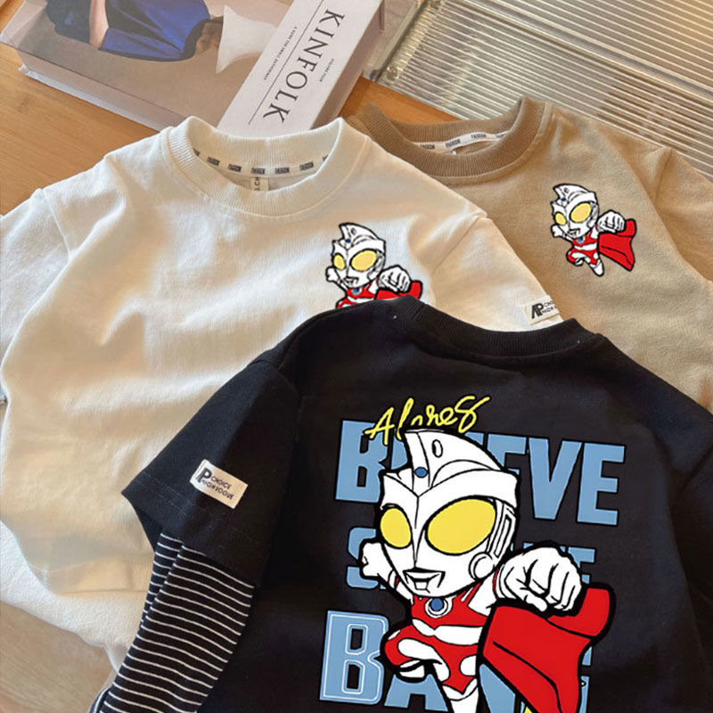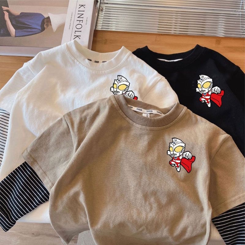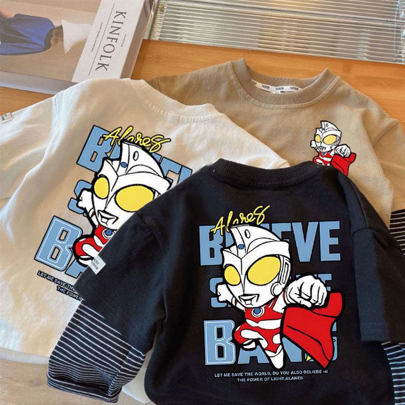 아동면 티셔츠 긴팔 울트라 맨 옷 봄과 가을 가짜 투피스 바닥 셔츠 남성과 여성의 아기 가을 탑스토어 가기