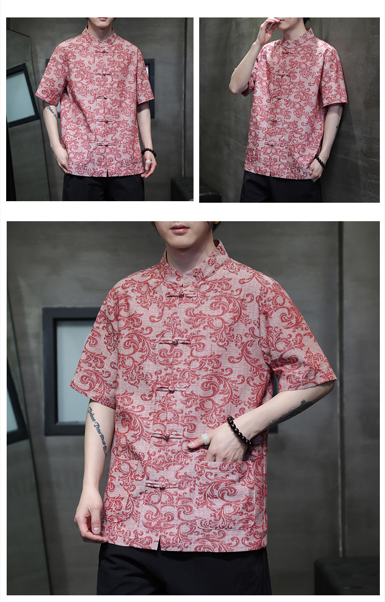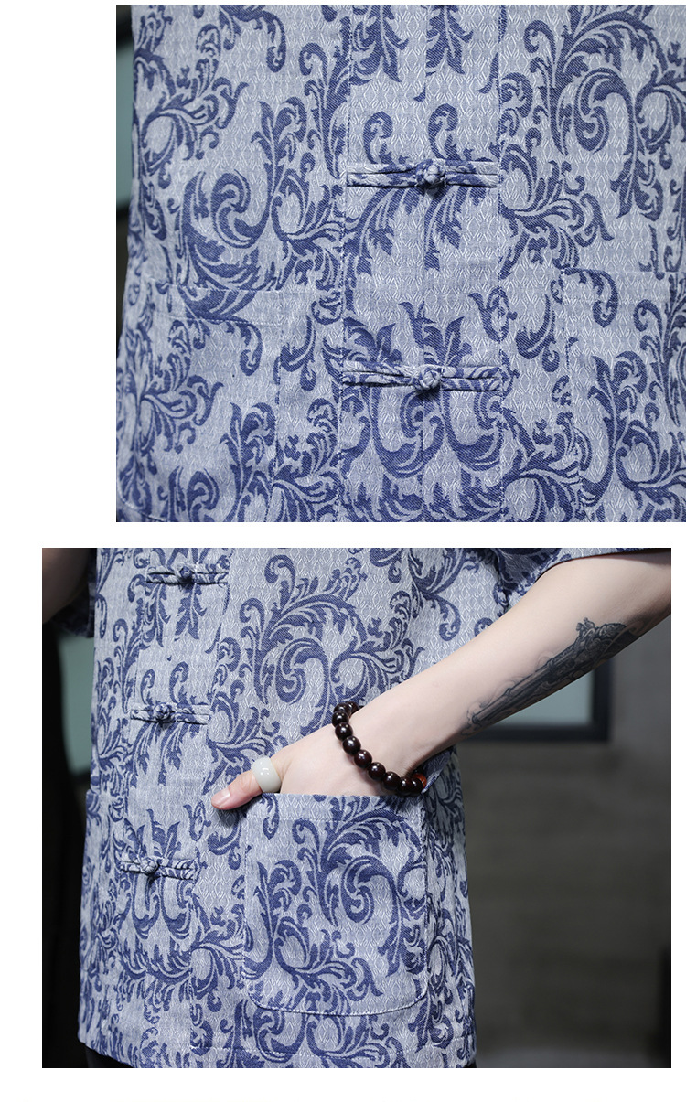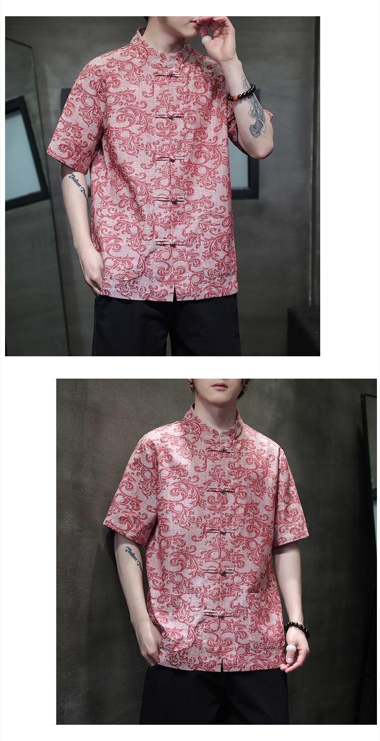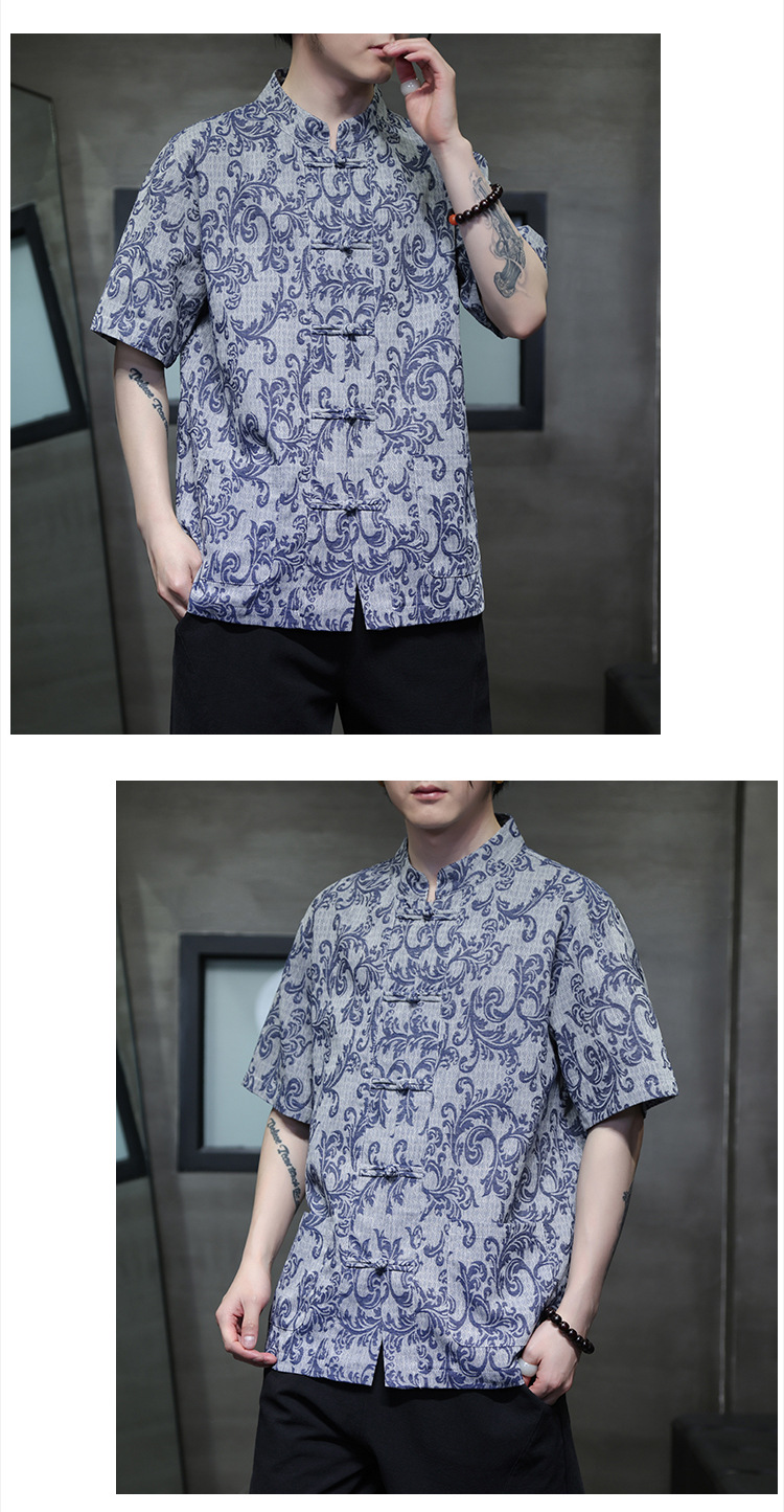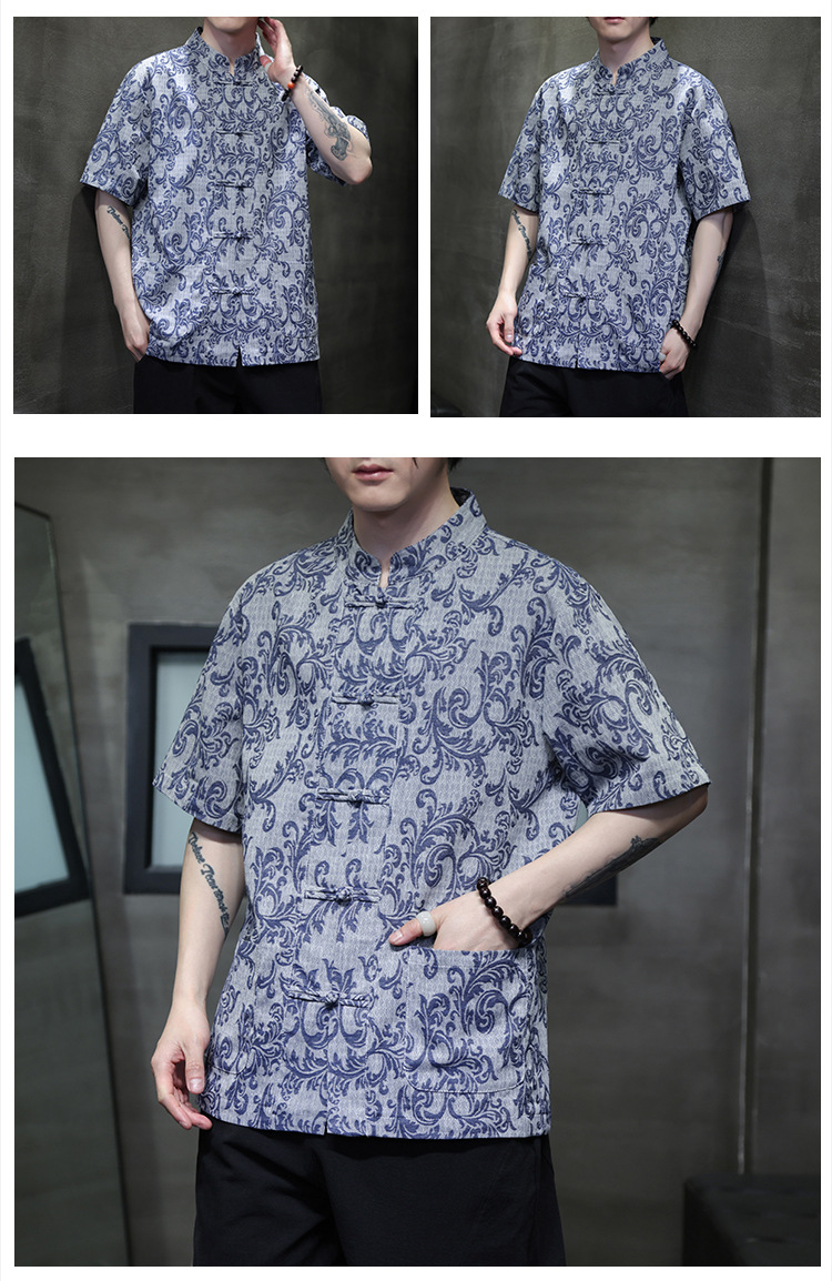 2024 탕 세트 남성 여름 반팔면 및 린넨 셔츠 중국 스타일 버클 프린트 청소년 스탠드 칼라 캐주얼 셔츠스토어 가기