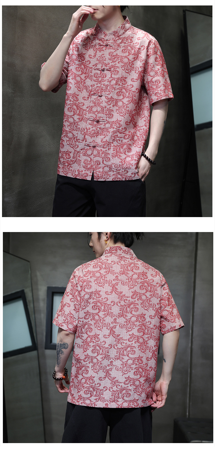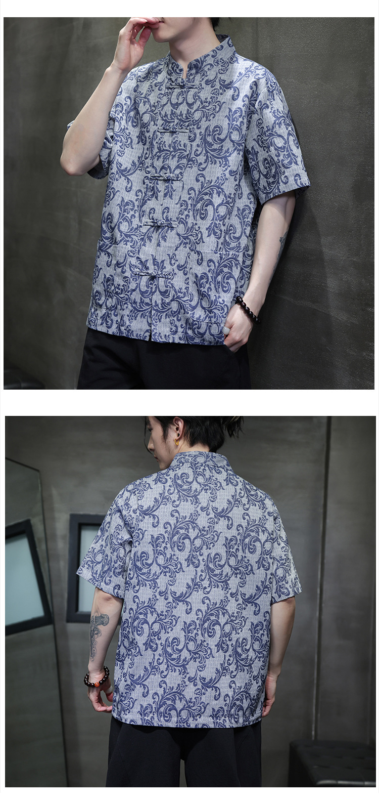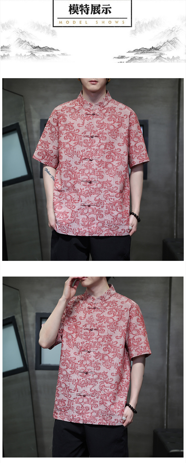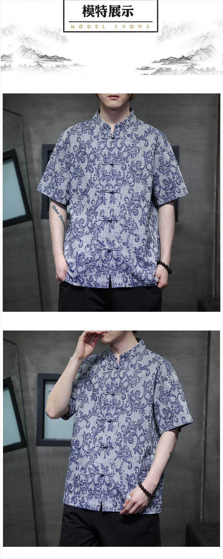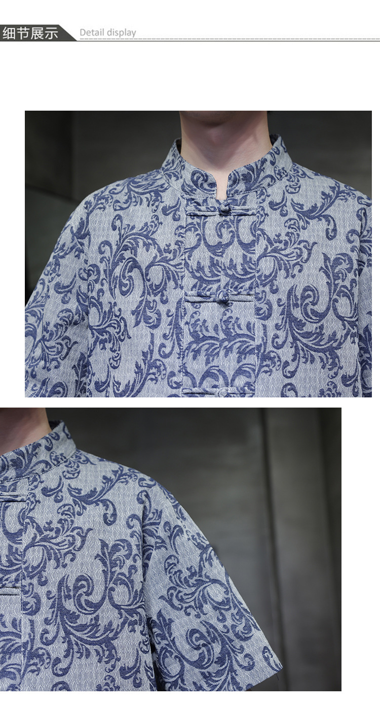 2024 탕 세트 남성 여름 반팔면 및 린넨 셔츠 중국 스타일 버클 프린트 청소년 스탠드 칼라 캐주얼 셔츠스토어 가기