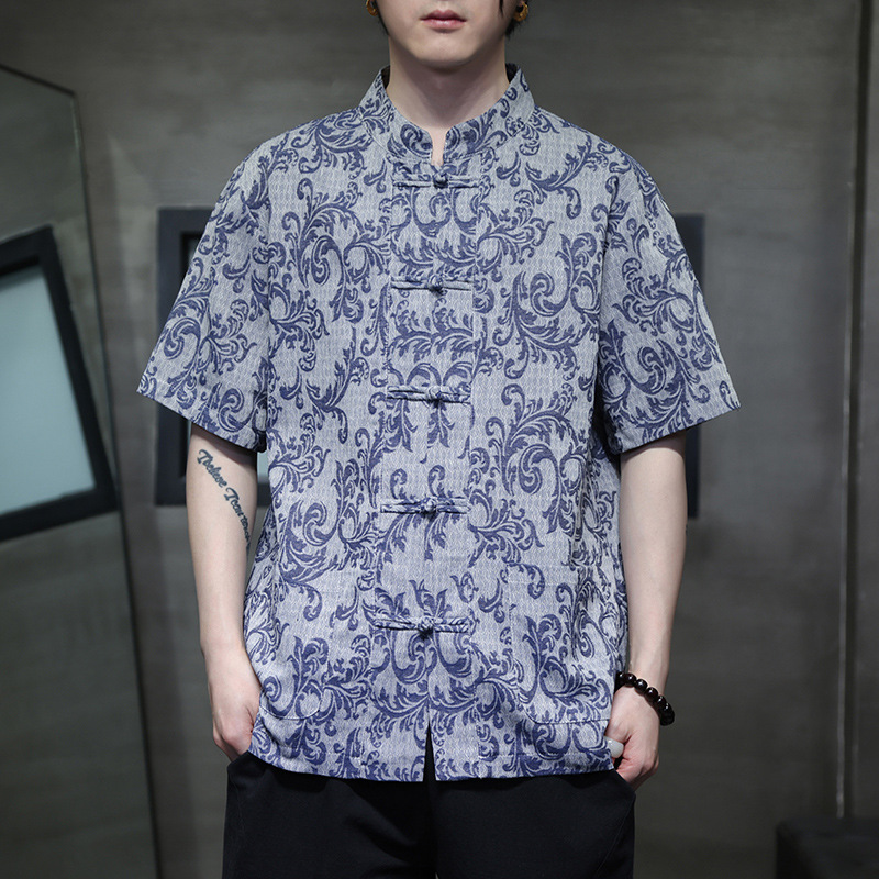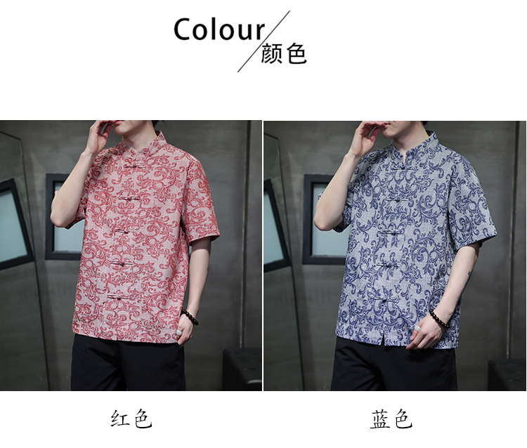 2024 탕 세트 남성 여름 반팔면 및 린넨 셔츠 중국 스타일 버클 프린트 청소년 스탠드 칼라 캐주얼 셔츠