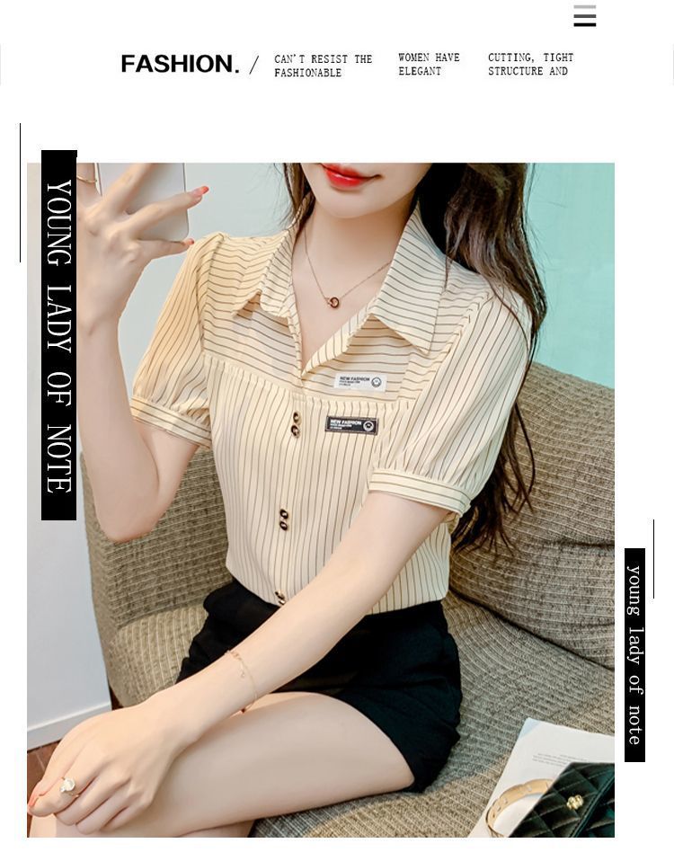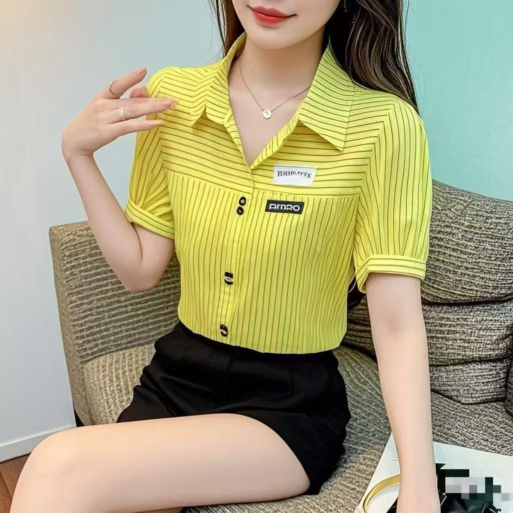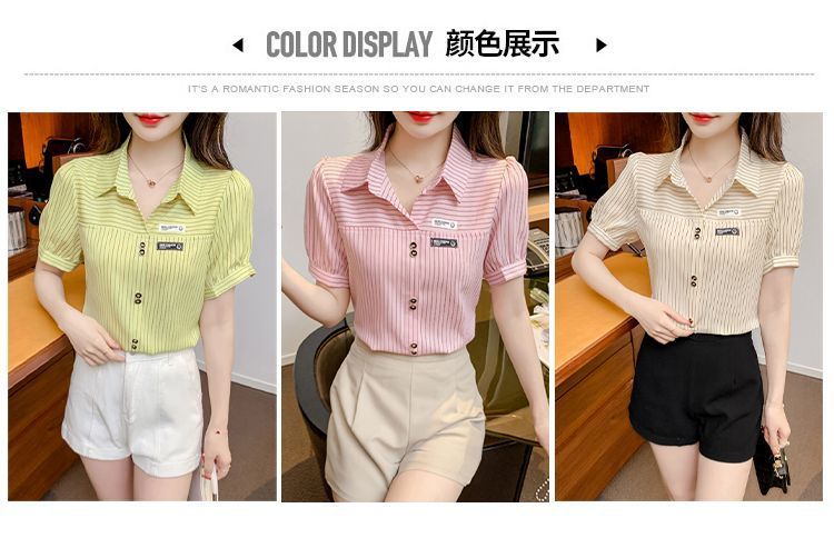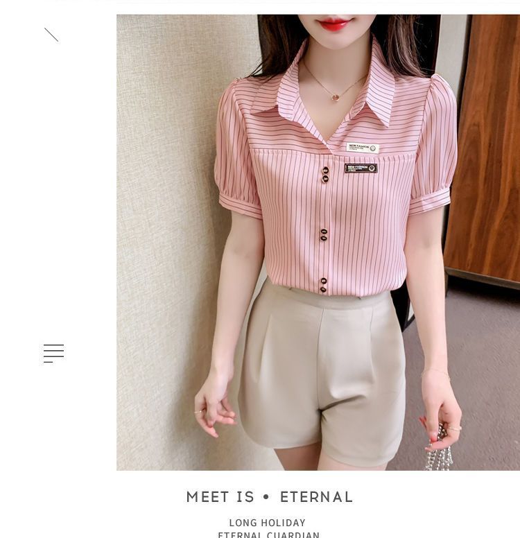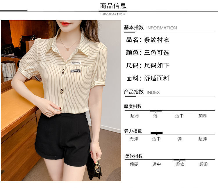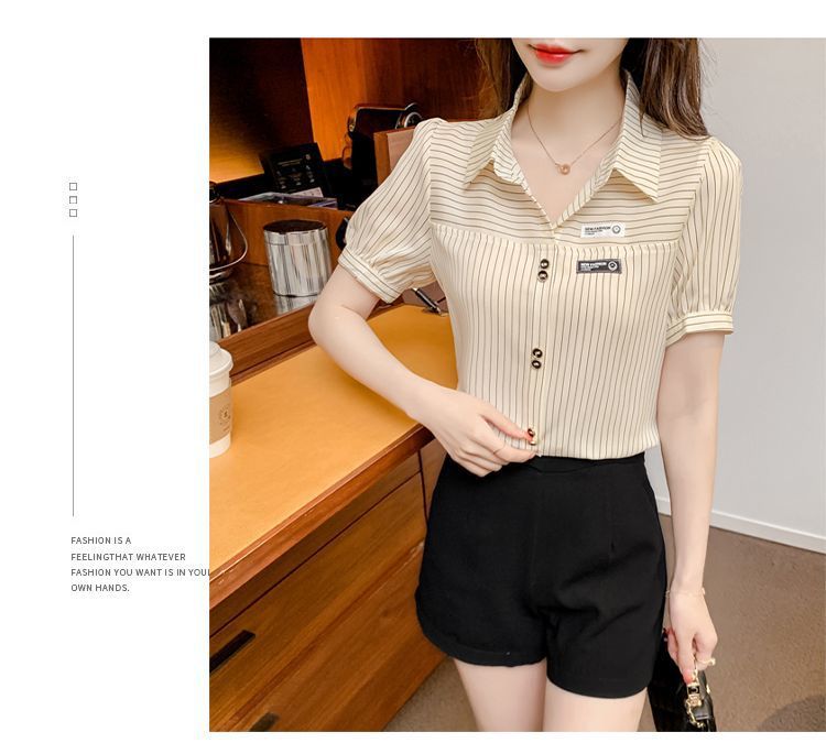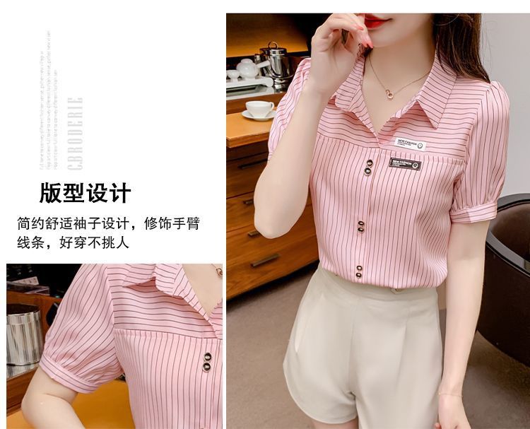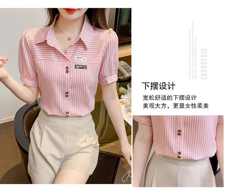 여름 새로운 디자인 감각 틈새 비즈니스 라이트 럭셔리 OL 셔츠 2024 여성을위한 스트라이프 풀오버 짧은 소매 비즈니스 착용 셔츠스토어 가기