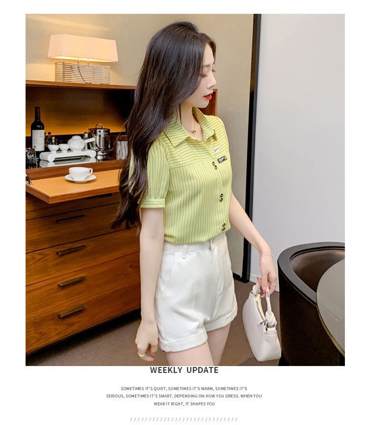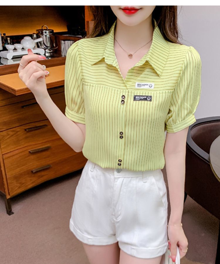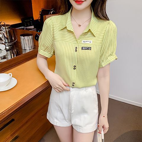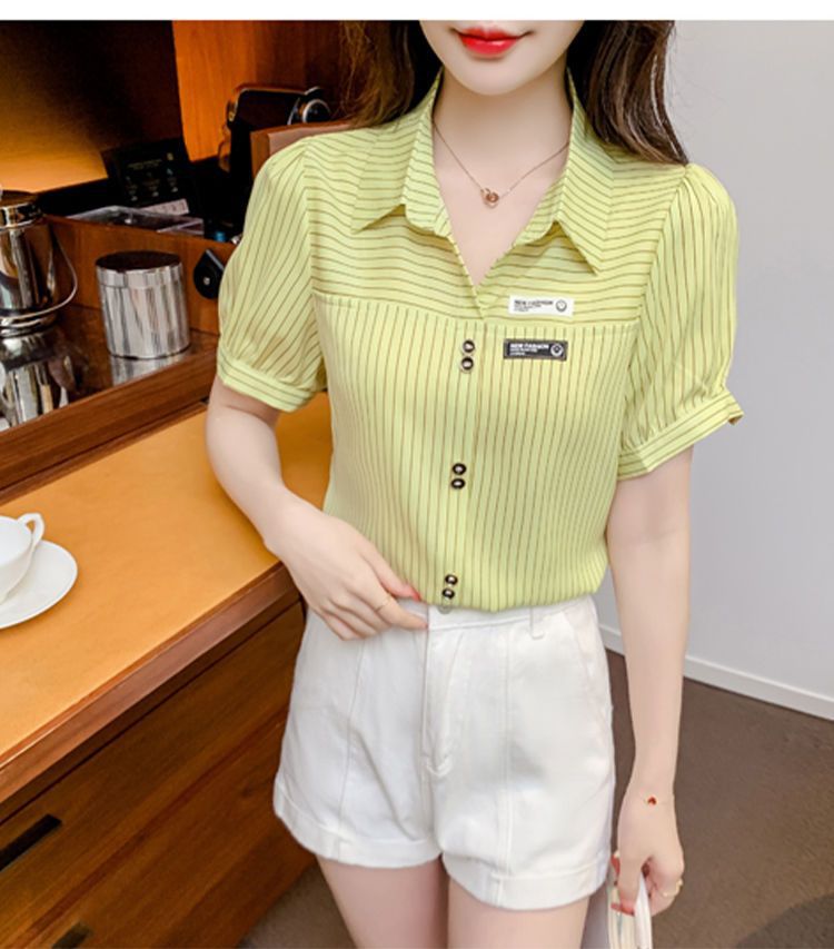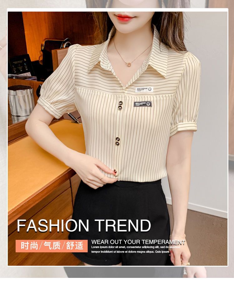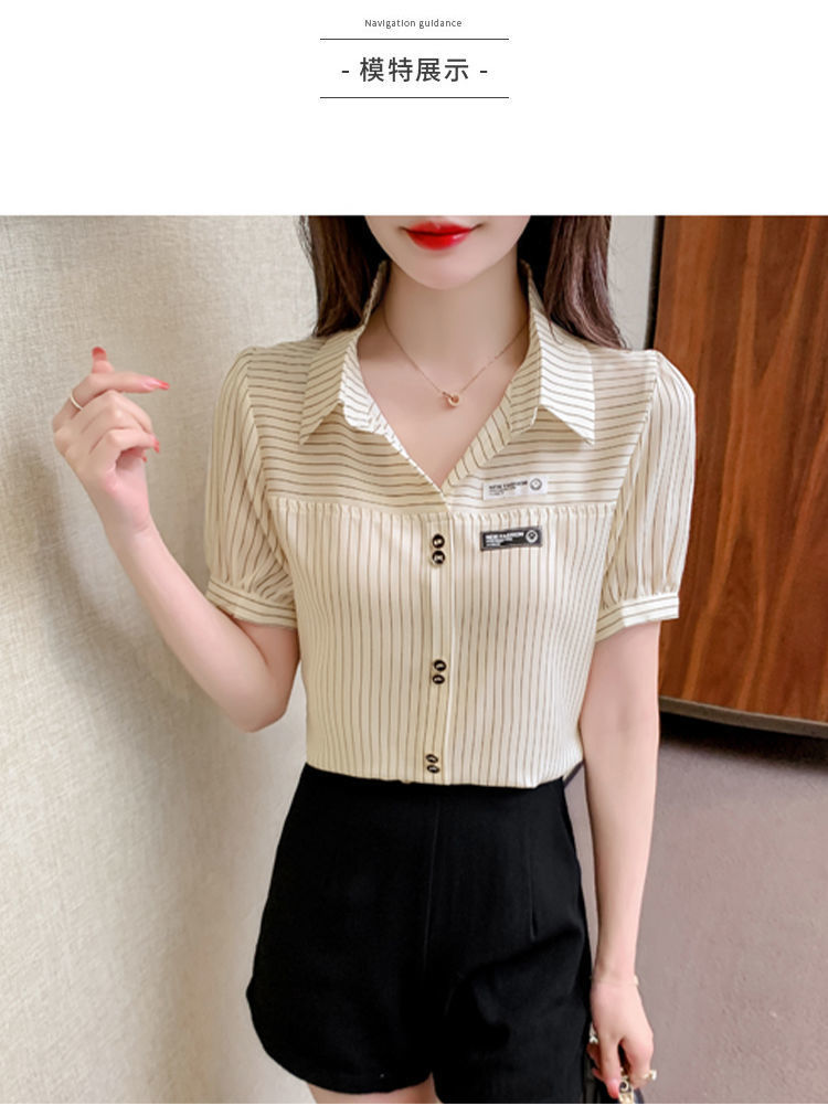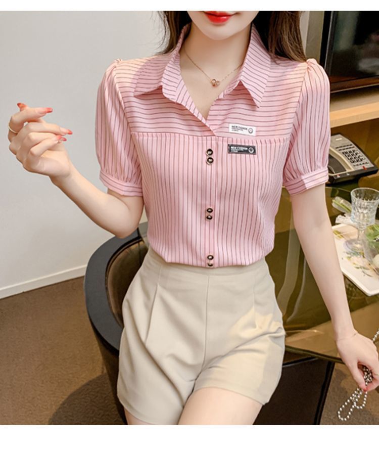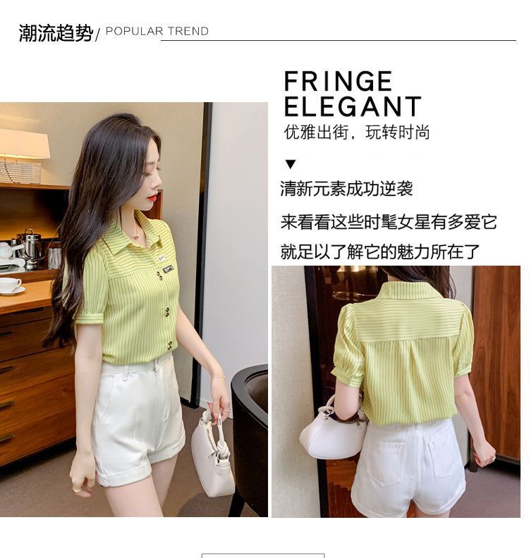 여름 새로운 디자인 감각 틈새 비즈니스 라이트 럭셔리 OL 셔츠 2024 여성을위한 스트라이프 풀오버 짧은 소매 비즈니스 착용 셔츠스토어 가기