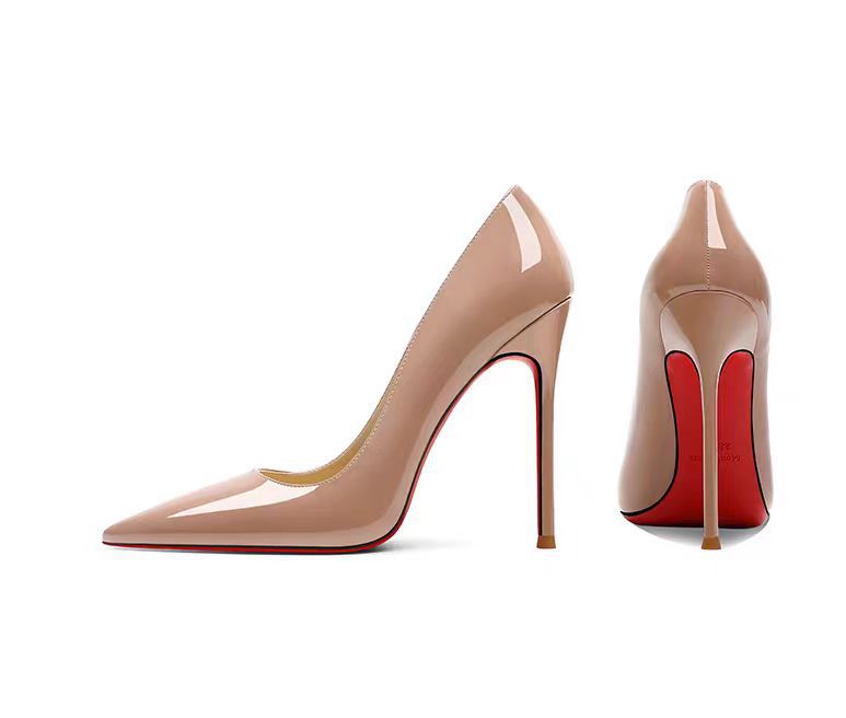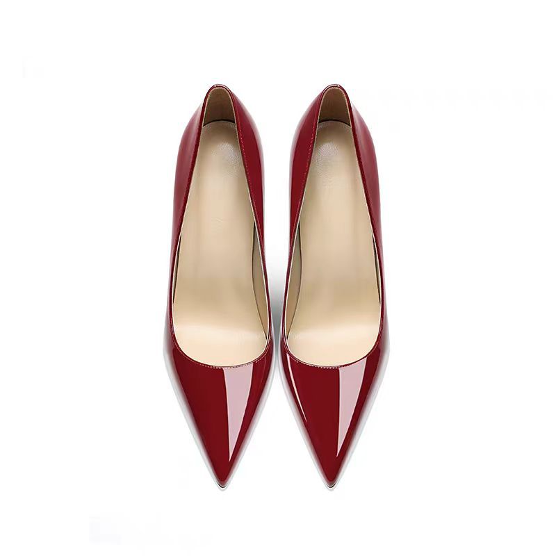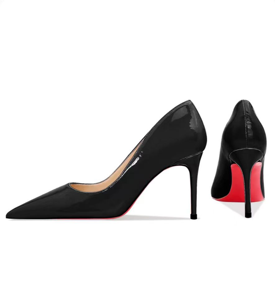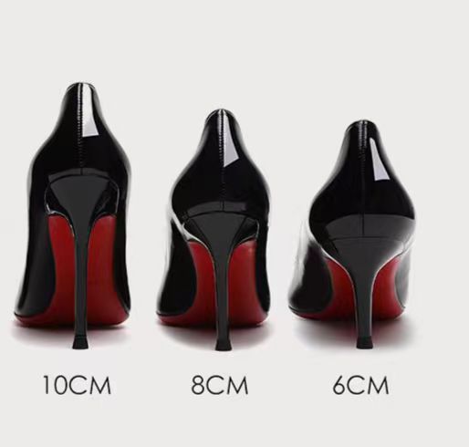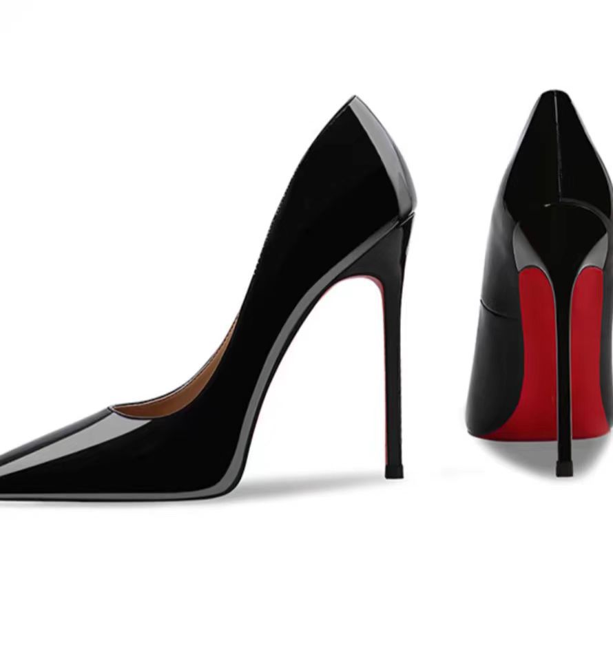 2023 봄과 가을 새로운 특허 가죽 블랙 스틸레토 힐 뾰족한 슈퍼 하이힐 여성 전문 섹시한 야간 교대 빨간색 바닥 신발스토어 가기