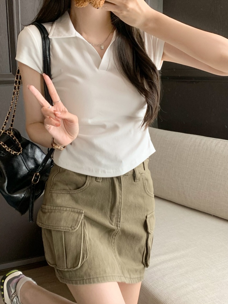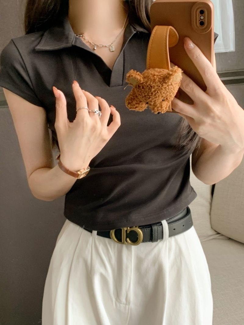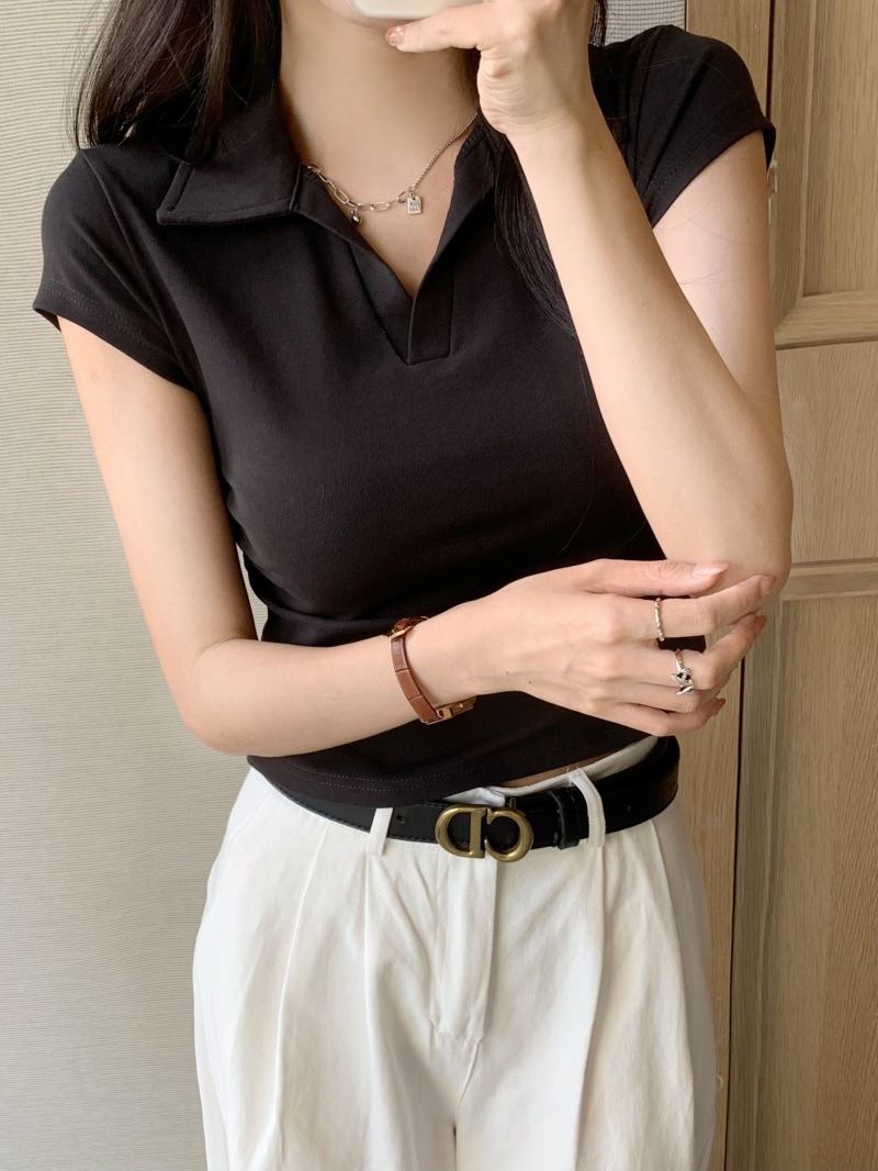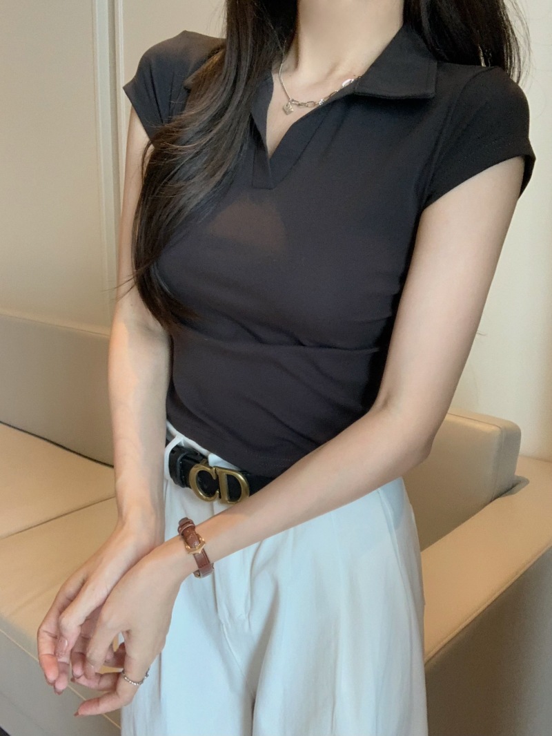 대외 무역 TikTok 배달 여름 순수한면 폴로 칼라 타이트 허리 슬림 디자인 센스 여성용 반팔 티셔츠 바닥 탑스토어 가기