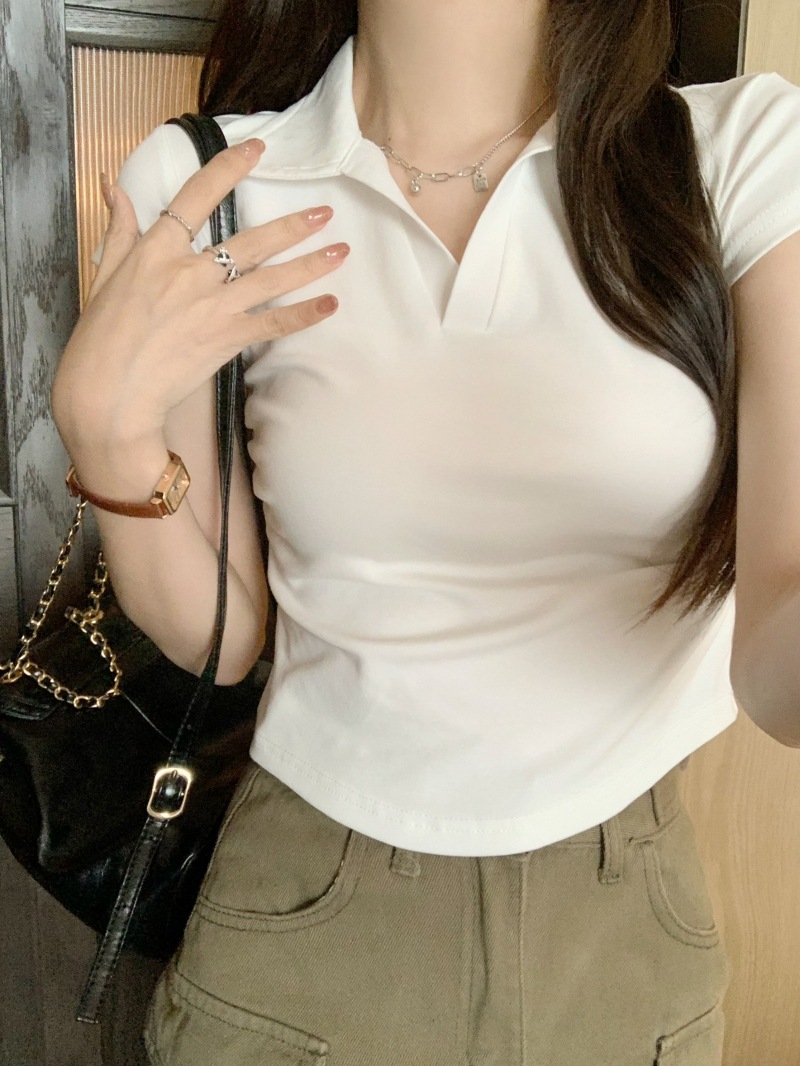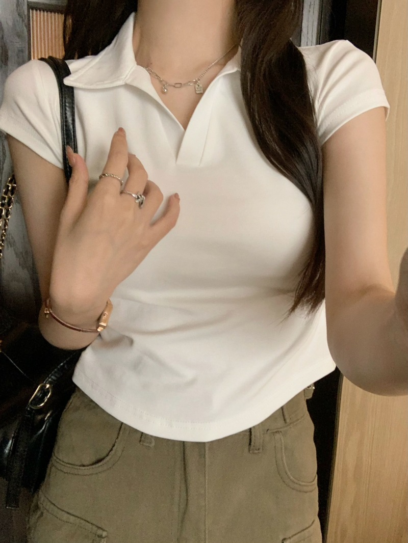 대외 무역 TikTok 배달 여름 순수한면 폴로 칼라 타이트 허리 슬림 디자인 센스 여성용 반팔 티셔츠 바닥 탑