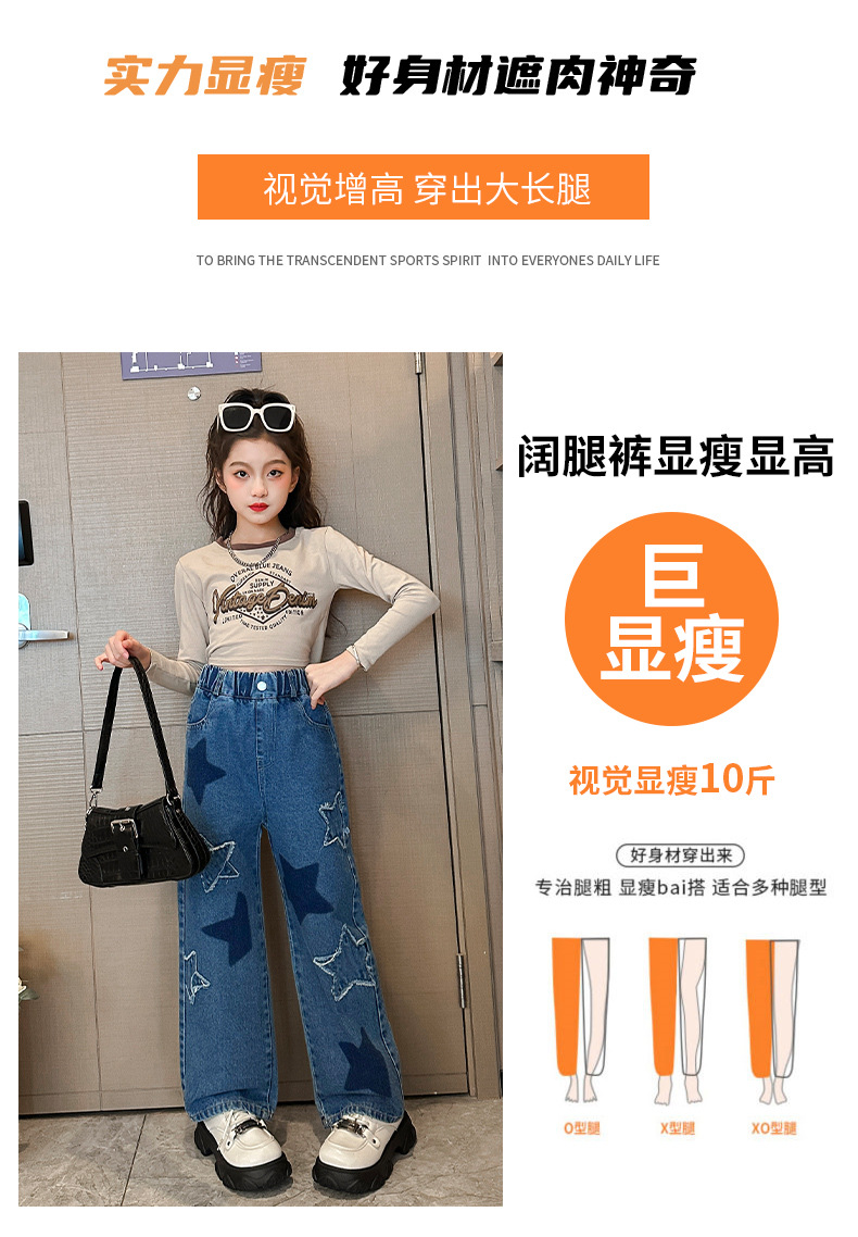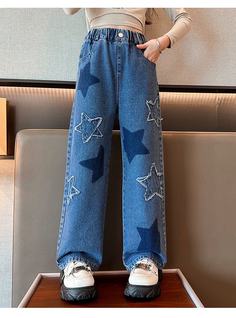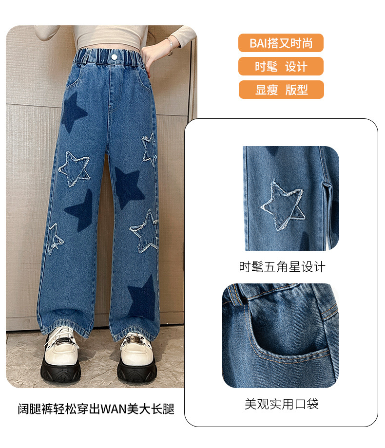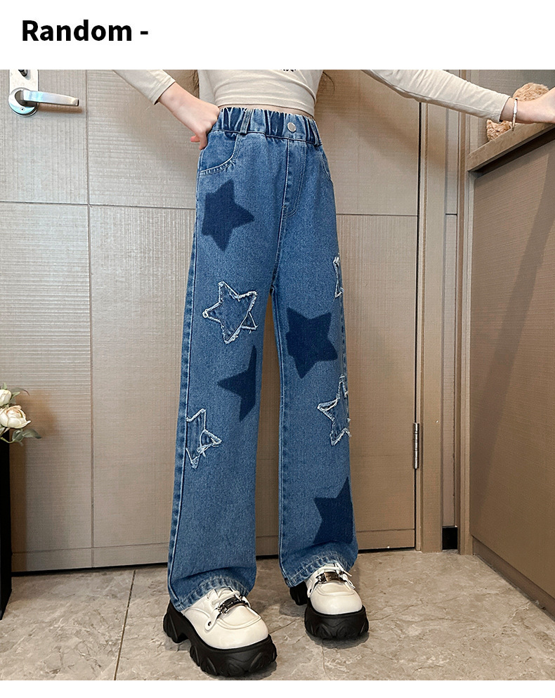 소녀 데님 넓은 다리 바지 봄과 가을 의류 2024 새로운 중형 및 대형 어린이 한국 스타일 유행 패치 긴 바지 인터넷 유명 인사