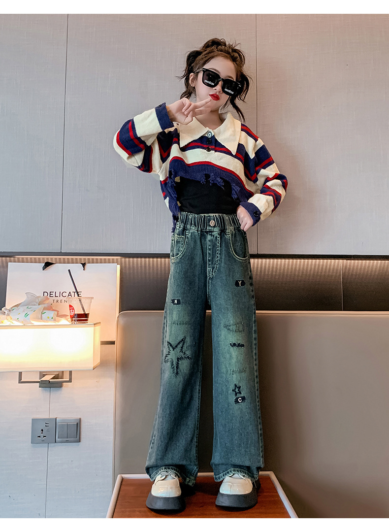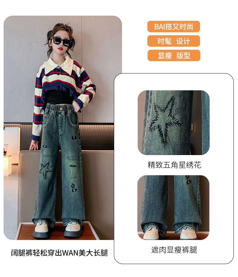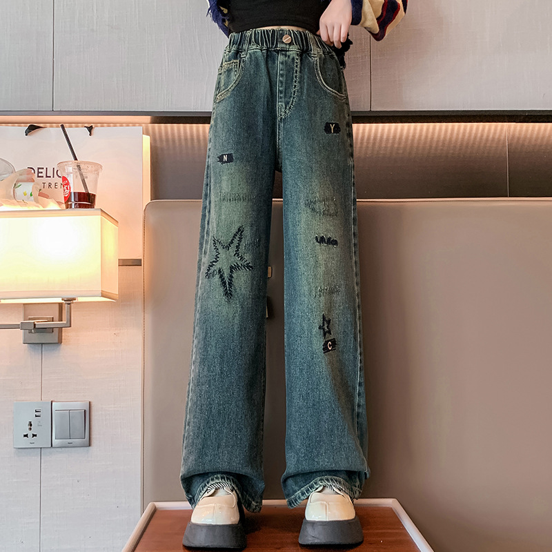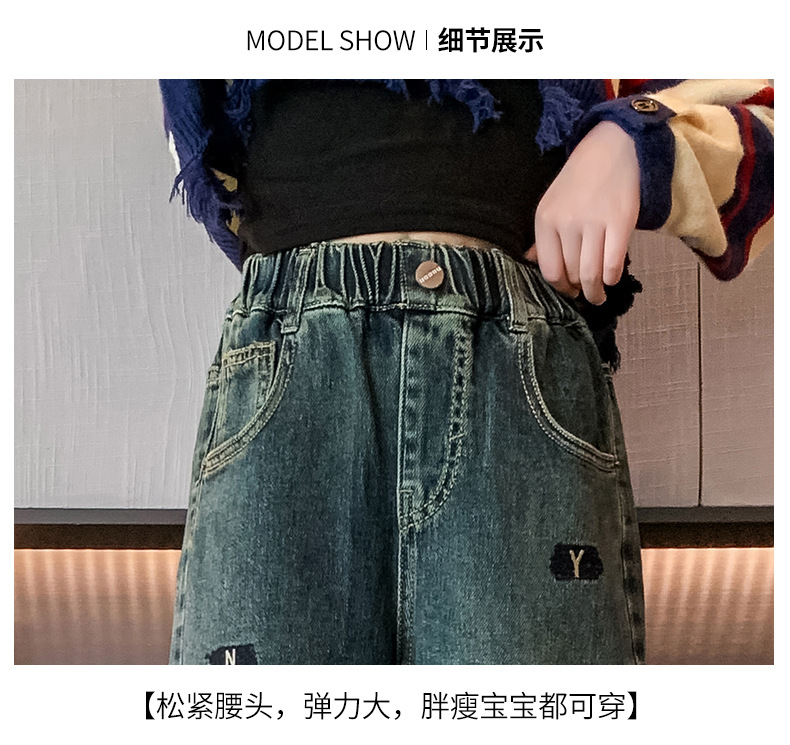 2024 봄과 가을 새 소녀 수 놓은 청바지 중 · 대형 어린이 한국 스타일 유행 바지 외부 착용 원피스 배달