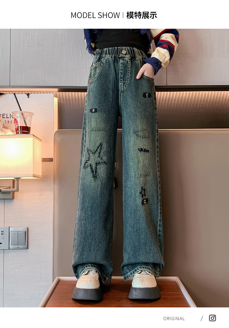 2024 봄과 가을 새 소녀 수 놓은 청바지 중 · 대형 어린이 한국 스타일 유행 바지 외부 착용 원피스 배달스토어 가기