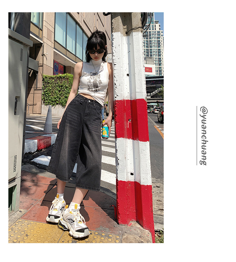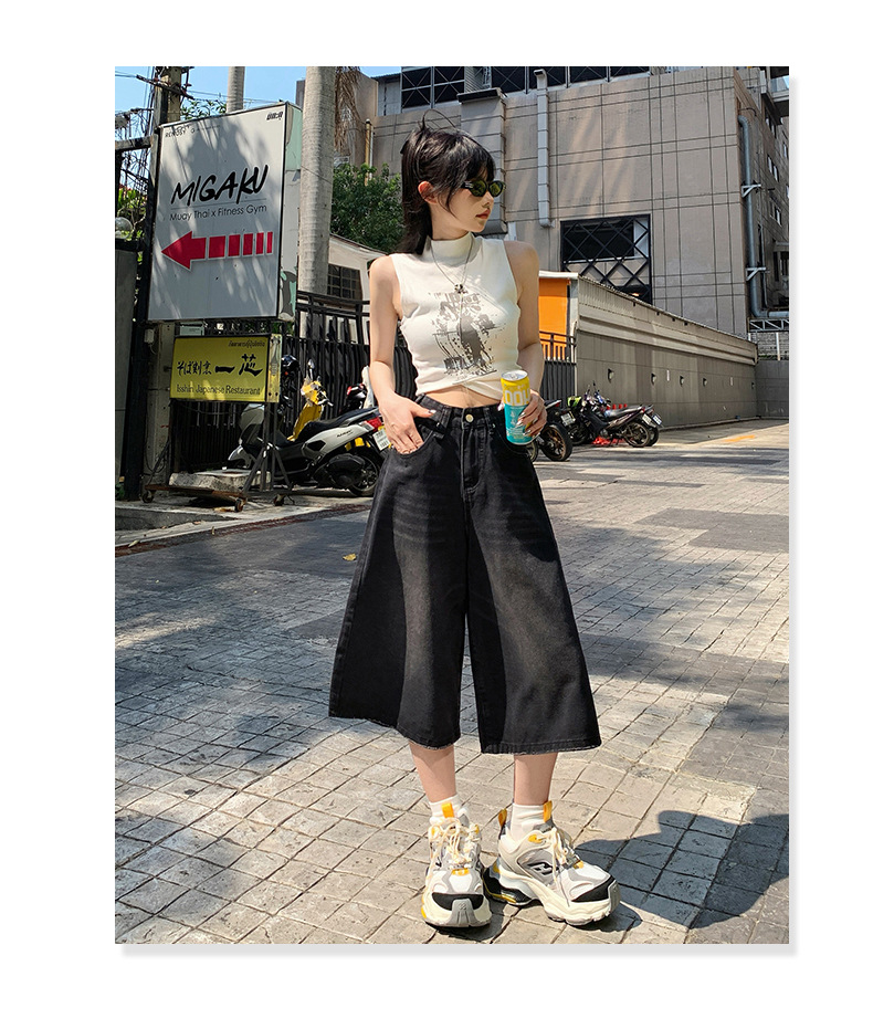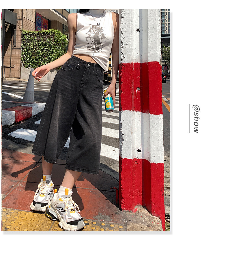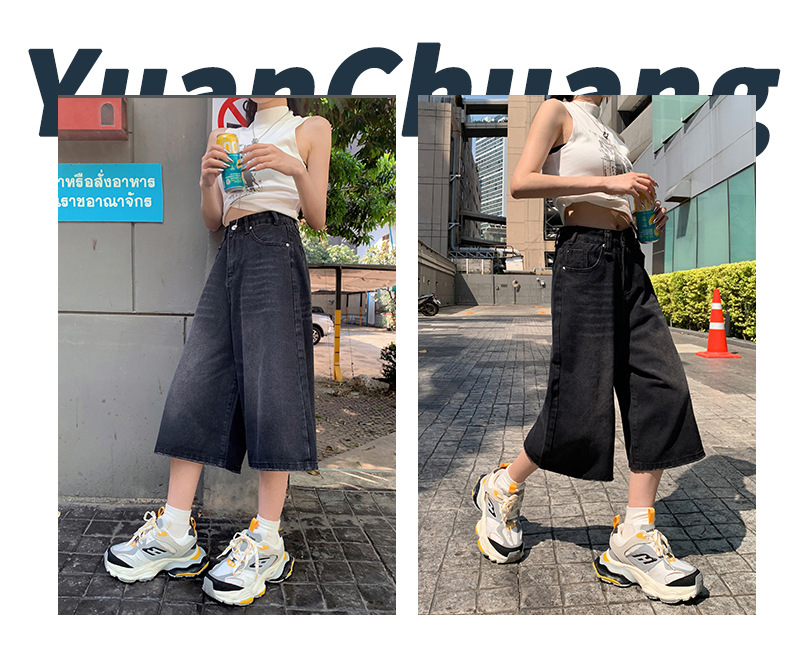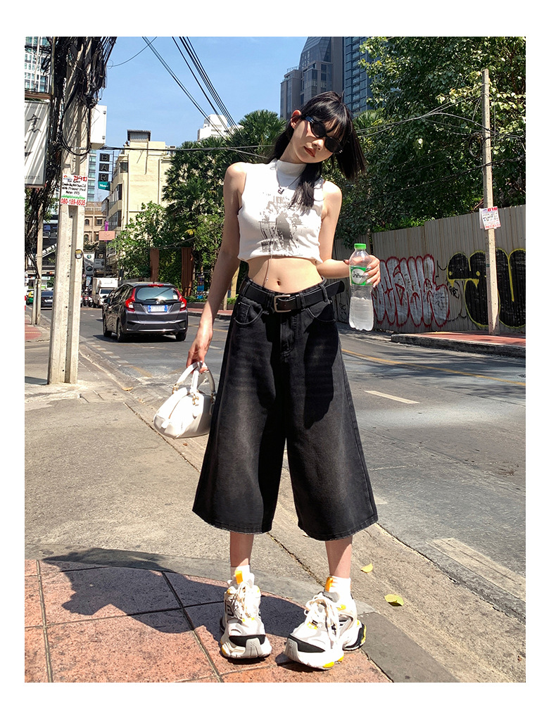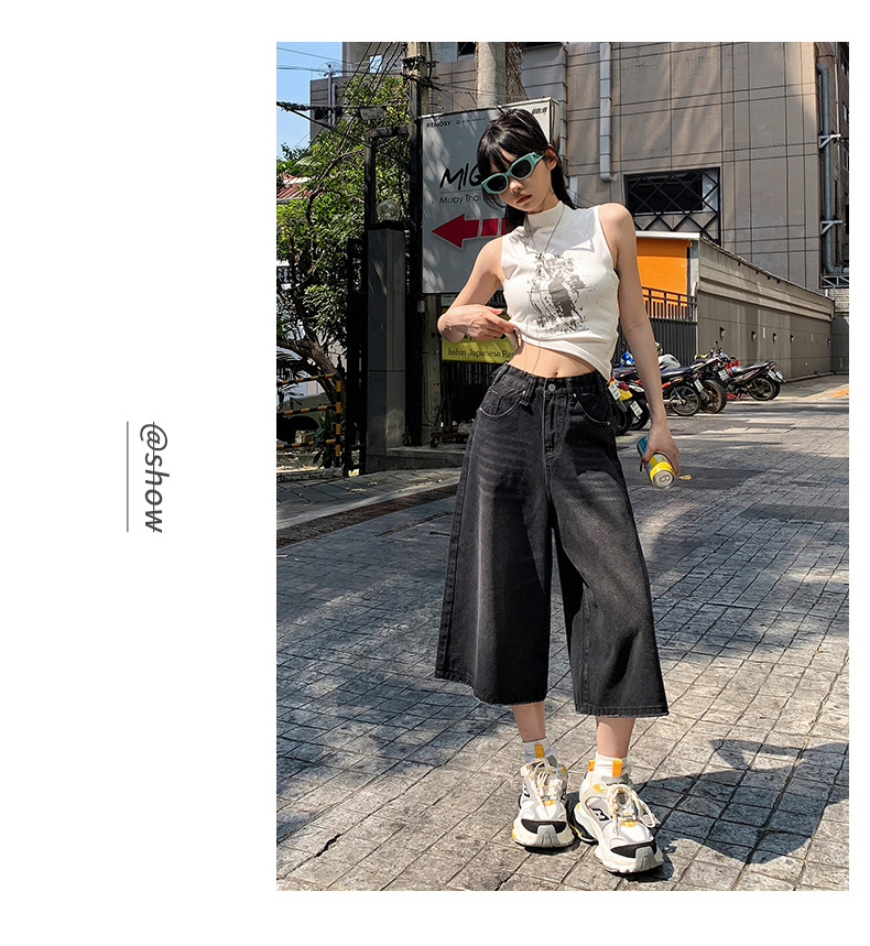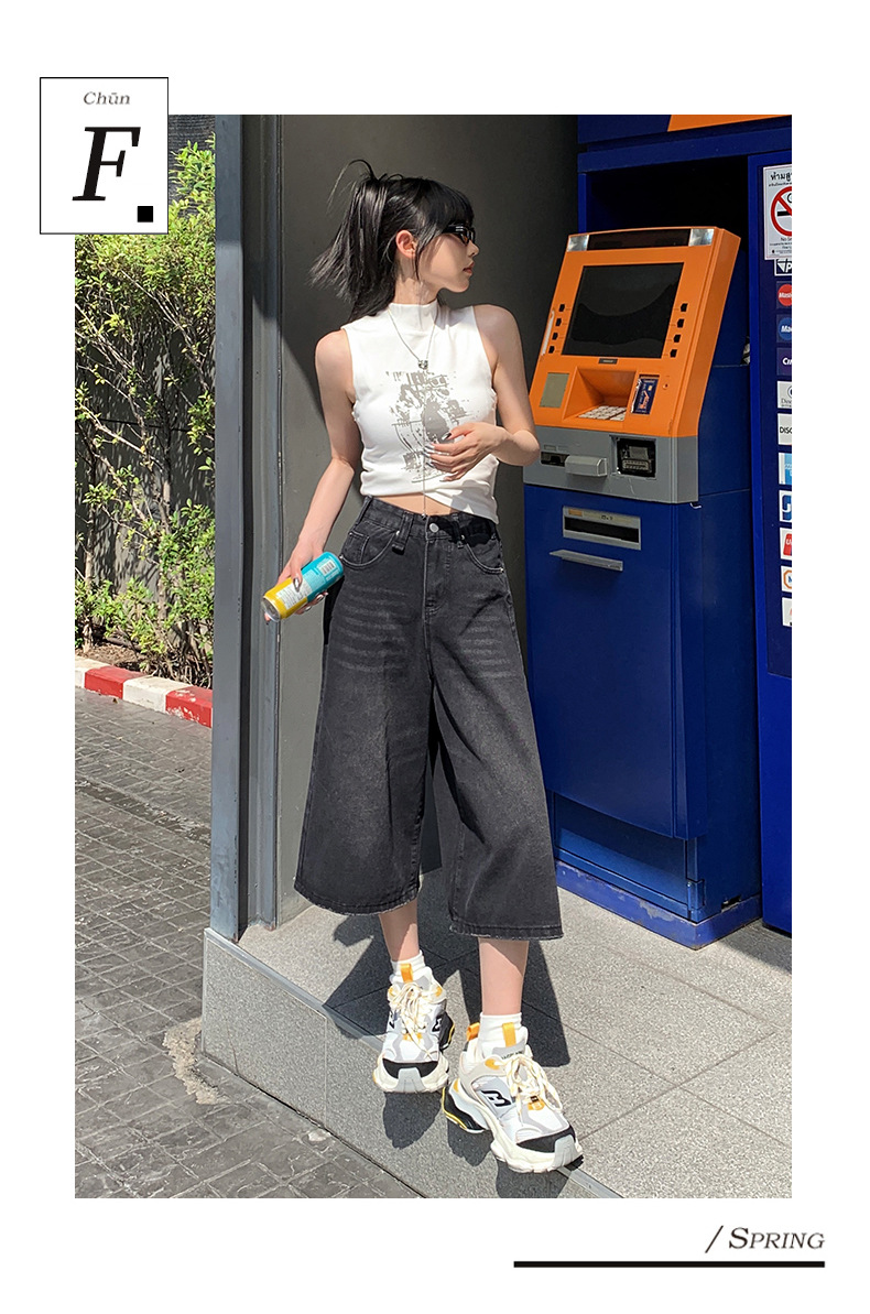 오렌지 실크 여성 의류 # 미국 거리 복고풍, 검은 회색 넓은 다리 자른 바지 여름 하이 웨이스트 하이 스트리트 청바지 여성스토어 가기