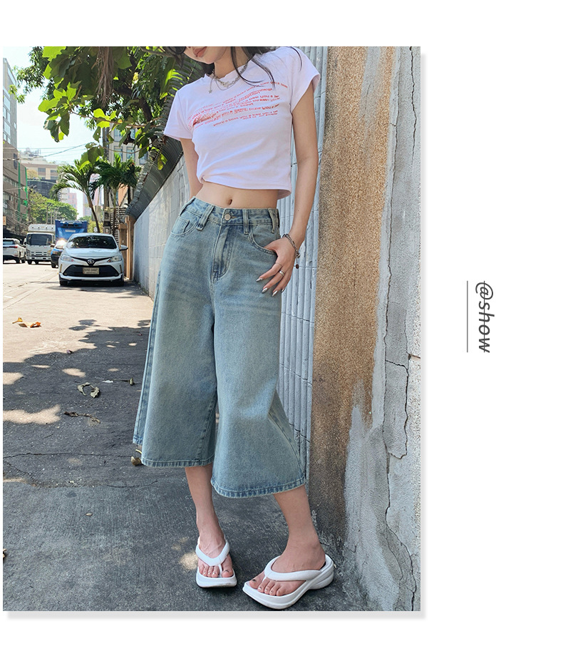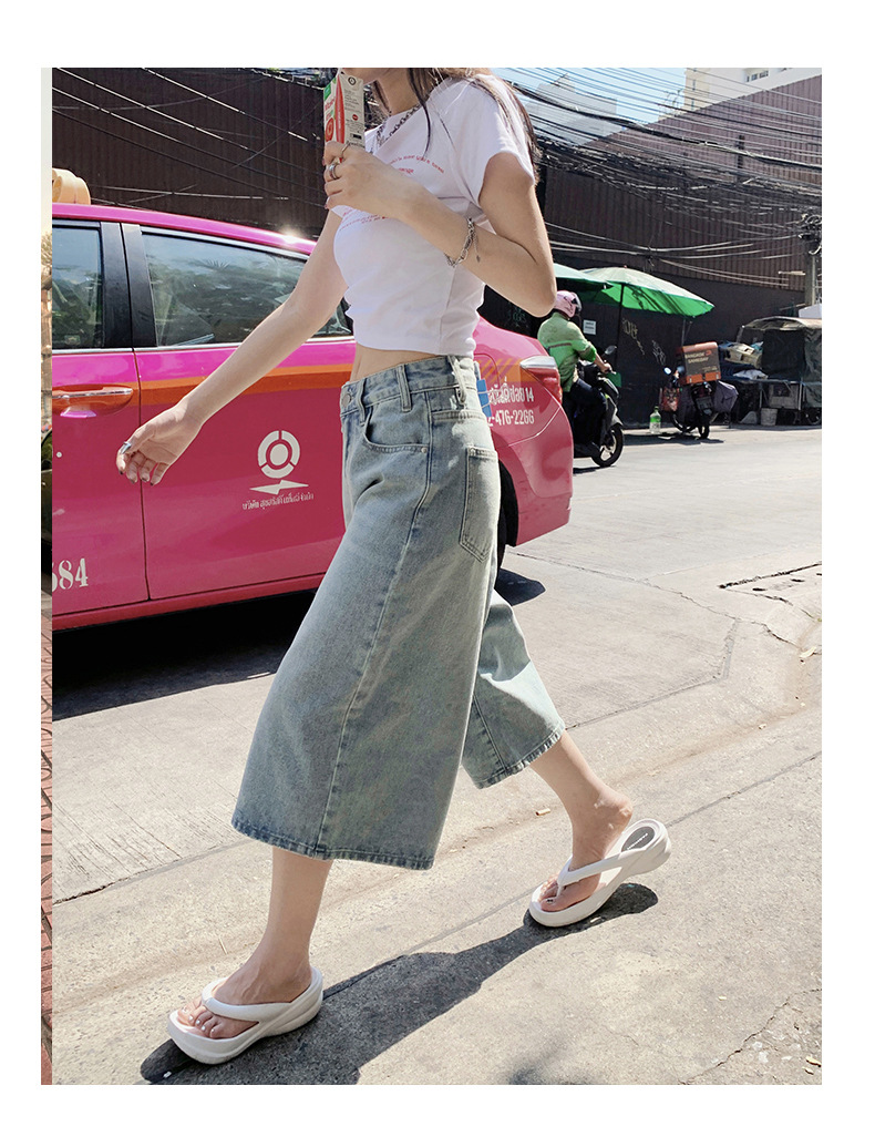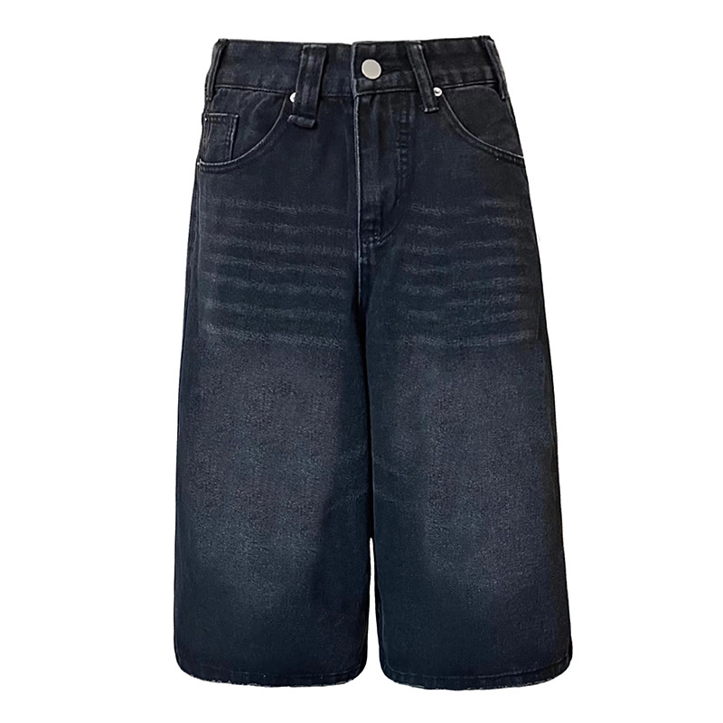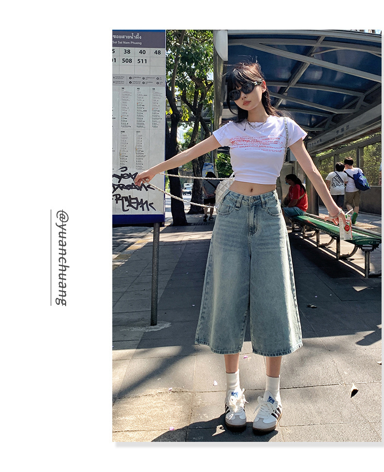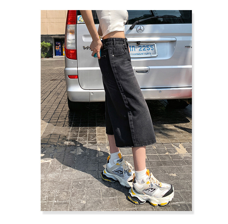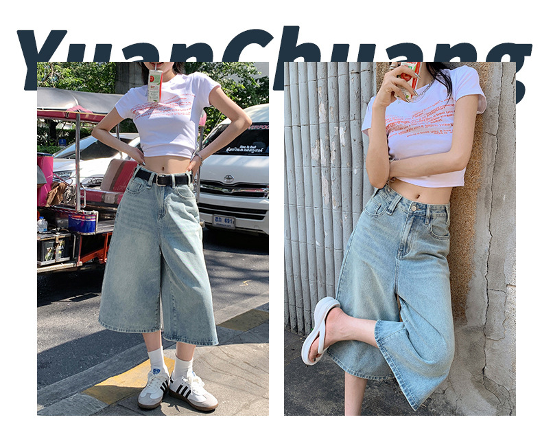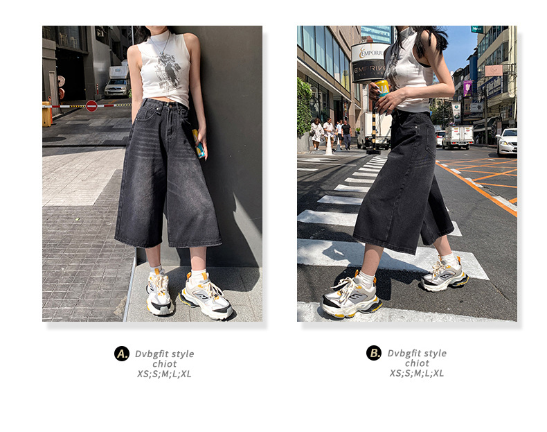 오렌지 실크 여성 의류 # 미국 거리 복고풍, 검은 회색 넓은 다리 자른 바지 여름 하이 웨이스트 하이 스트리트 청바지 여성스토어 가기