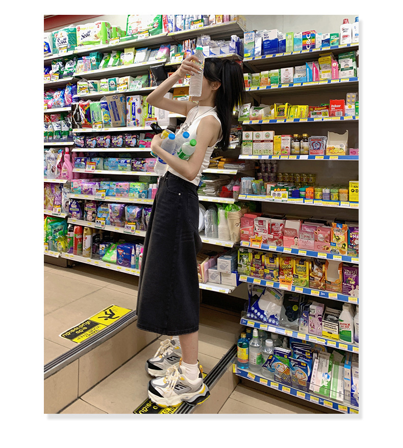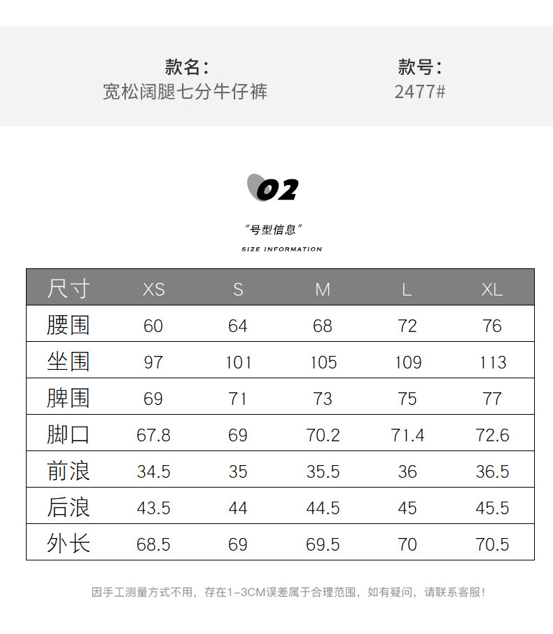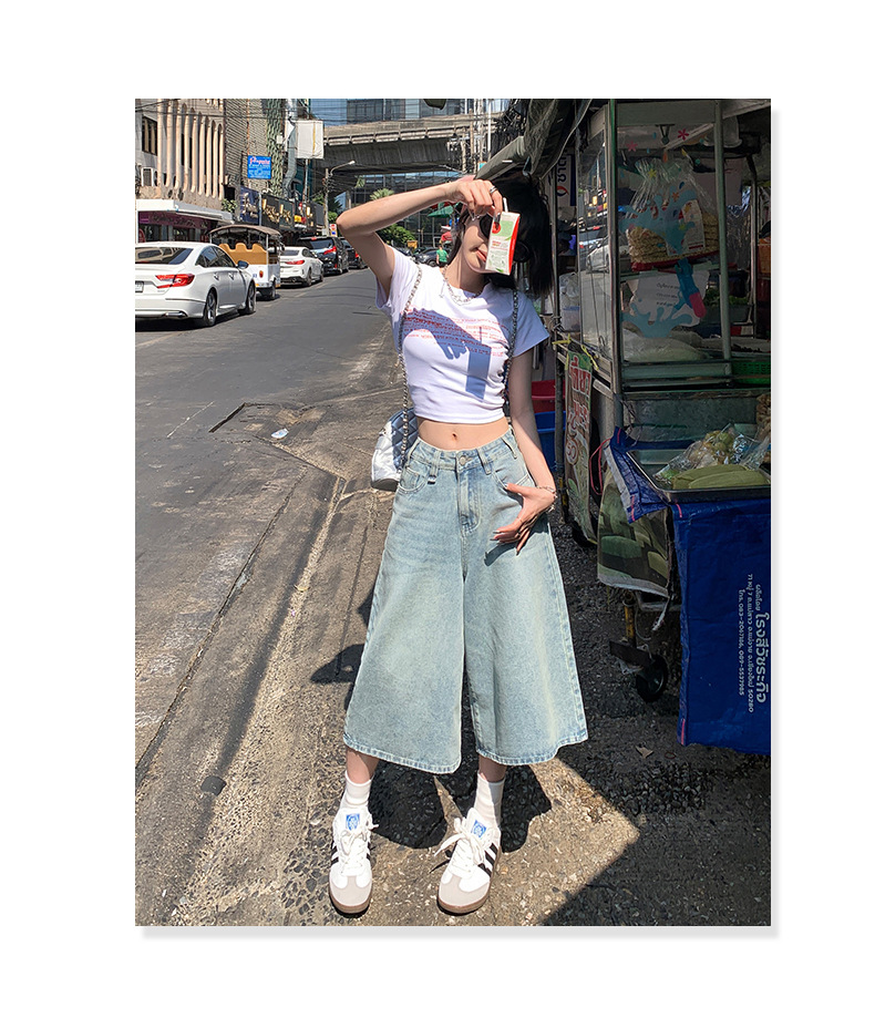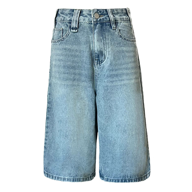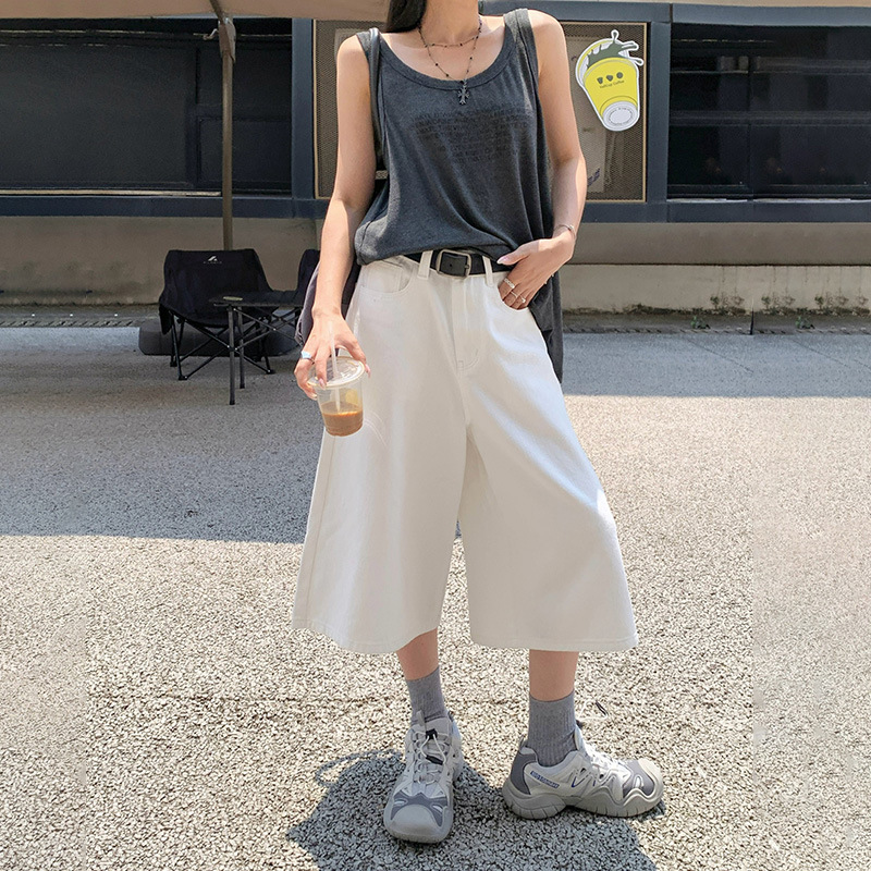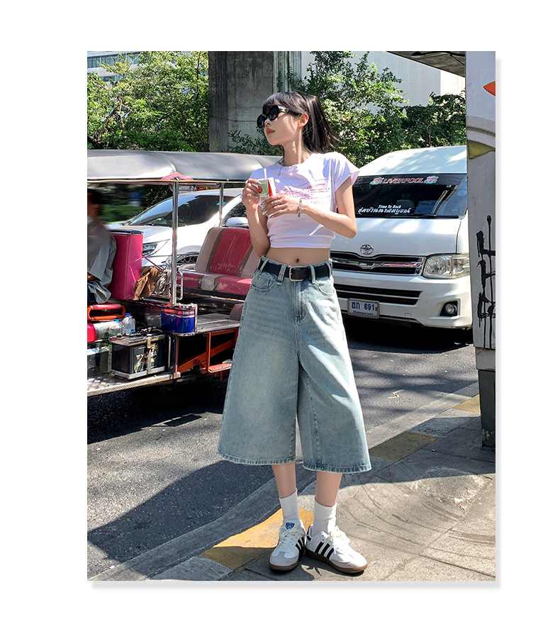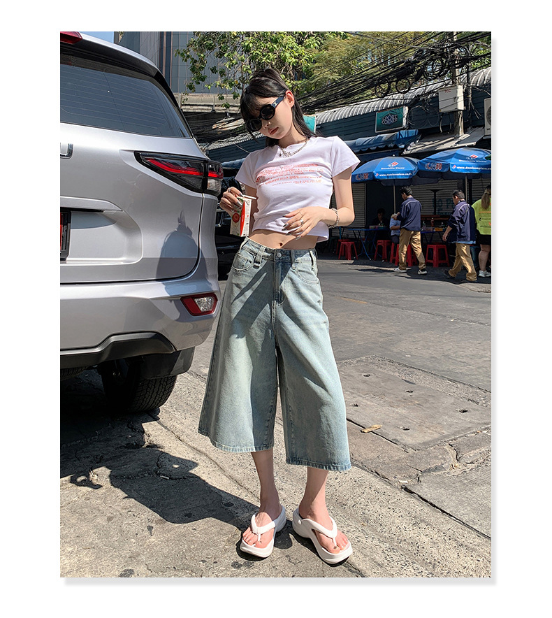 오렌지 실크 여성 의류 # 미국 거리 복고풍, 검은 회색 넓은 다리 자른 바지 여름 하이 웨이스트 하이 스트리트 청바지 여성스토어 가기