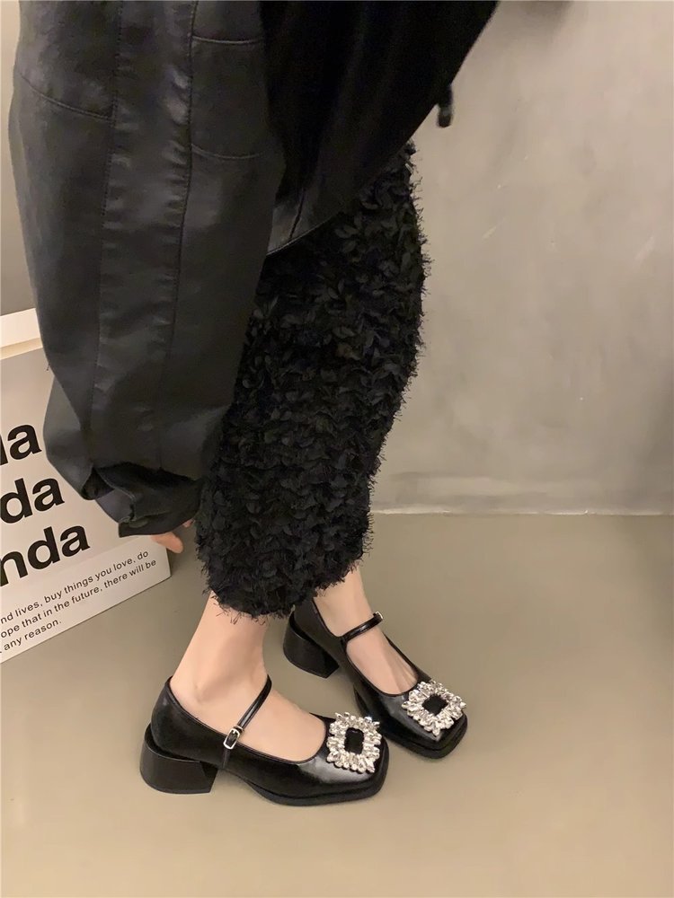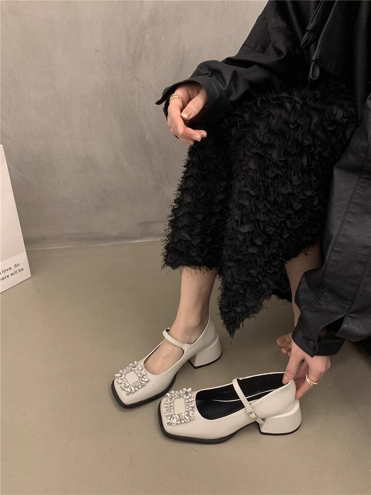 프랑스 스타일 복고풍 청키 힐 라인석 싱글 레이어 신발 여성 가을과 겨울 새로운 한국 스타일 우아한 이브닝 스타일 요정 하이힐 메리 제인 신발스토어 가기