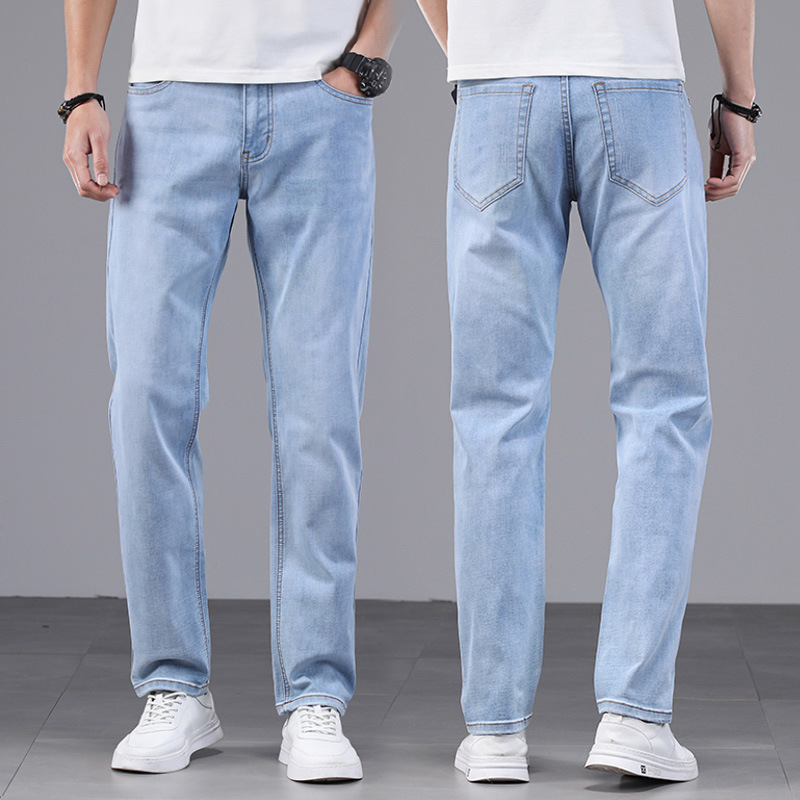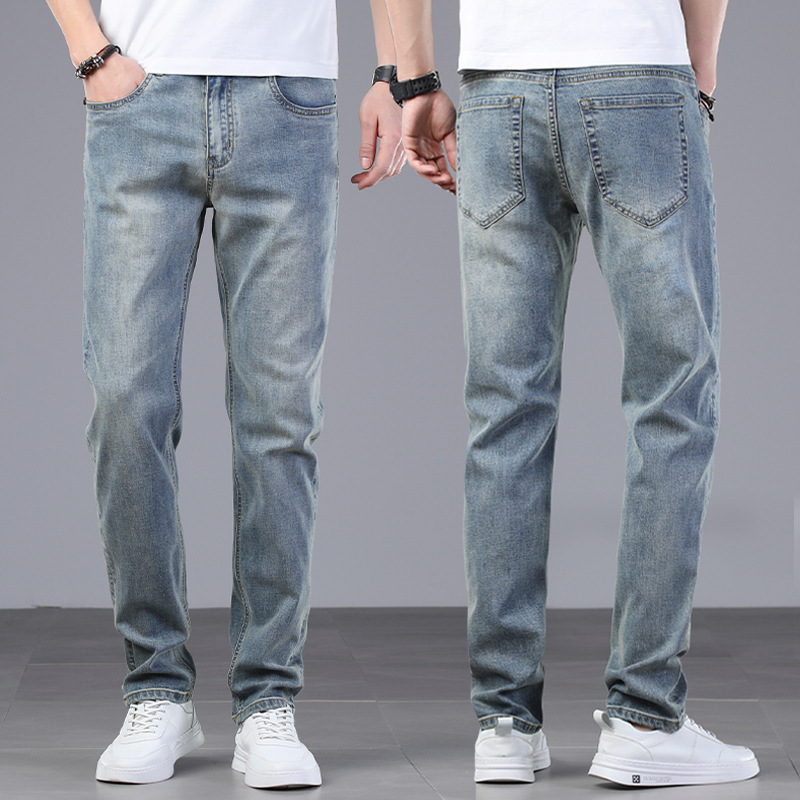 2025 봄 가을 홍콩 스타일 고급 가을 슬림핏 스트레이트 라이트 블루 데님 팬츠 남성 캐주얼 두꺼운 긴바지
