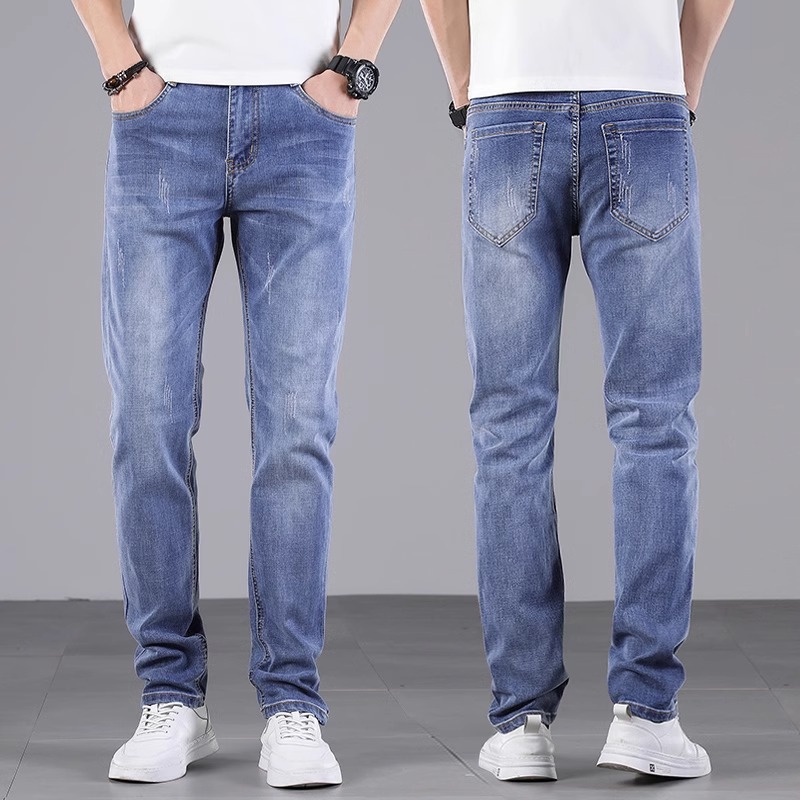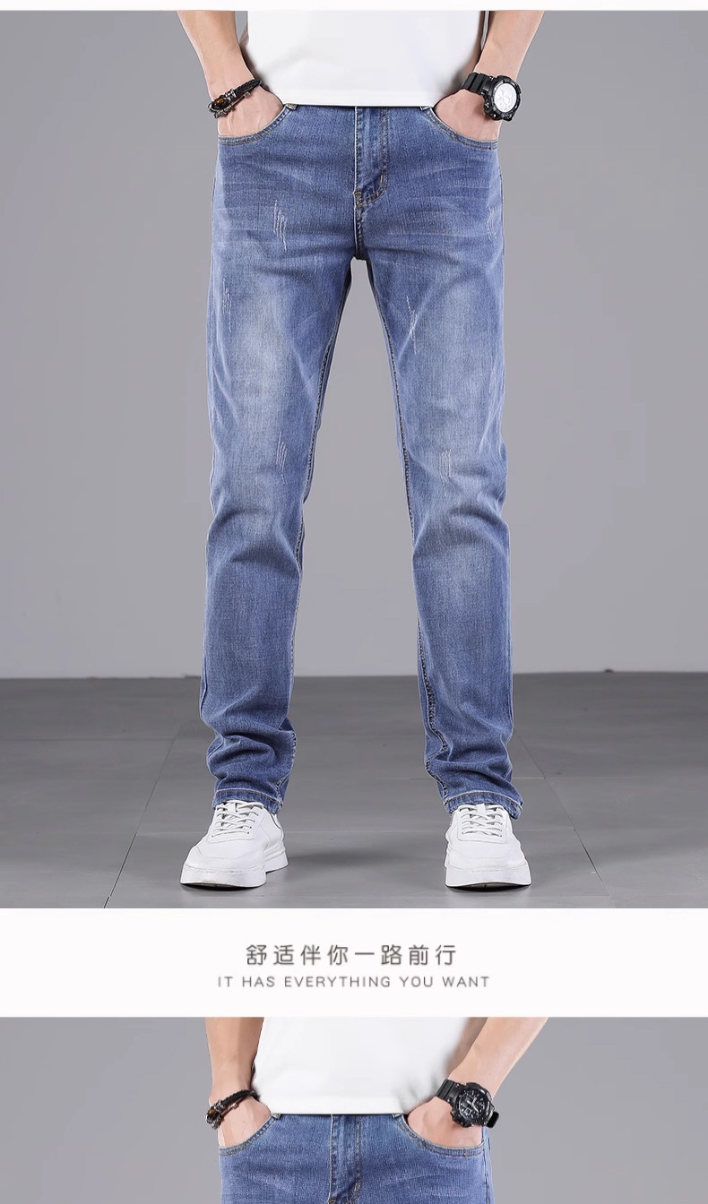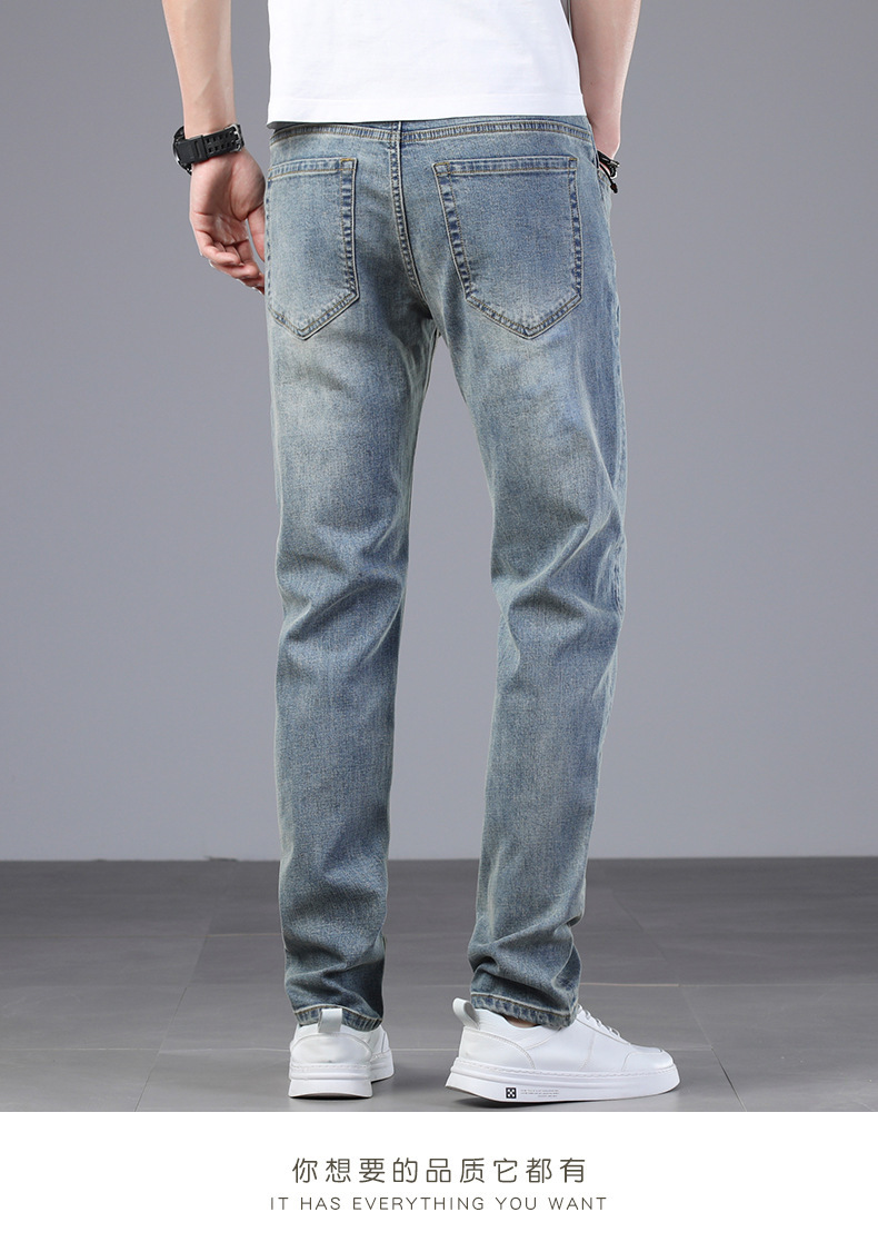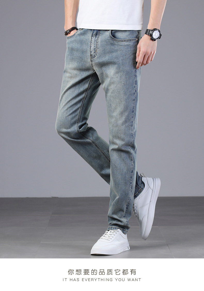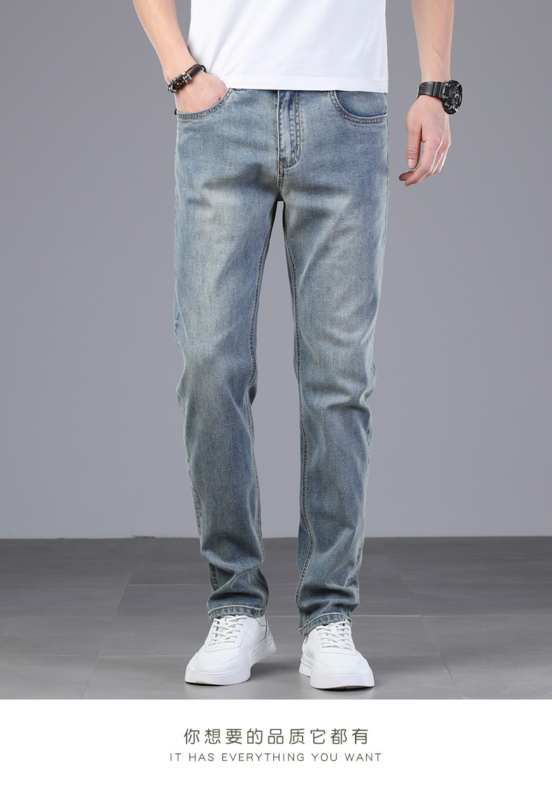 2025 봄 가을 홍콩 스타일 고급 가을 슬림핏 스트레이트 라이트 블루 데님 팬츠 남성 캐주얼 두꺼운 긴바지스토어 가기