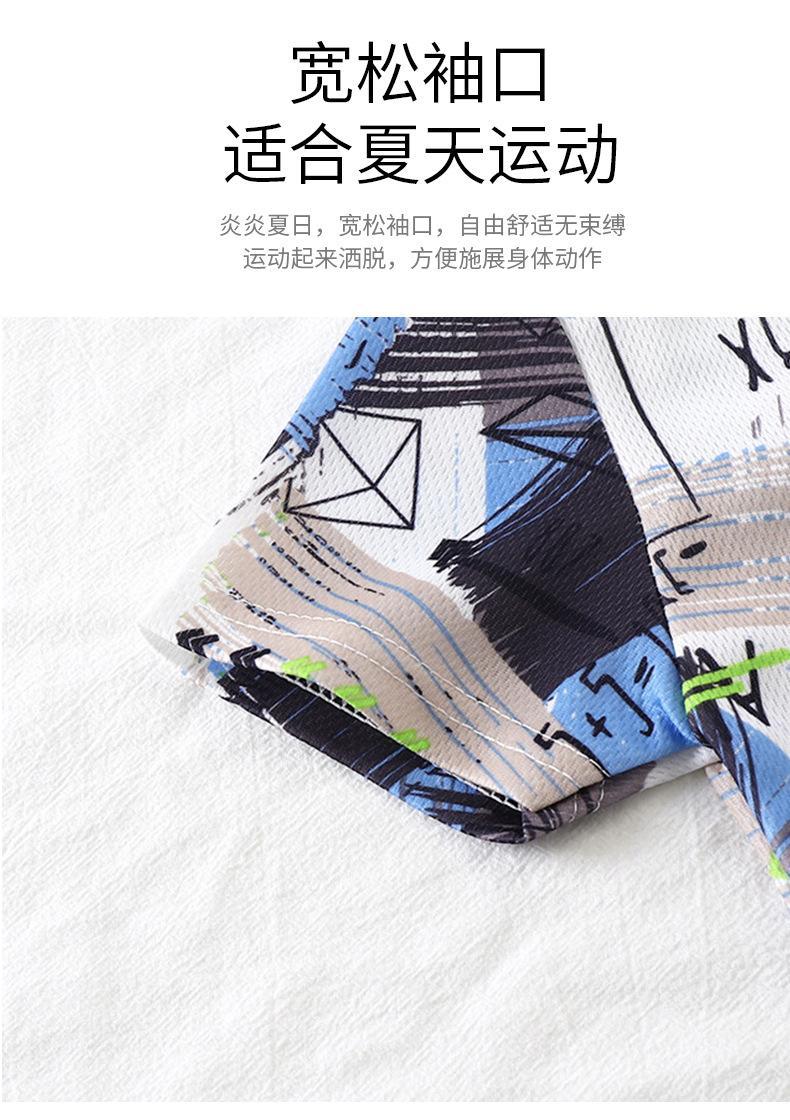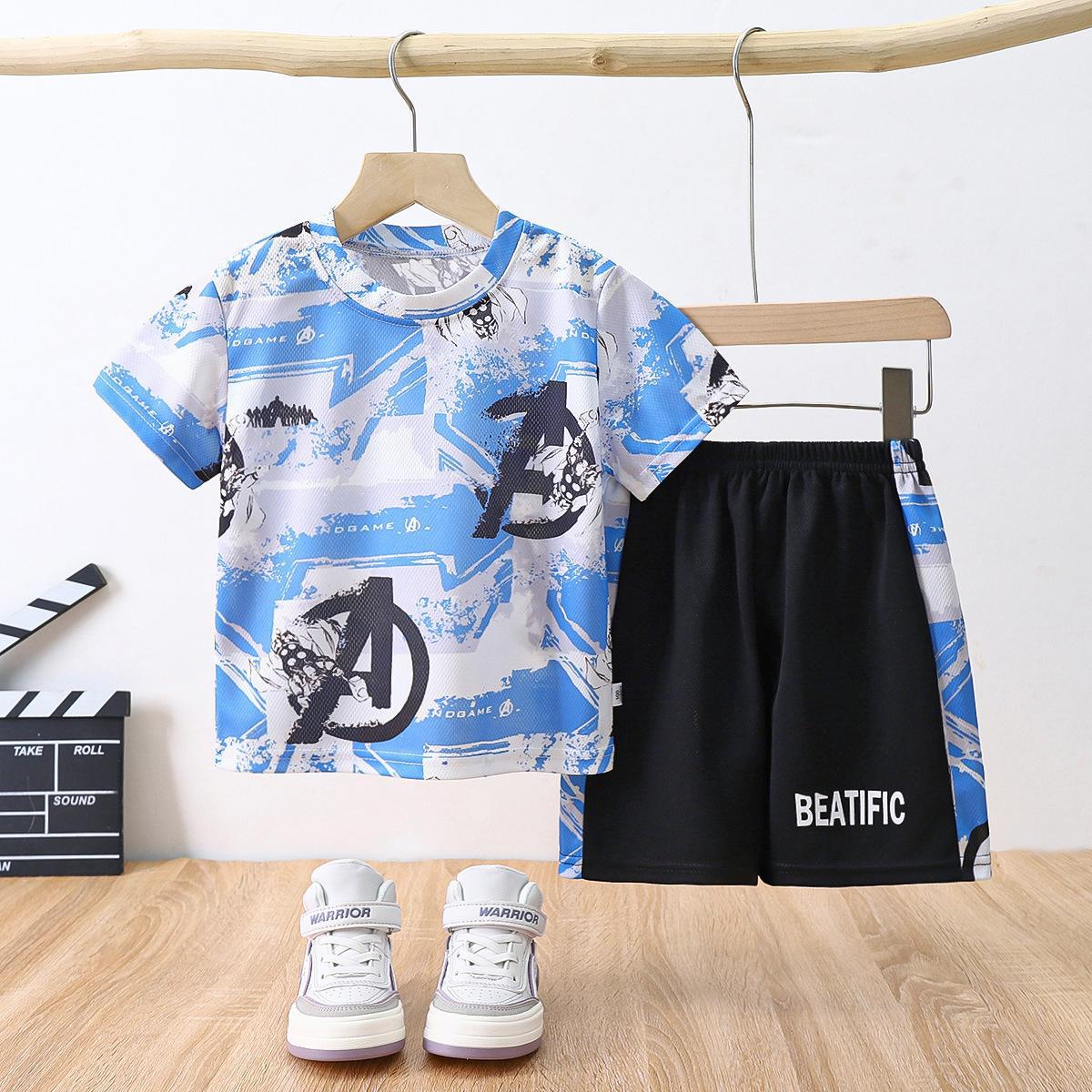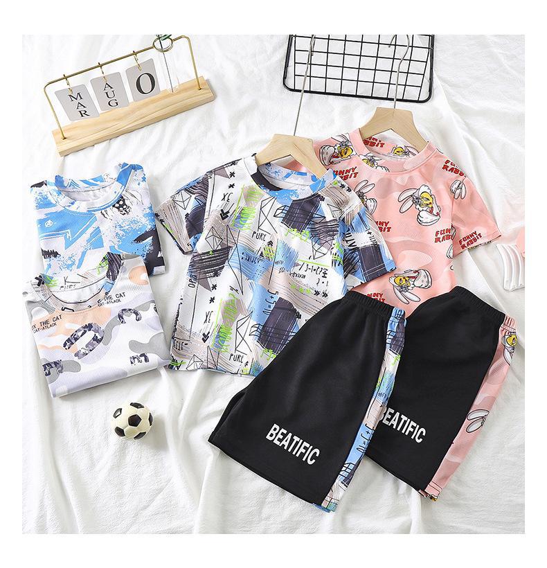 2025 새로운 여름 어린이 반팔 양복 속건성 운동복 아기 소년 위장 티셔츠 소녀 투피스 세트