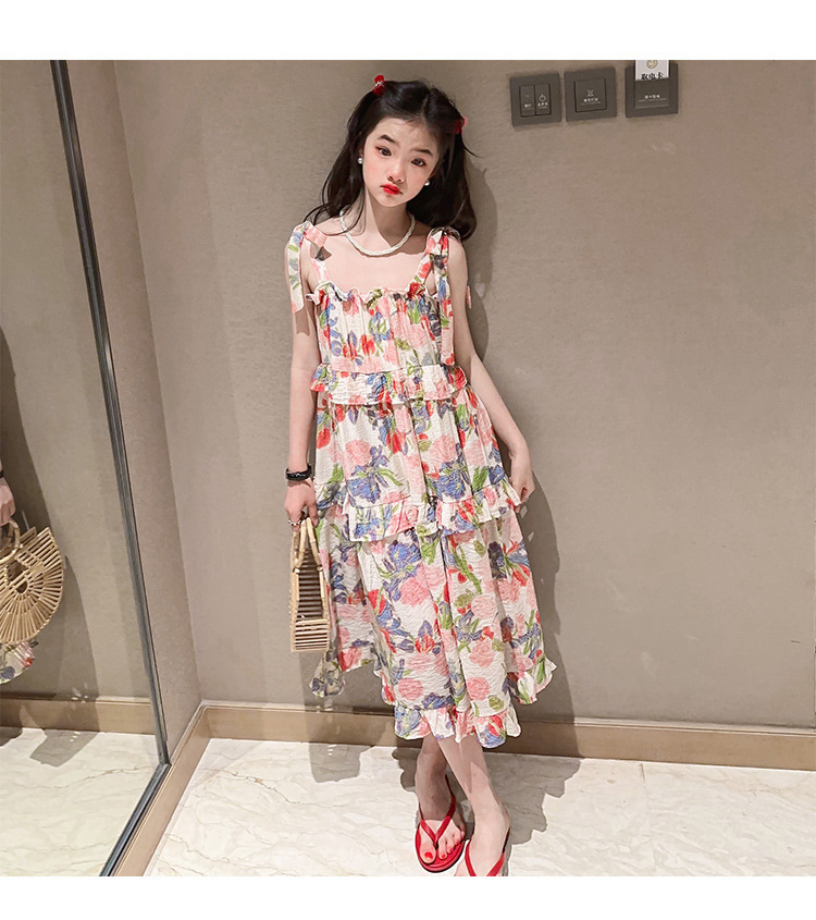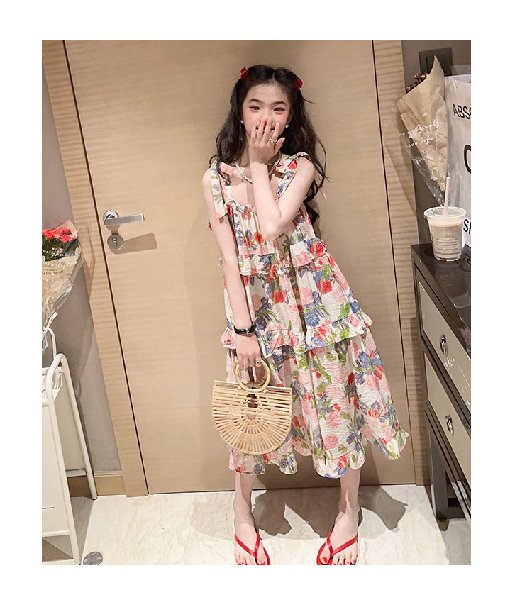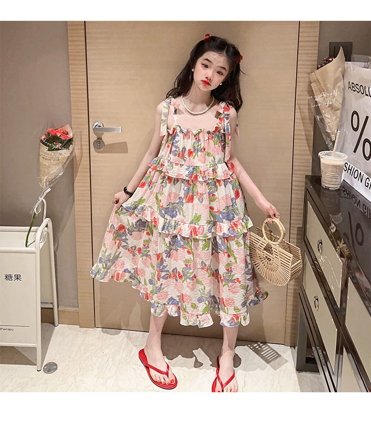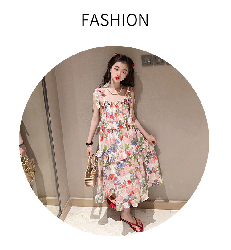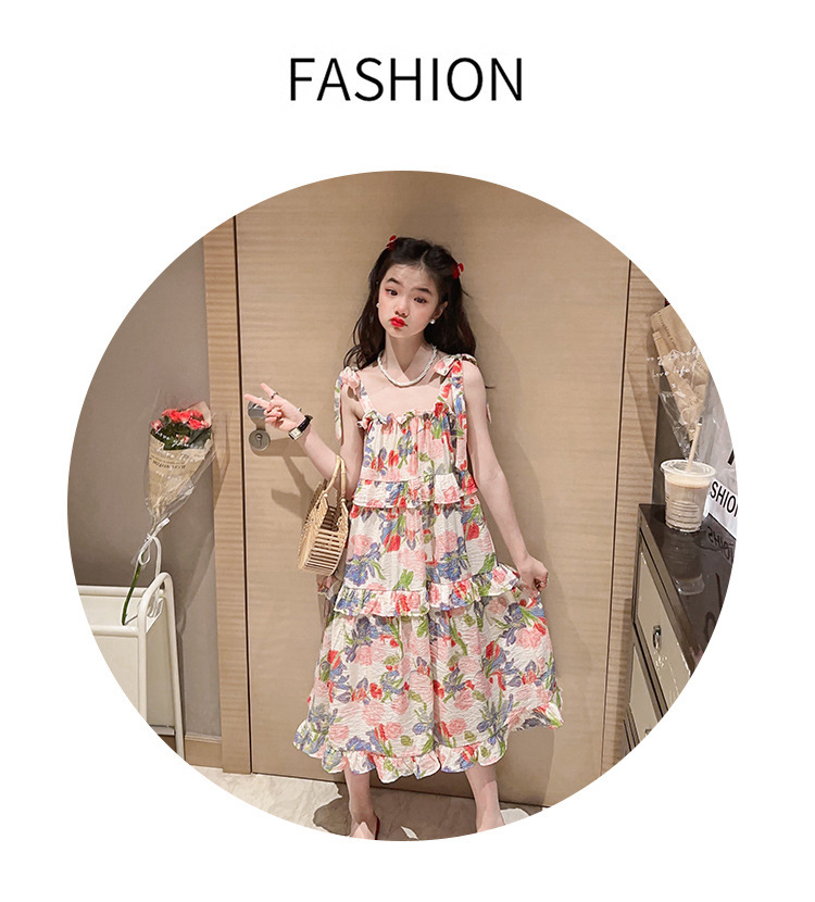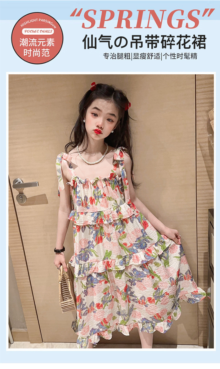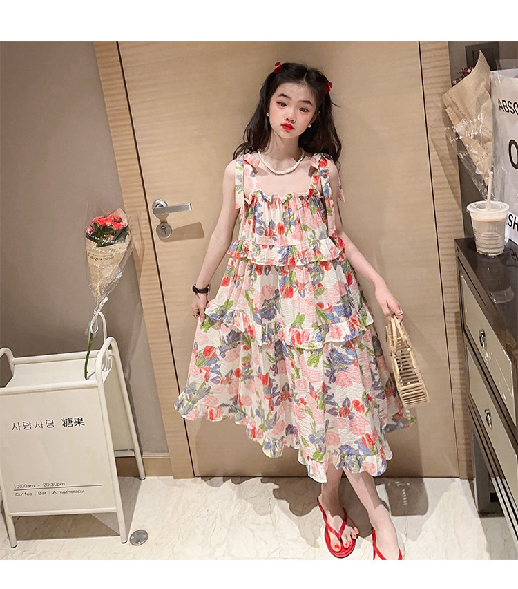 여아용 멜빵 원피스 여름 2024 신상 아동 쉬폰 원피스 세련된 꽃무늬 민소매 비치 원피스 드레스 공주풍스토어 가기