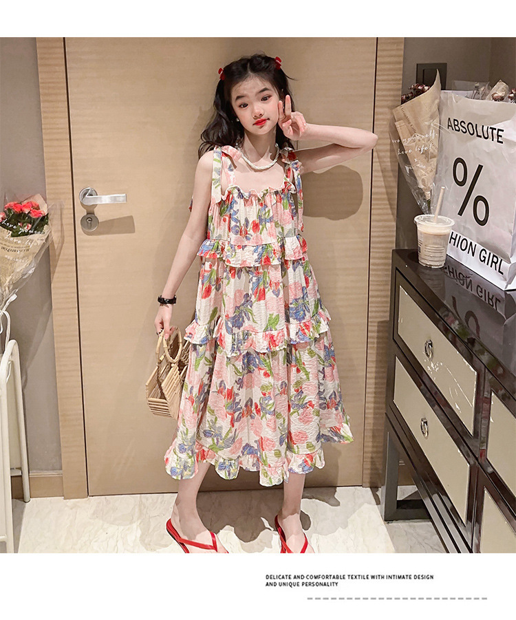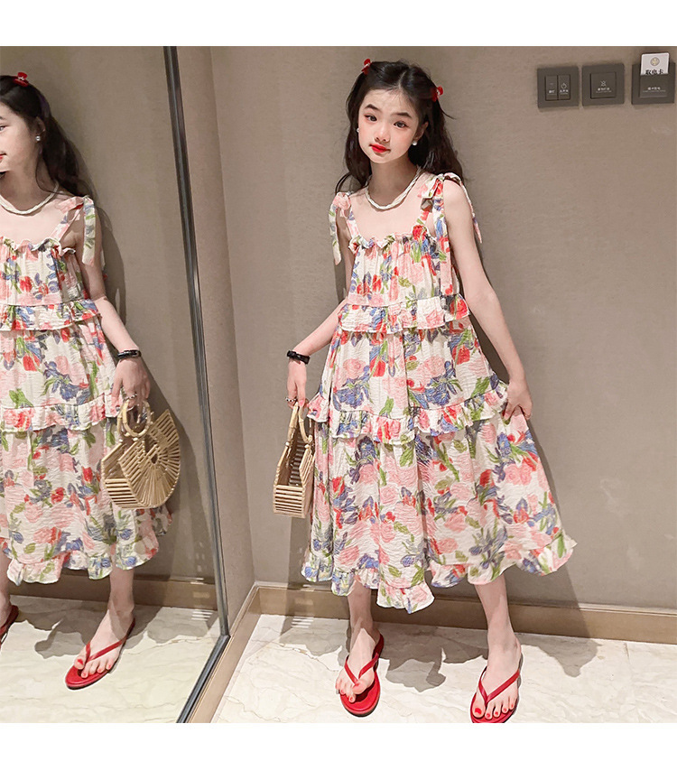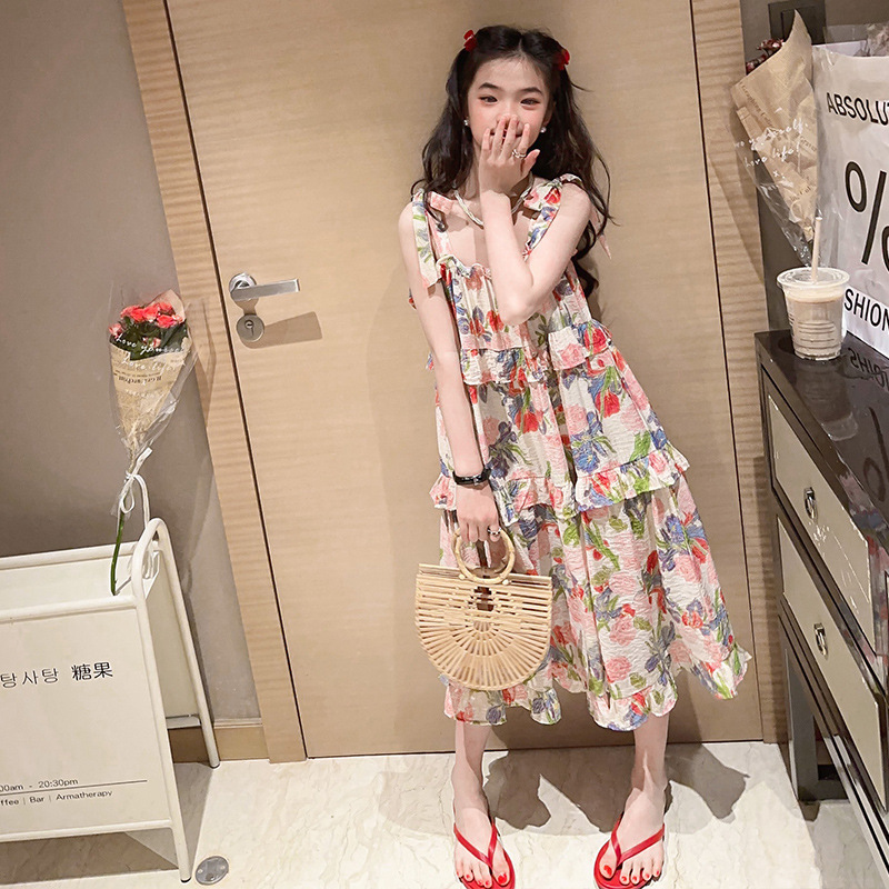 여아용 멜빵 원피스 여름 2024 신상 아동 쉬폰 원피스 세련된 꽃무늬 민소매 비치 원피스 드레스 공주풍