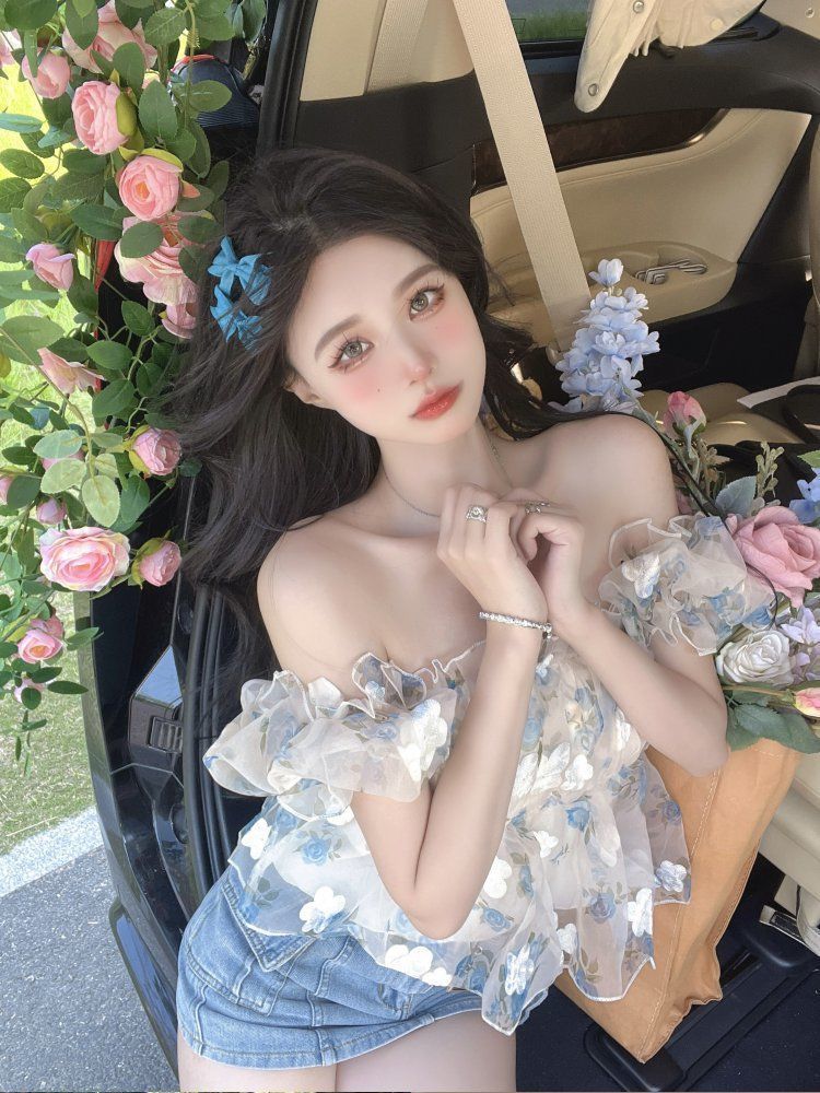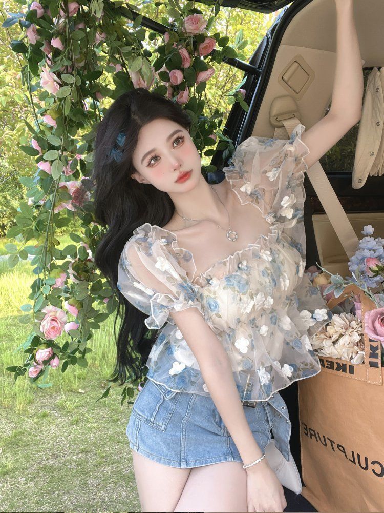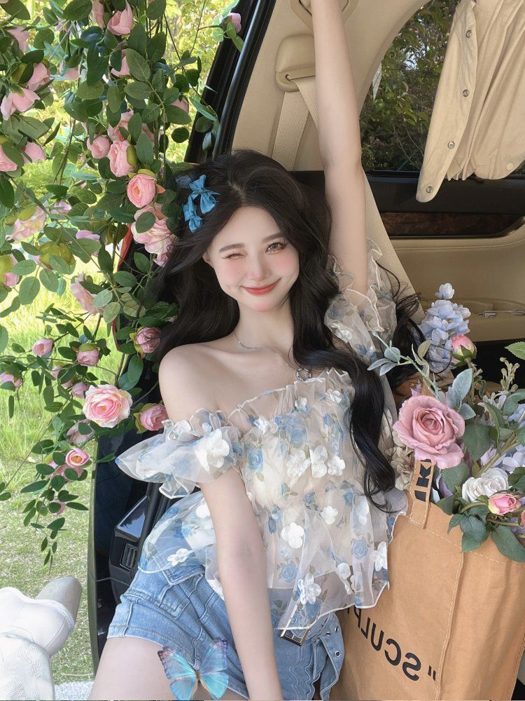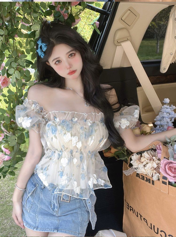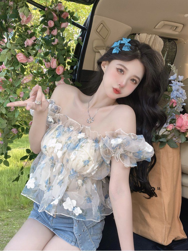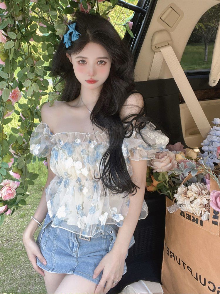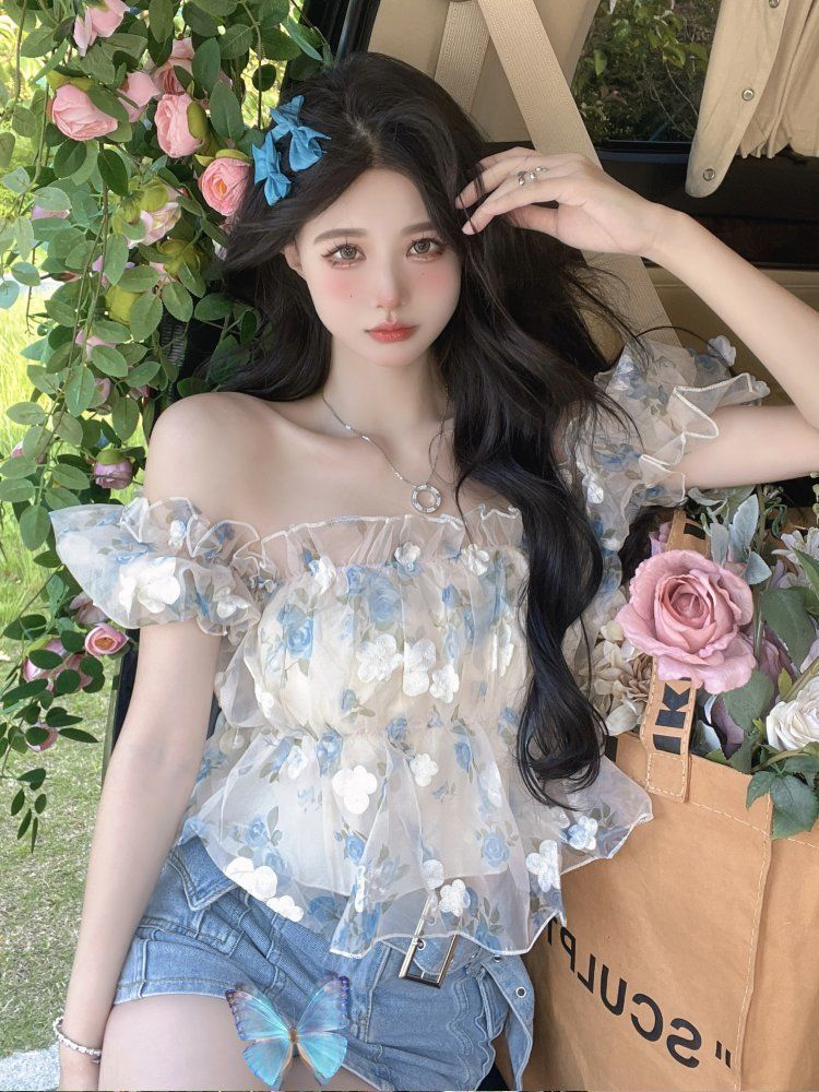 아마존 인터넷 연예인 원 숄더 쉬폰 셔츠 여성 여름 신선하고 달콤한 꽃 무늬 퍼프 슬리브 짧은 탑