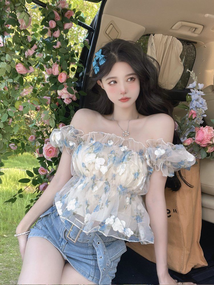아마존 인터넷 연예인 원 숄더 쉬폰 셔츠 여성 여름 신선하고 달콤한 꽃 무늬 퍼프 슬리브 짧은 탑스토어 가기