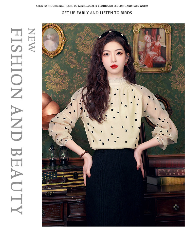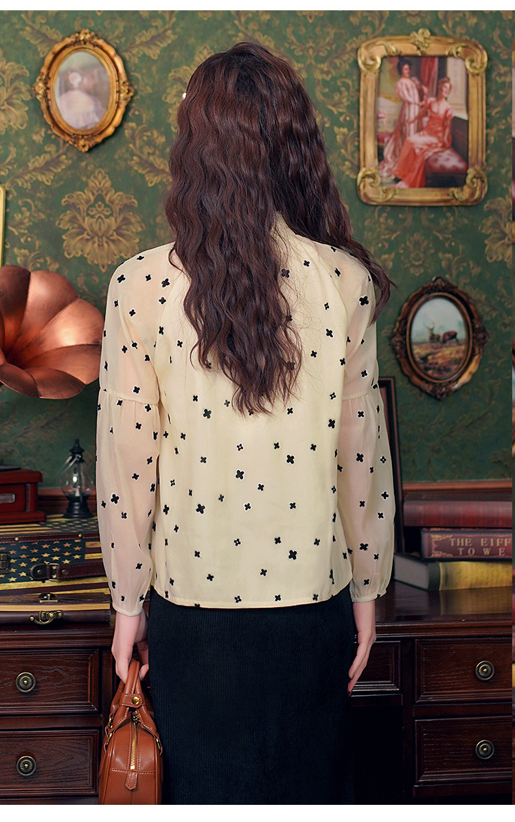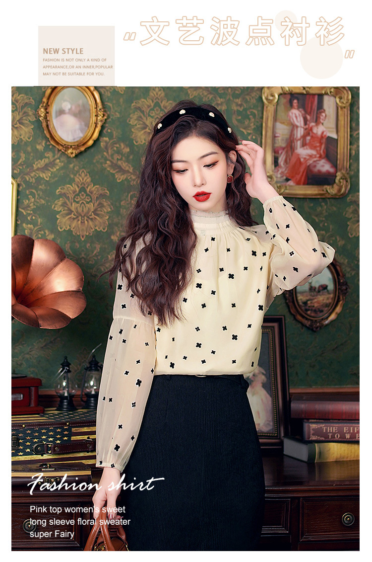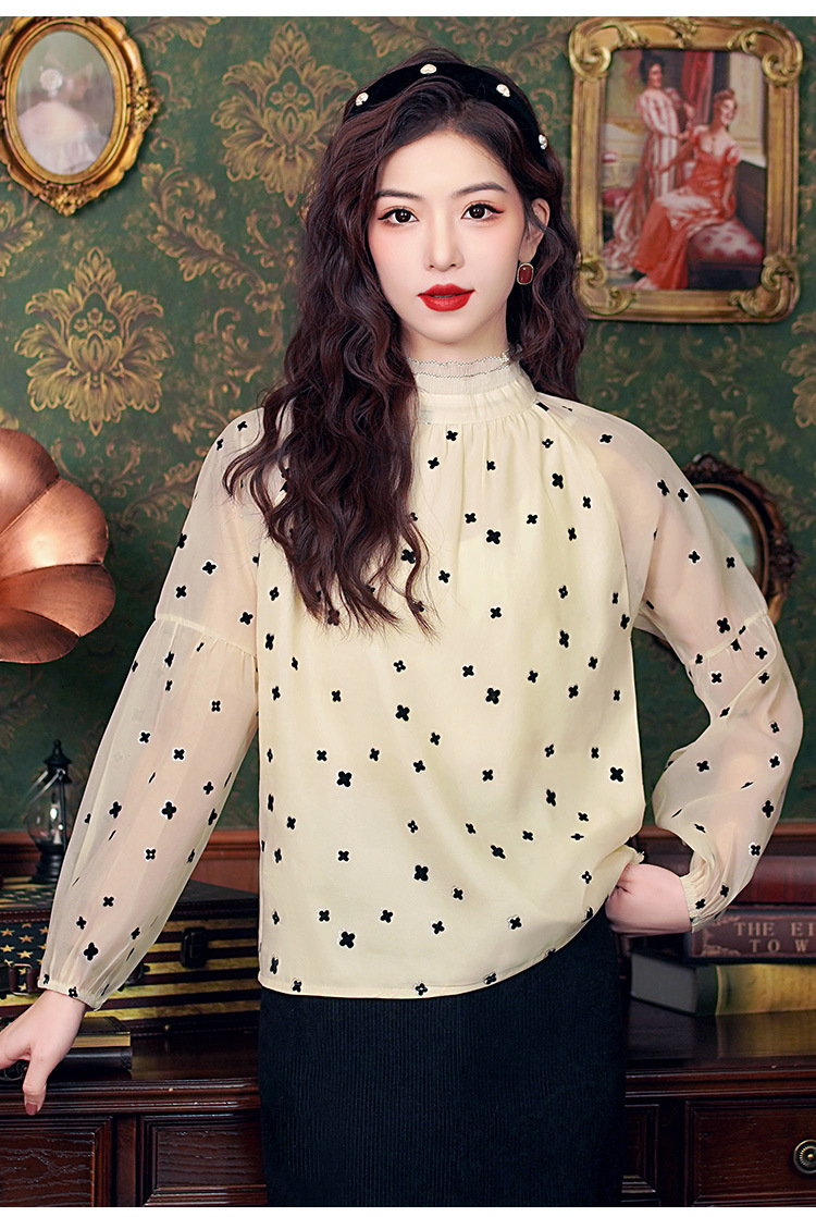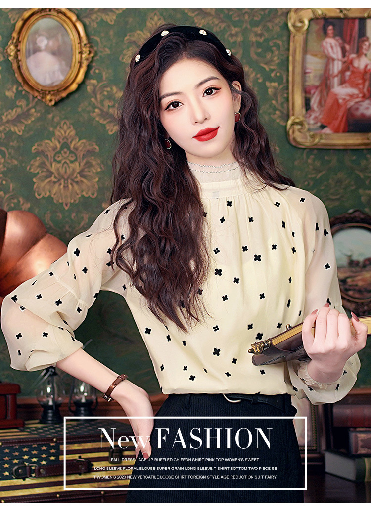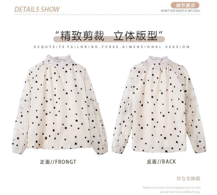 여성용 긴팔 쉬폰 셔츠, 2025년 봄 신상, 패셔너블하고 나이를 줄여주는 러플 칼라, 플로럴 프린트, 주름감 있는 스탠드 칼라 탑