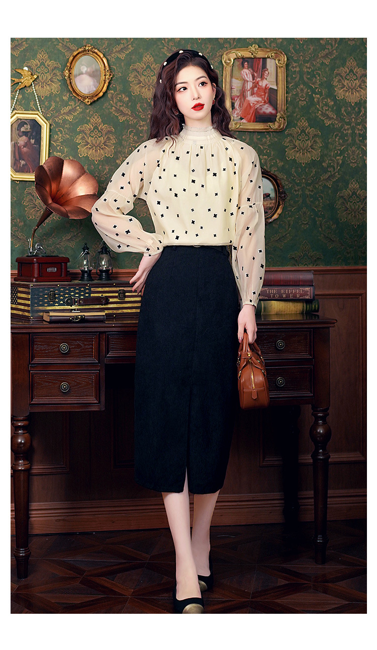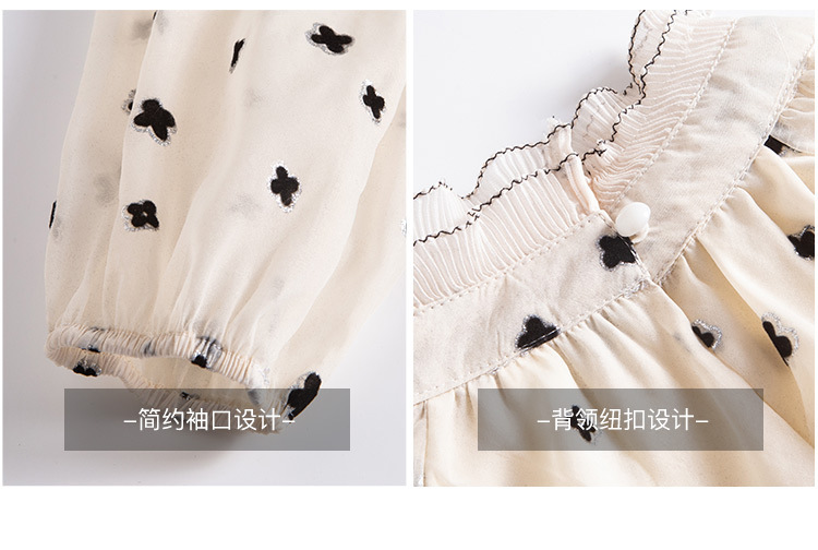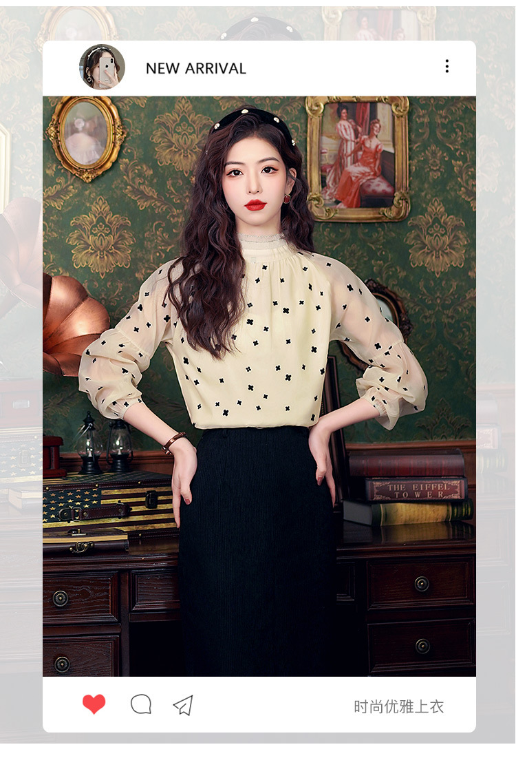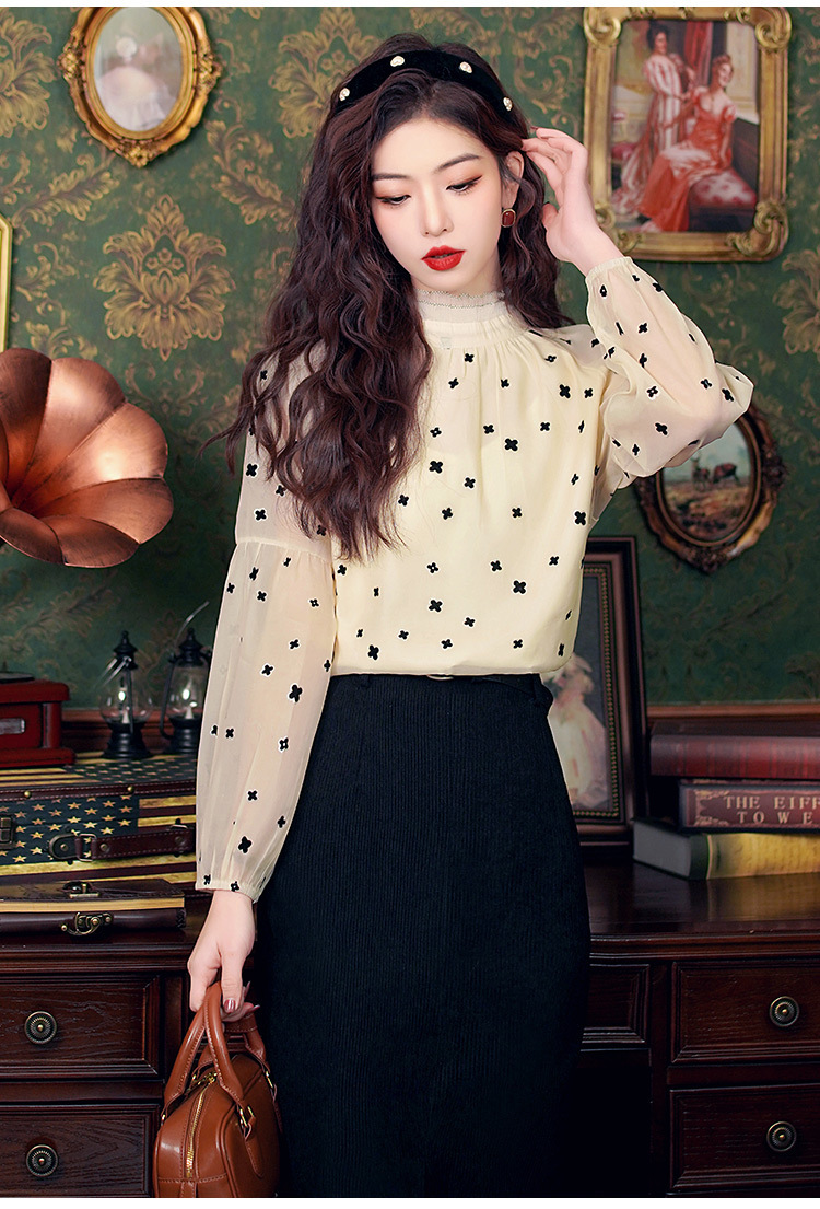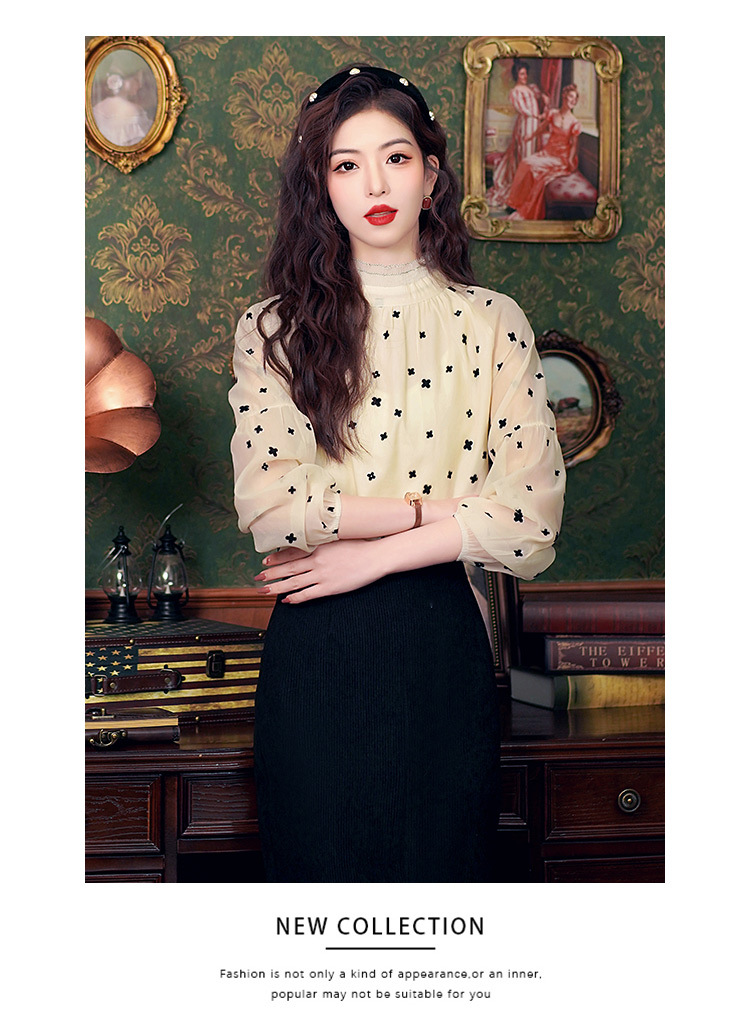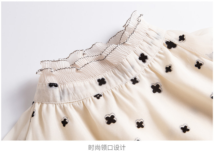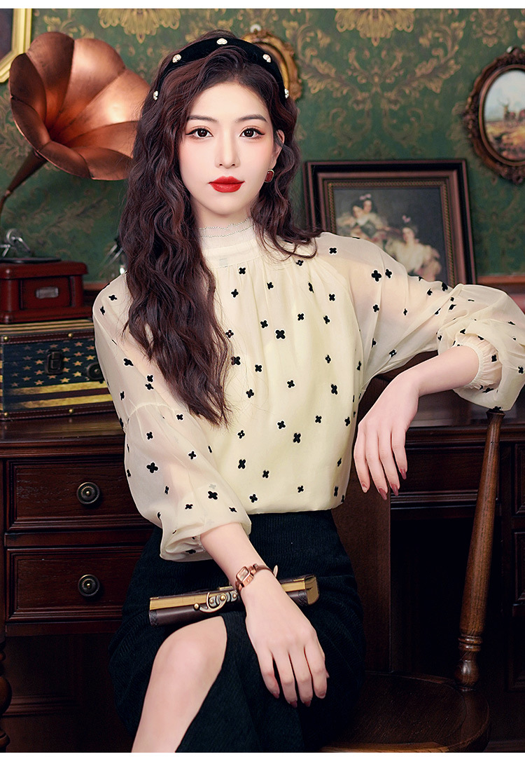 여성용 긴팔 쉬폰 셔츠, 2025년 봄 신상, 패셔너블하고 나이를 줄여주는 러플 칼라, 플로럴 프린트, 주름감 있는 스탠드 칼라 탑