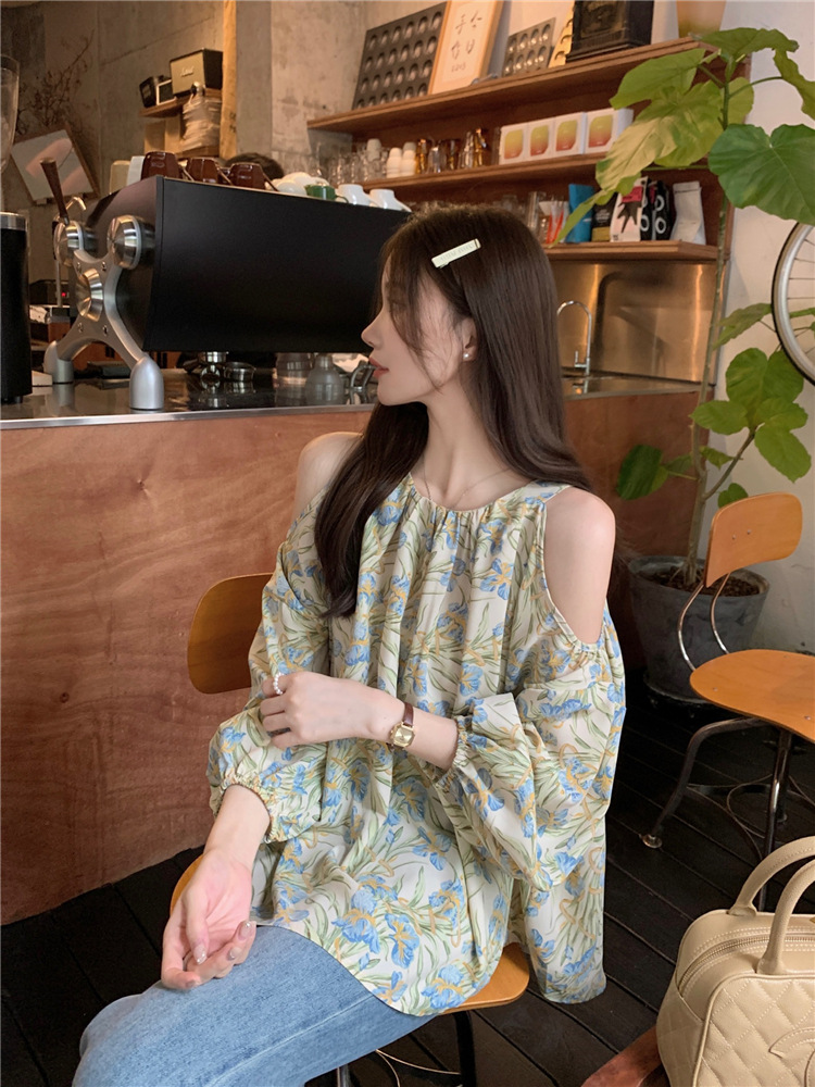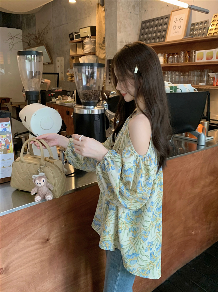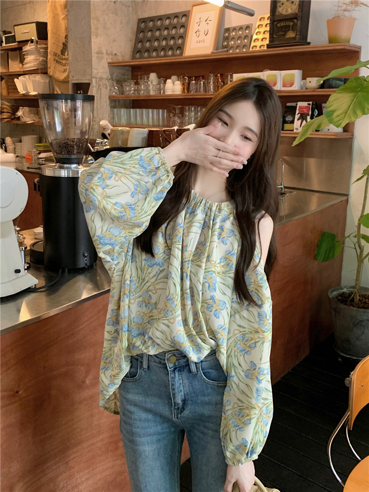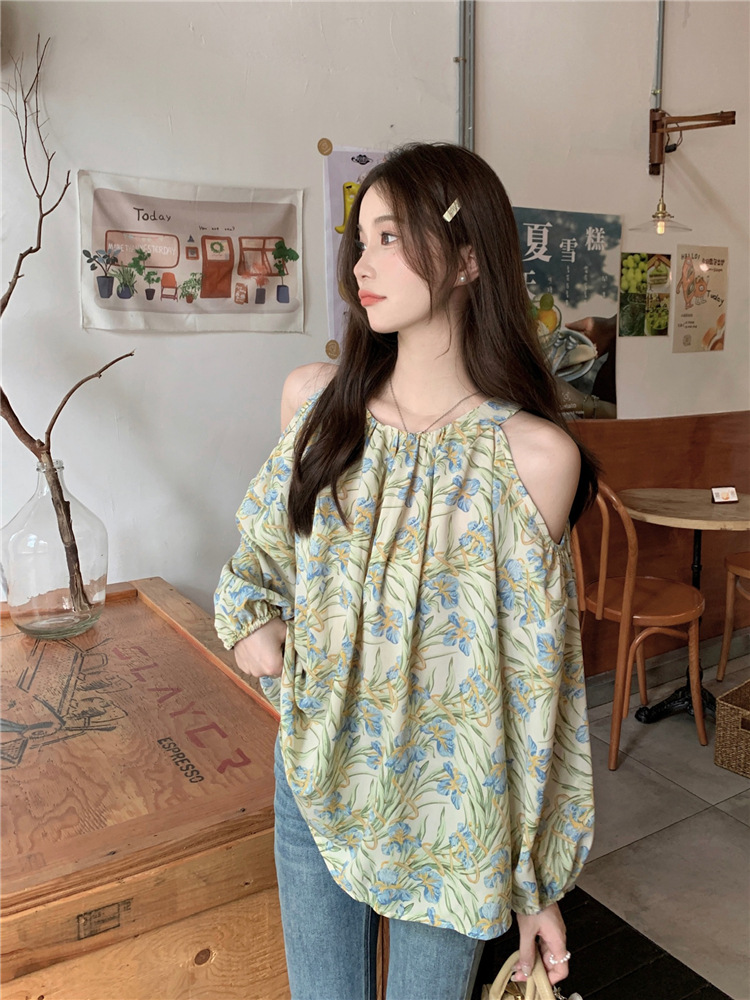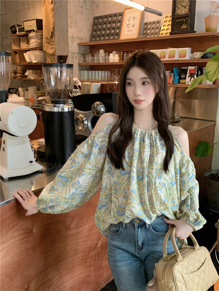 진짜 샷 복고풍 디자인 속이 빈 오프 숄더 긴 소매 꽃 쉬폰 셔츠 탑 여성용 한국식 홀터 셔츠 61124