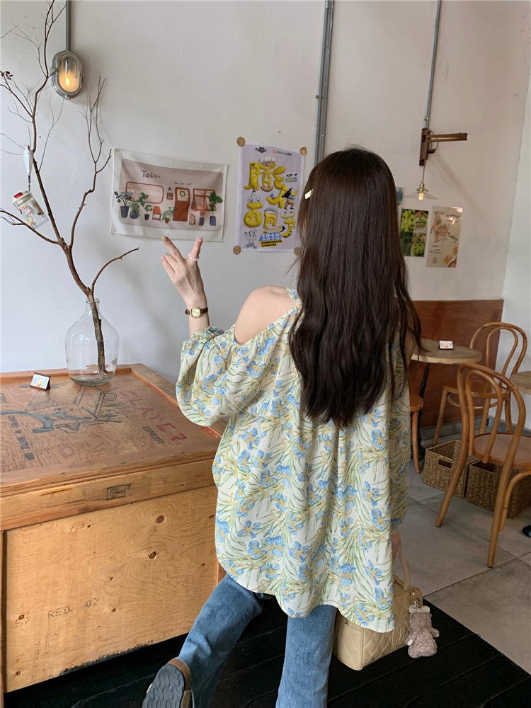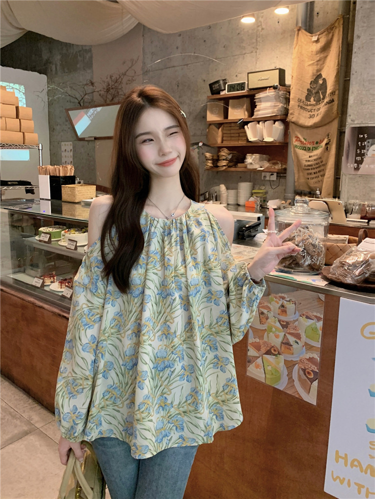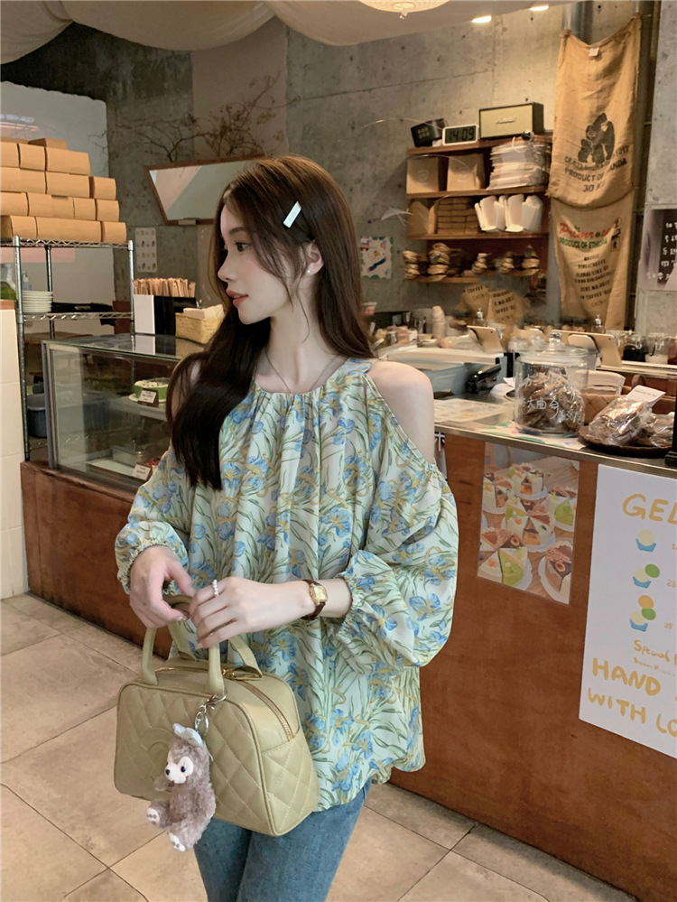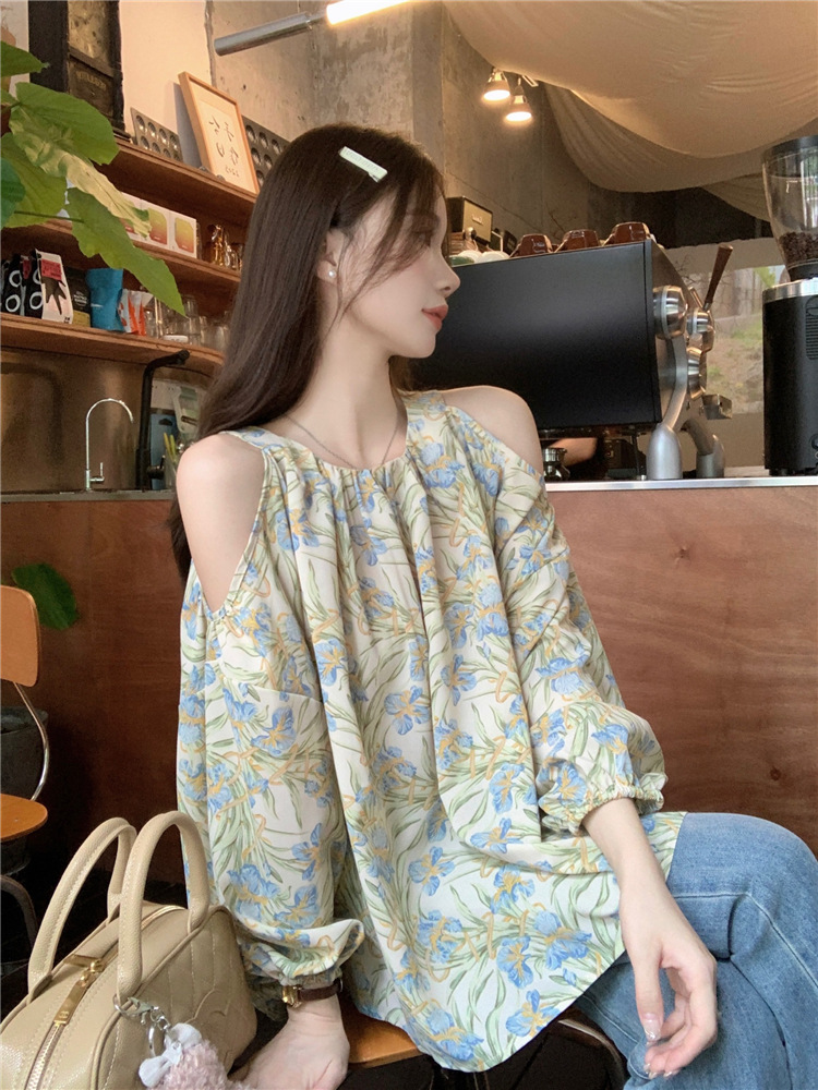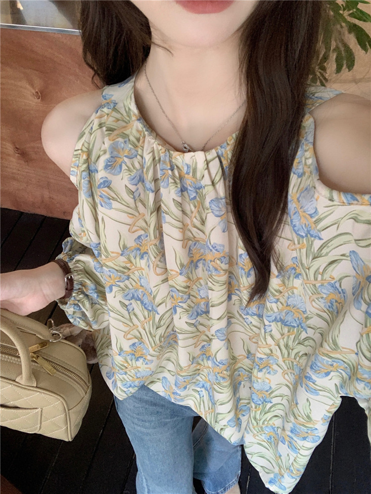 진짜 샷 복고풍 디자인 속이 빈 오프 숄더 긴 소매 꽃 쉬폰 셔츠 탑 여성용 한국식 홀터 셔츠 61124