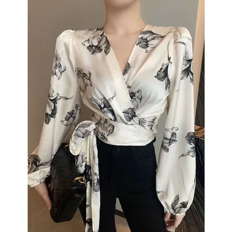 시폰 셔츠 우아한 통근 시크한 크로스 스트랩 V 넥 긴팔 셔츠 2024 봄 신상 여성용 패션스토어 가기