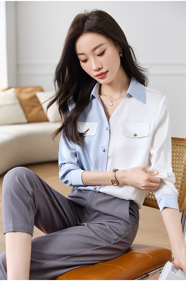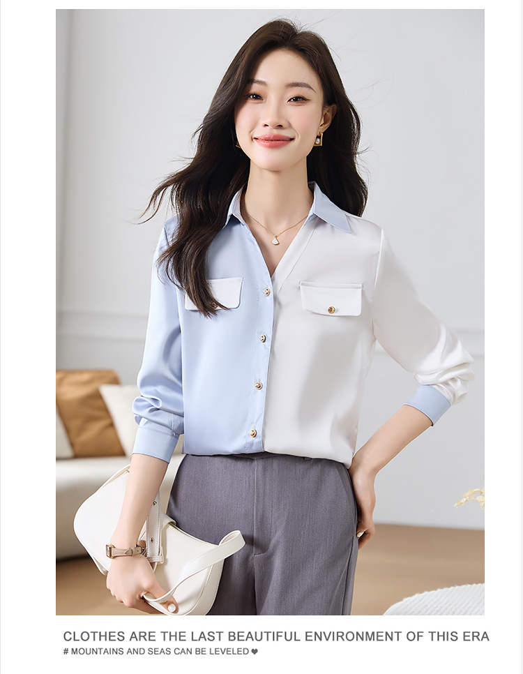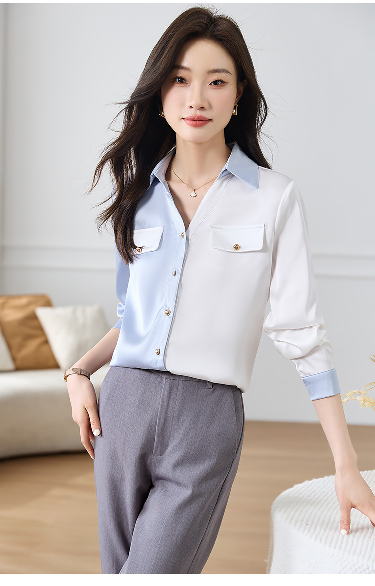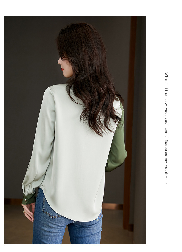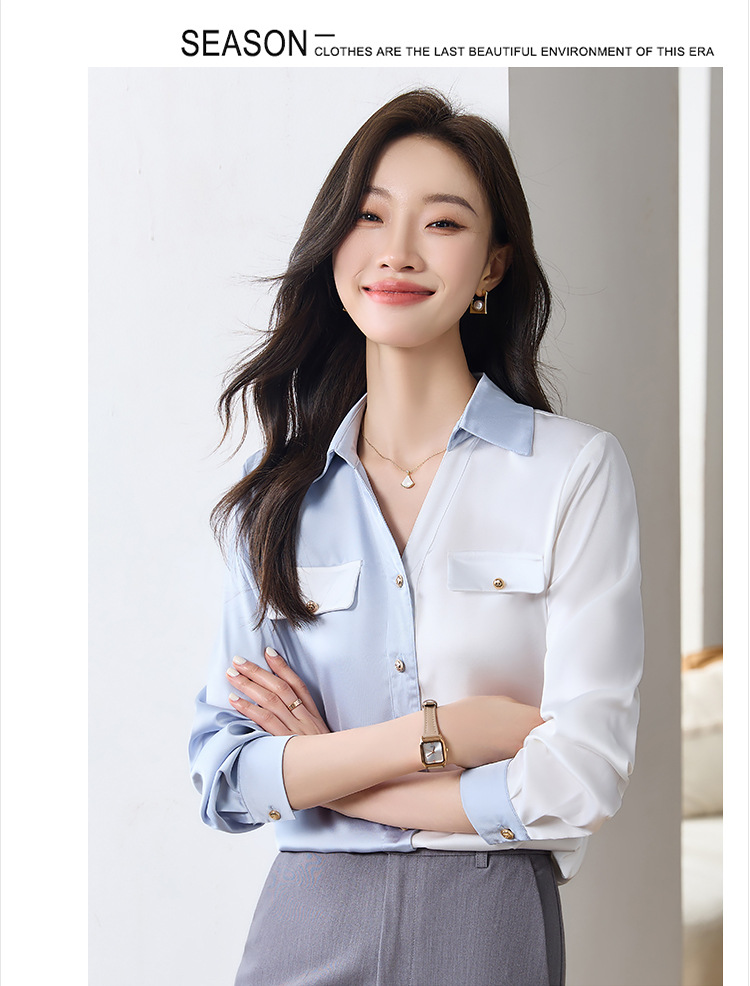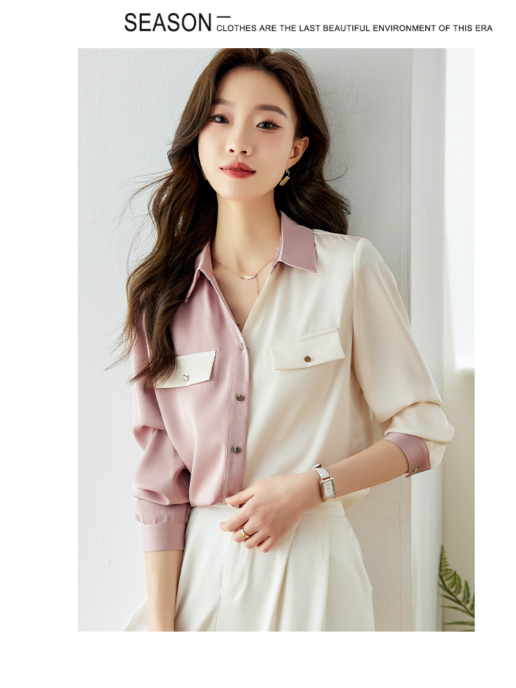 패션 V 넥 셔츠 여성의 2024 봄 새로운 도착 스티칭 홍콩 스타일 레트로 고급 쉬폰 셔츠 작은 셔츠스토어 가기