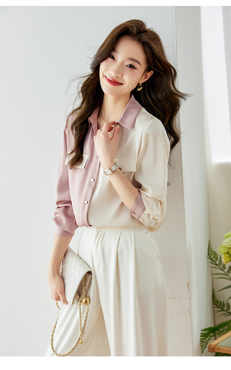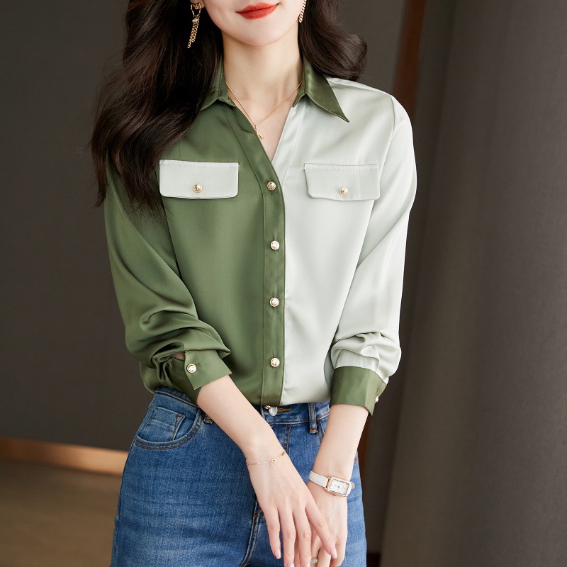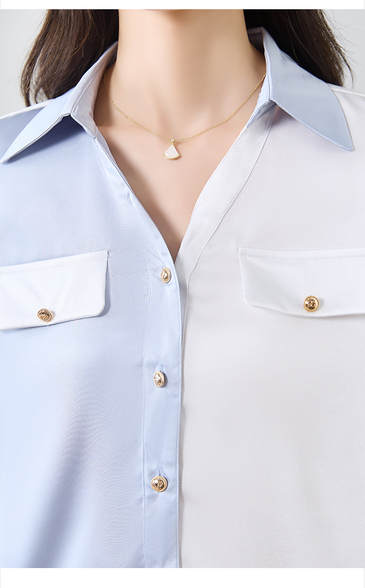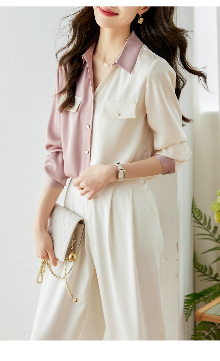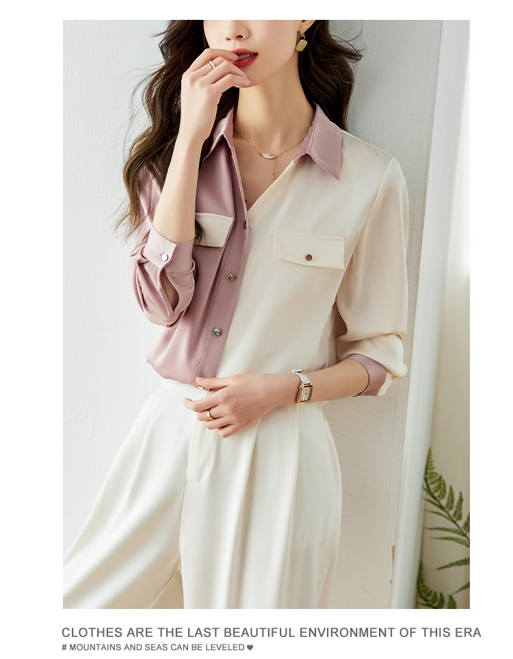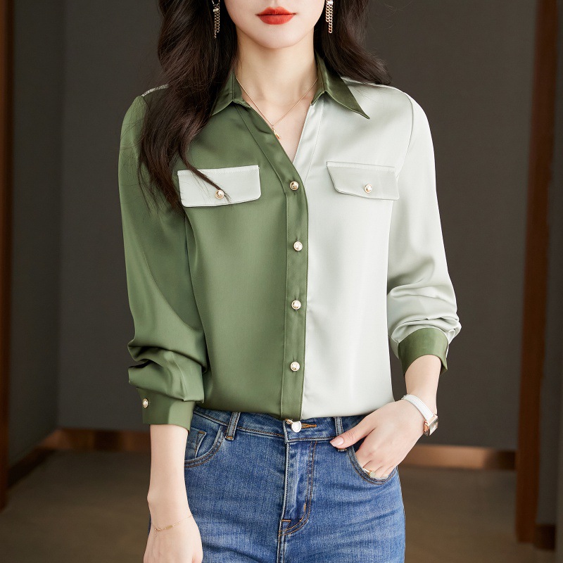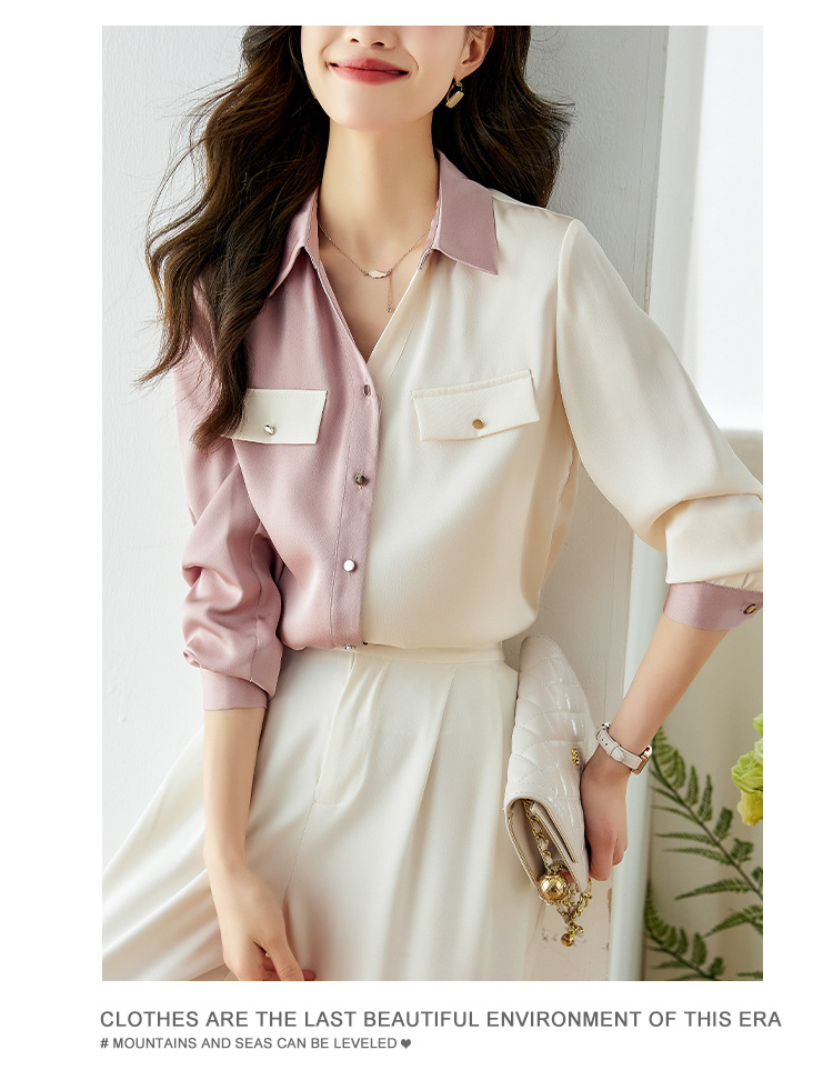 패션 V 넥 셔츠 여성의 2024 봄 새로운 도착 스티칭 홍콩 스타일 레트로 고급 쉬폰 셔츠 작은 셔츠