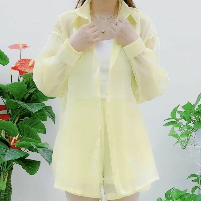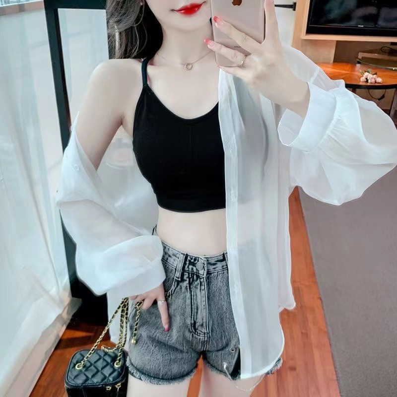 디자인 감각 도파민 착용 일본 셔츠 여성의 여름 얇은 시스루 태양 보호 의류 다용도 느슨한 쉬폰 탑스토어 가기