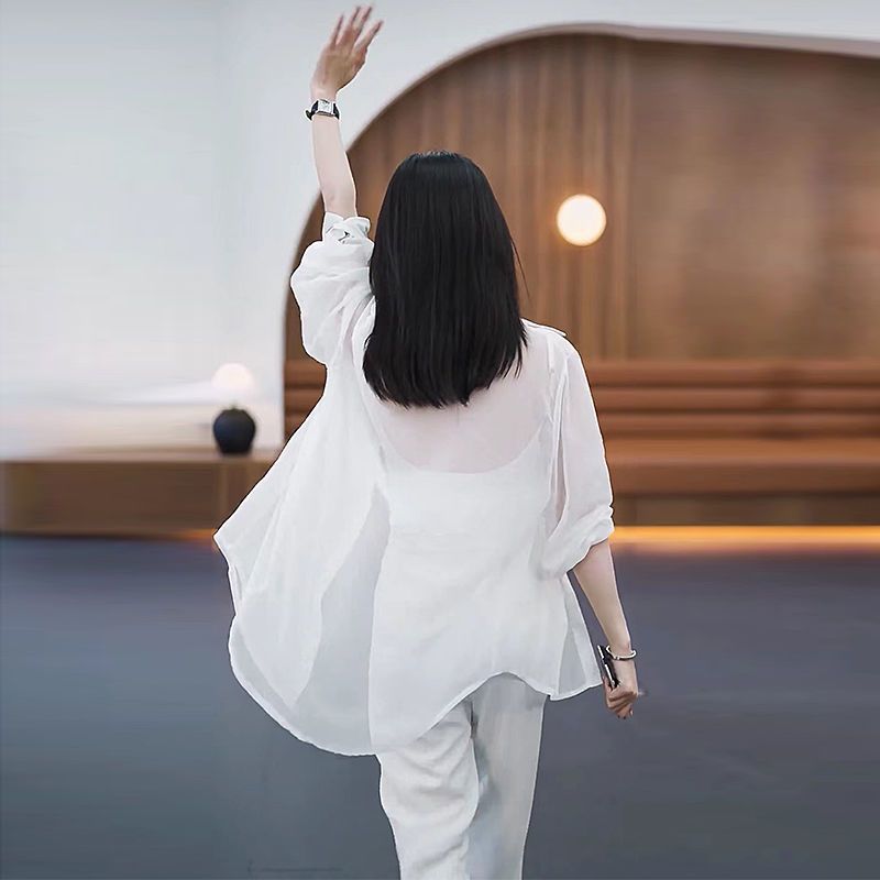디자인 감각 도파민 착용 일본 셔츠 여성의 여름 얇은 시스루 태양 보호 의류 다용도 느슨한 쉬폰 탑