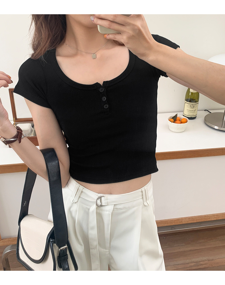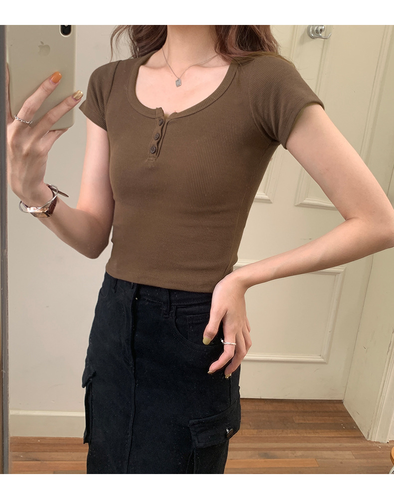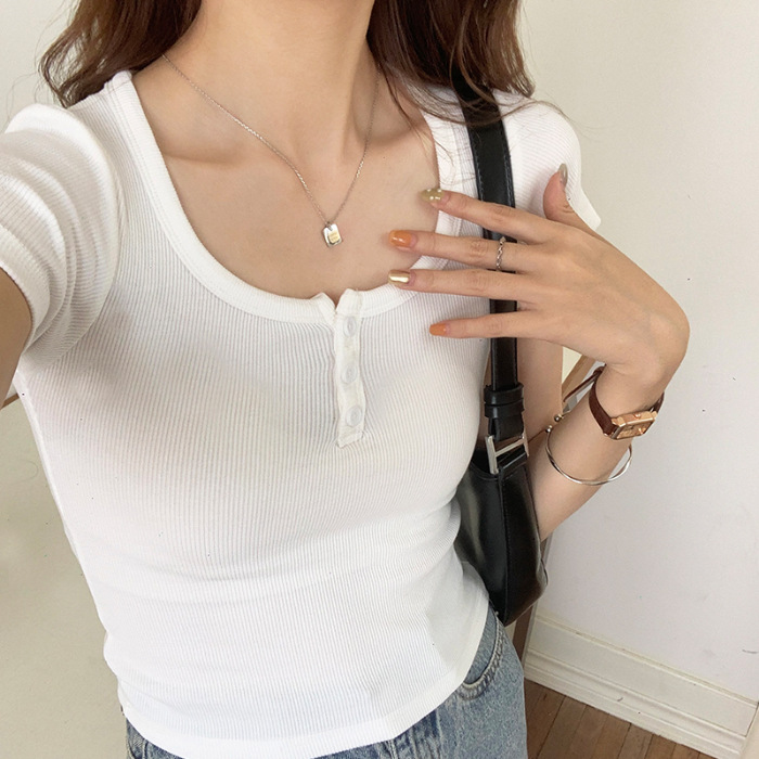 2024 여름 새로운 스타일의 어깨 반팔 티셔츠 여성 틈새 디자인 감각 핫 소녀 슬림 슬리밍 셔츠 짧은 탑