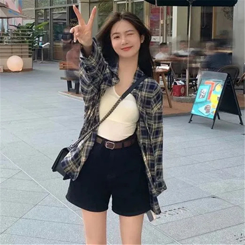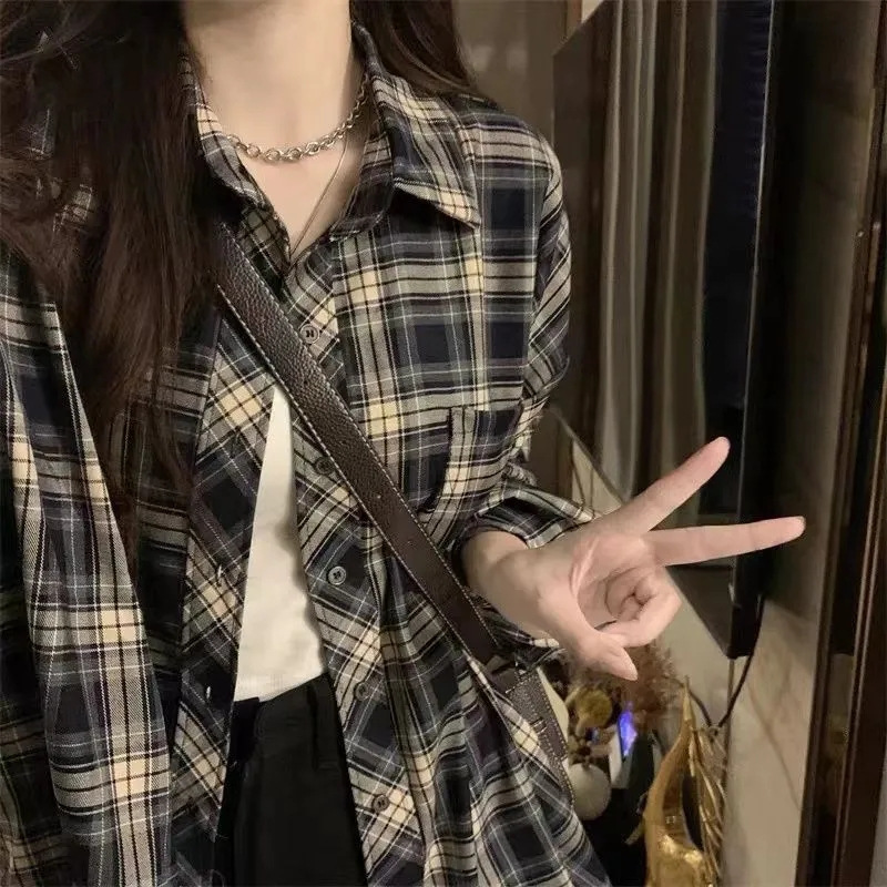 격자 무늬 셔츠 여성의 봄과 여름 파워 착용 게으른 스타일 디자인 느슨한 셔츠 긴 소매 탑 카디건 코트스토어 가기