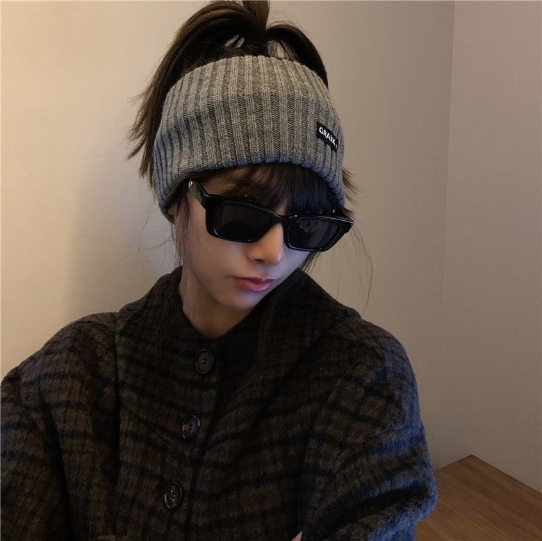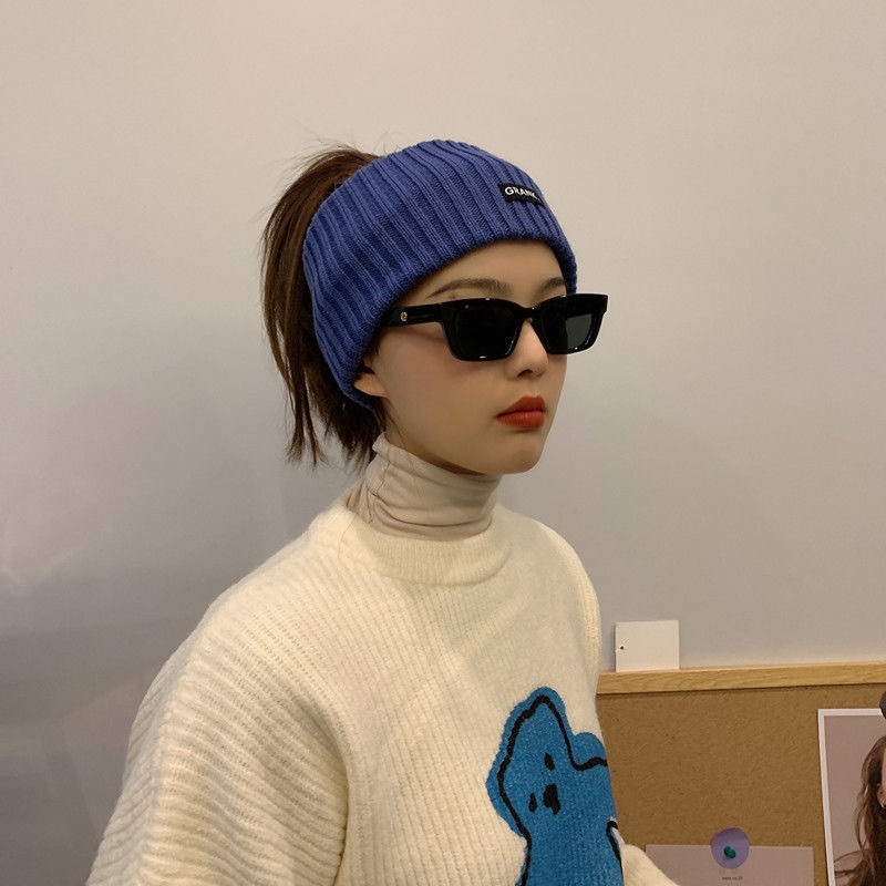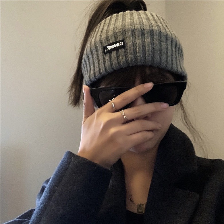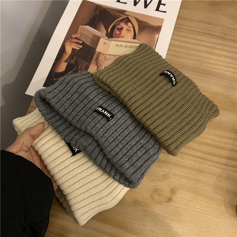 • 秋冬新款日系显脸小字母冷帽女网红护耳包头堆堆帽大头围针织帽