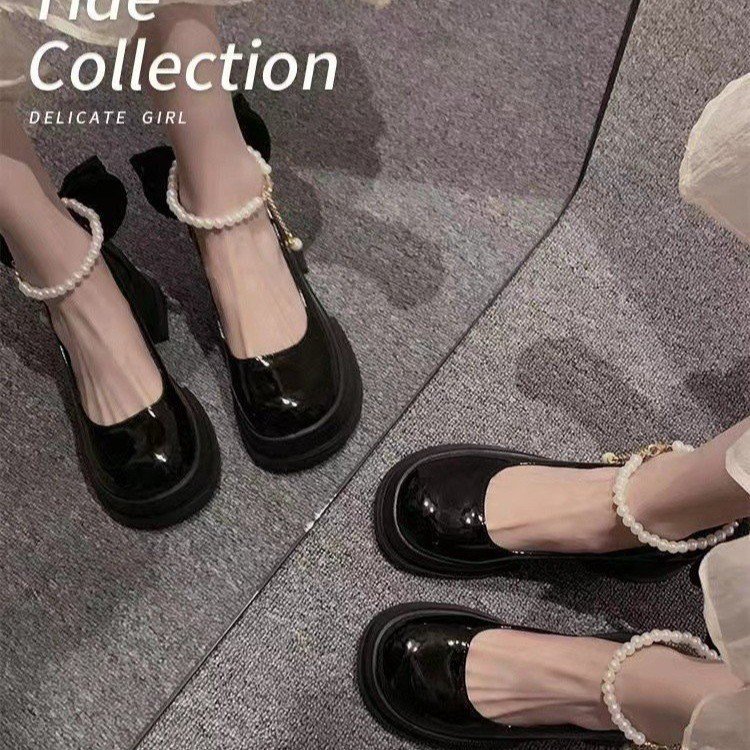 레트로 진주 리본 메리제인 슈즈 여성용 2025 봄 여름 신상 두꺼운 굽 달콤한 하이힐 로퍼스토어 가기