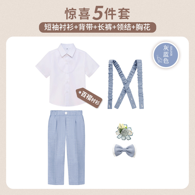 • [반소매 셔츠] 그레이 블루 4 피스 (짧은 소매 셔츠 바지 나비 넥타이 스트랩)