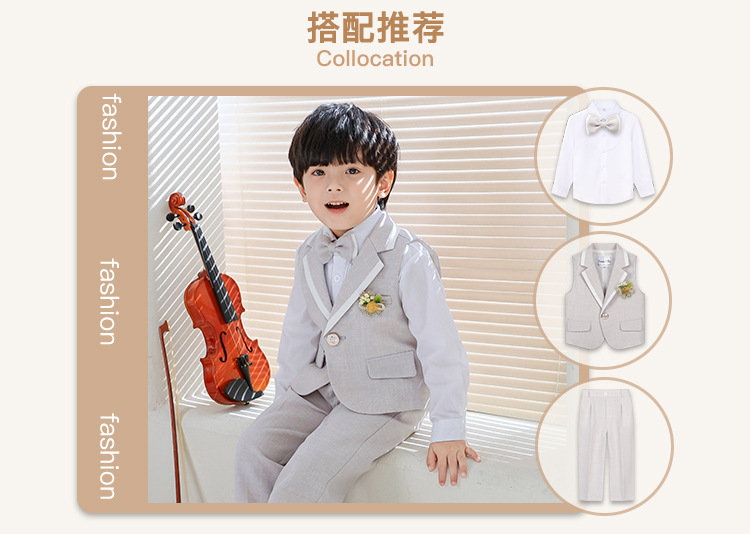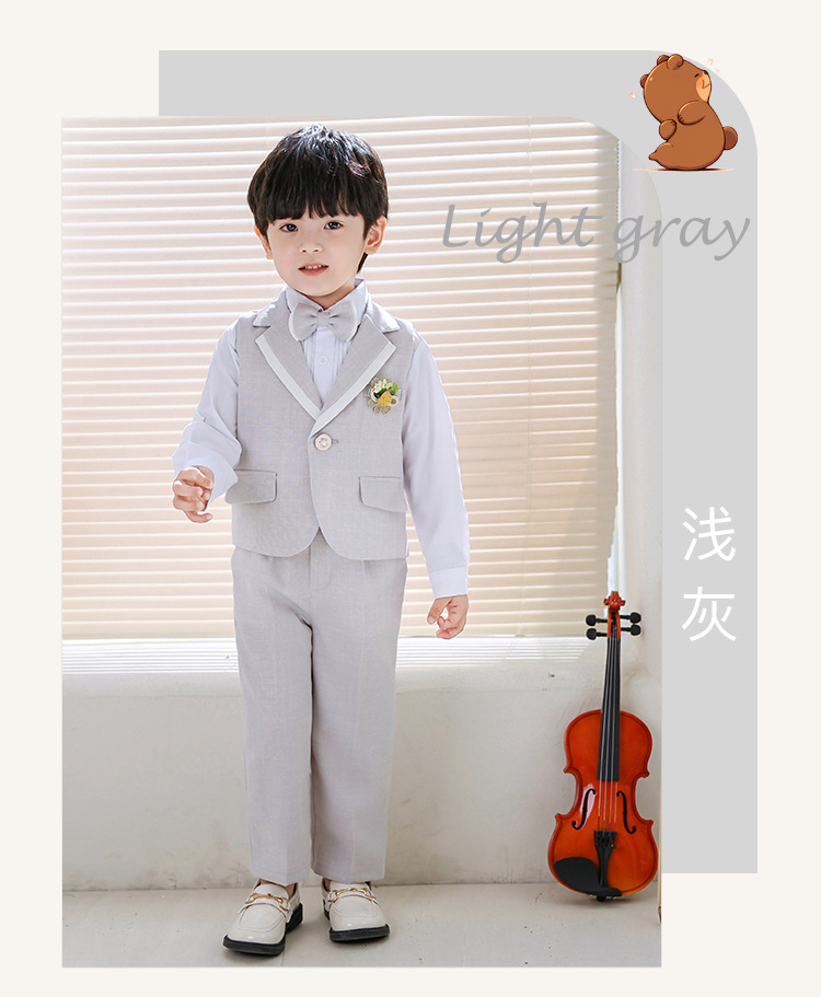 • [반팔 셔츠] 라이트 그레이 6 피스 세트 (반팔 셔츠 + 조끼 + 바지 + 코사이지 + 나비 넥타이 + 스트랩)