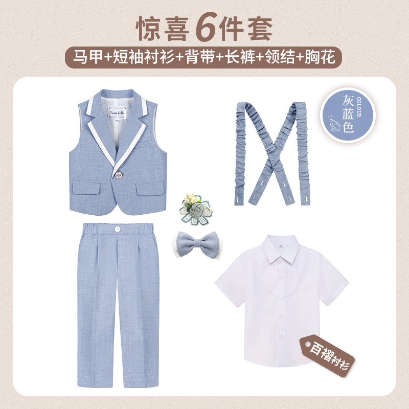• [반팔 셔츠] 6 피스 회색과 파란색 (반팔 셔츠 조끼 + 바지 + 코사이지 + 나비 넥타이 + 스트랩)