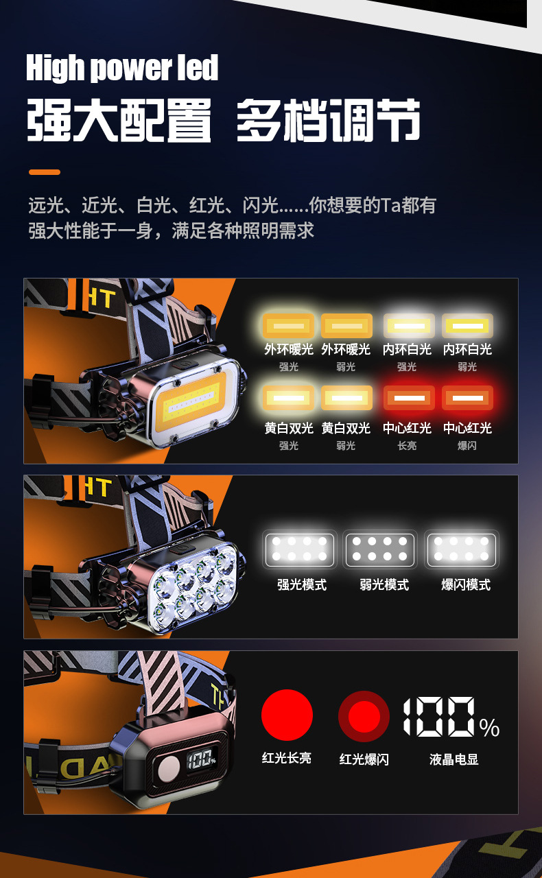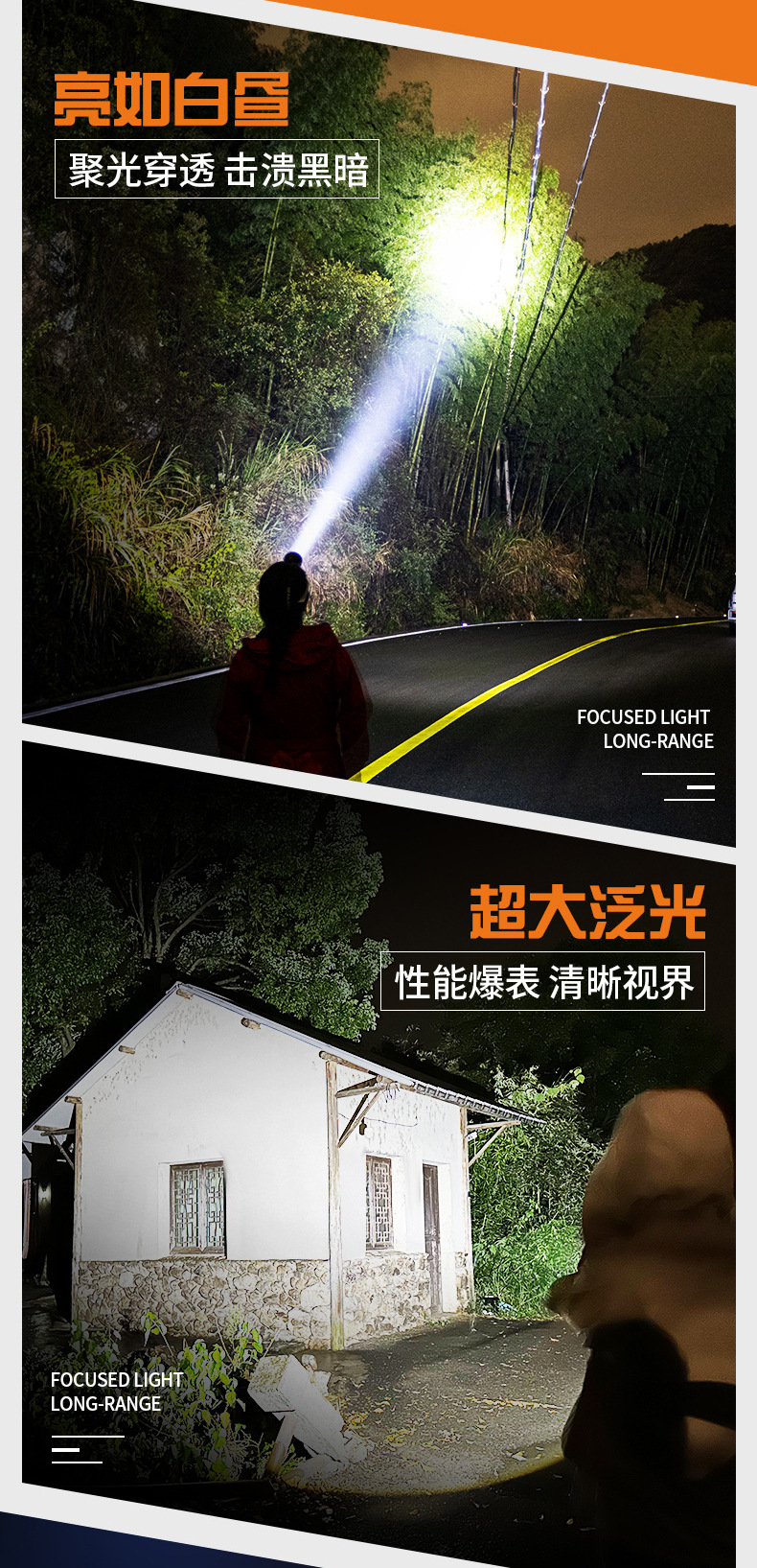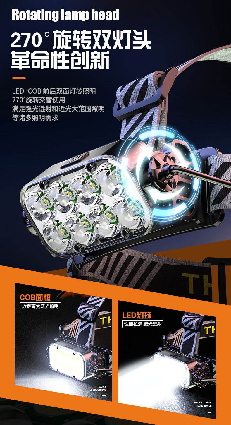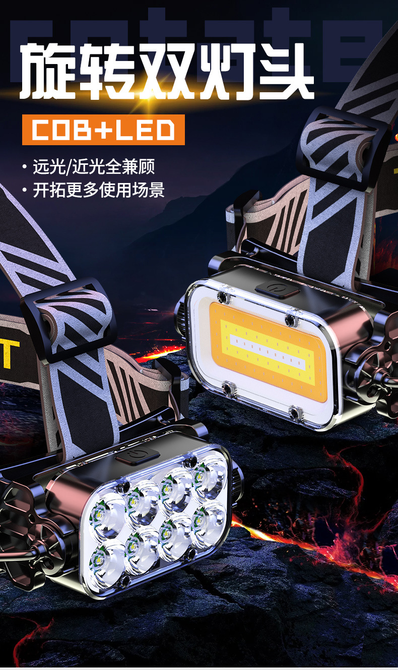 【产品特点】:双面旋转可用 一面LED远光+一面COB泛光 内置聚合物锂电池 液晶数字电显