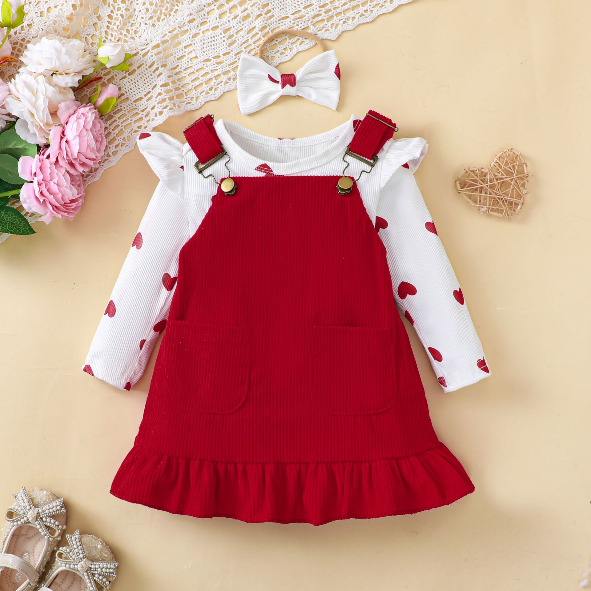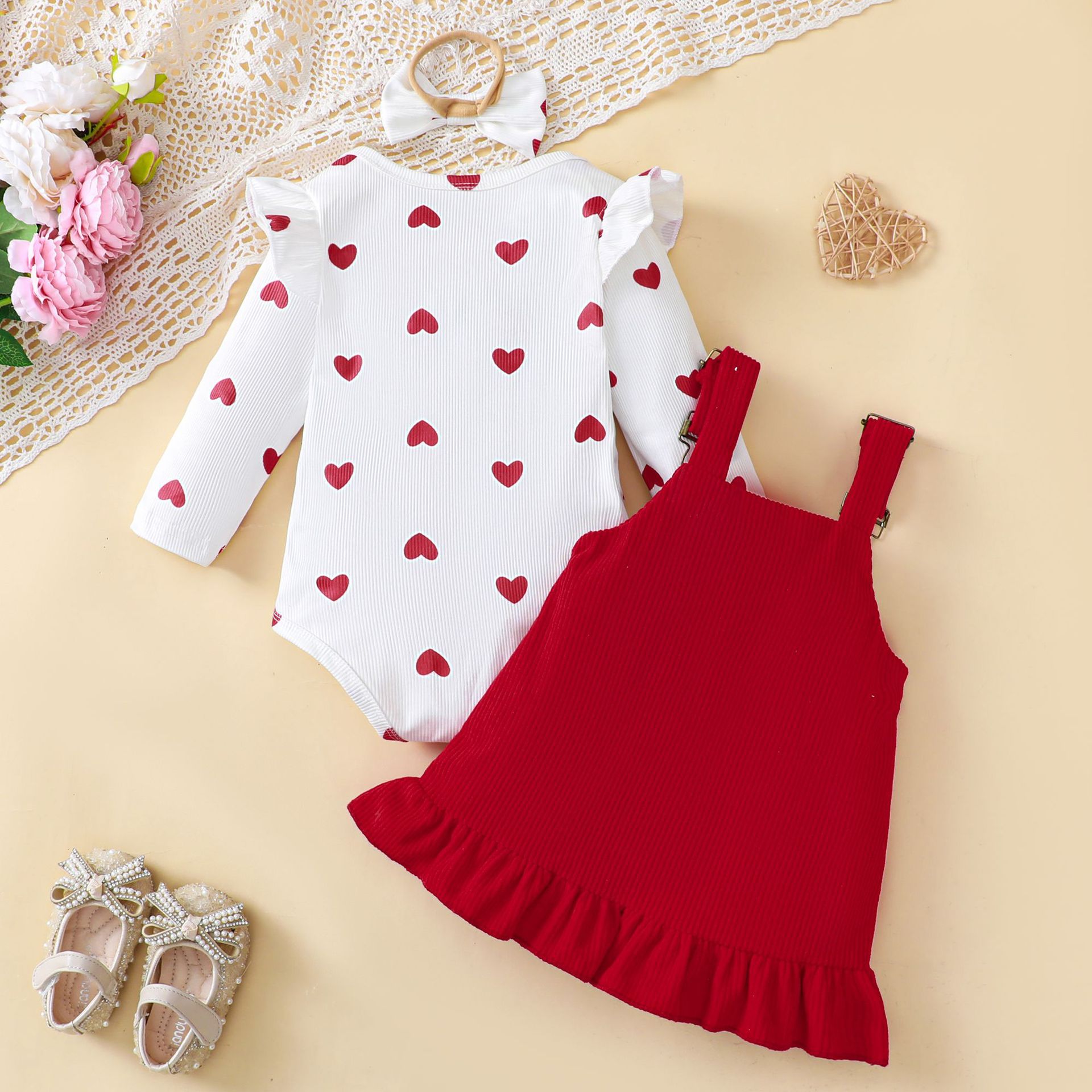 E2314A 국경 간 아기 소녀 귀여운 세트 사랑 인쇄 된 비행 소매 롬퍼 + 서스펜더 스커트 + 헤드 밴드 3 피스 세트