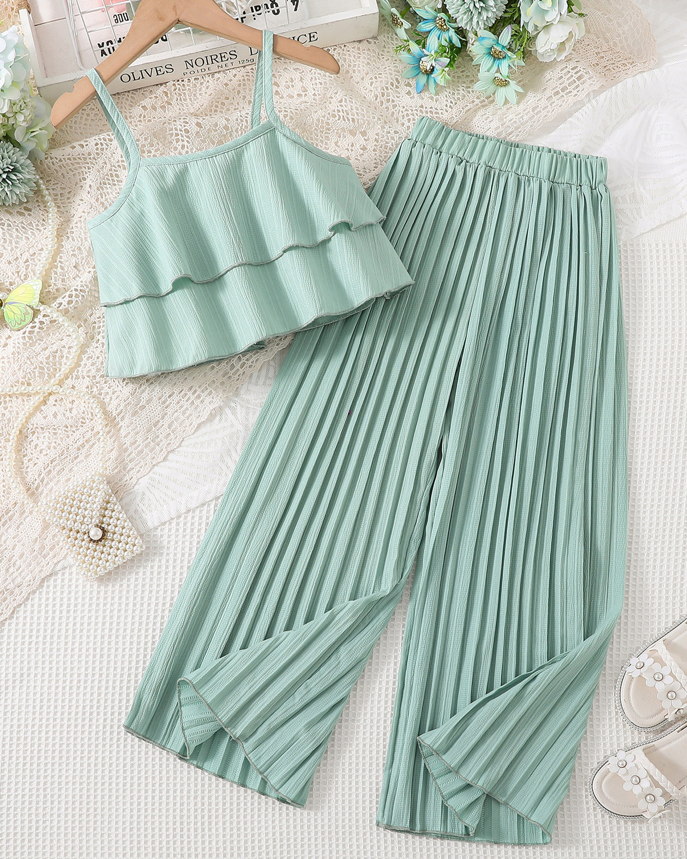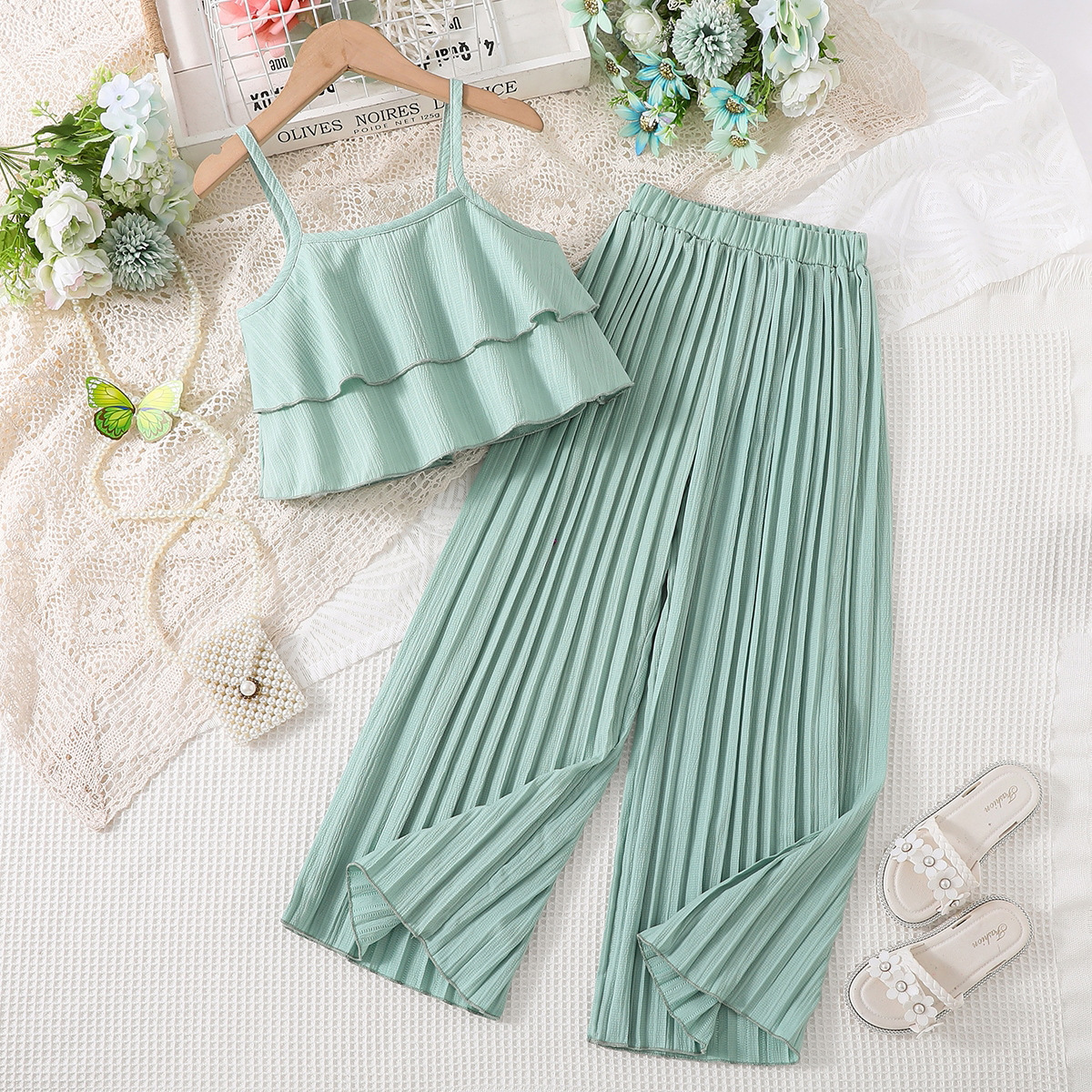 여자 정장 여름 짧은 서스펜더 주름 바지 투피스 정장 인기 아동 의류 여름 어린이 달콤한 정장