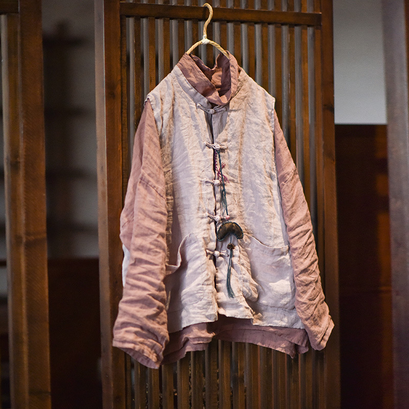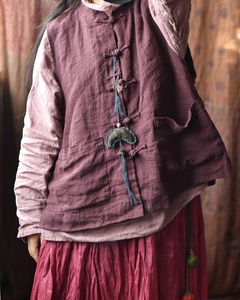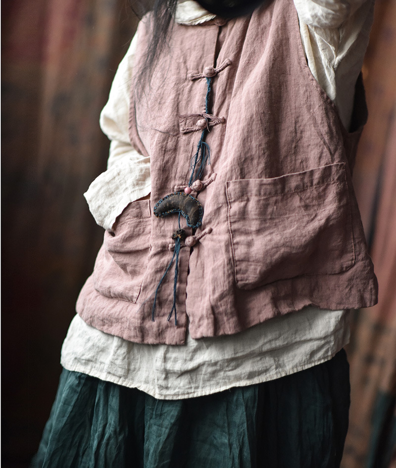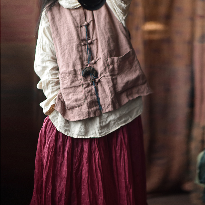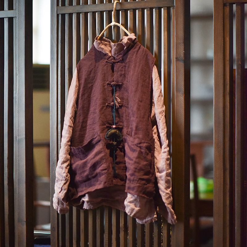 203 Four Seasons Double-layer Washed Old Linen Women's Vest with Vertical Collar and Buckle Ethnic Style Vintage Vest