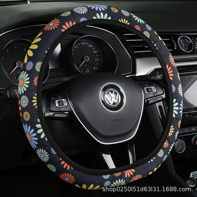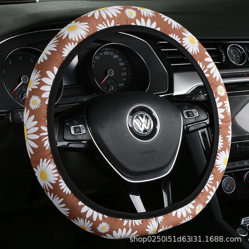 스티어링 휠 커버 데이지 프린트 사계절 유니버설 미끄럼 방지 땀 흡수 얼룩 방지 탄성 비 내부 링 자동차 핸들 커버스토어 가기