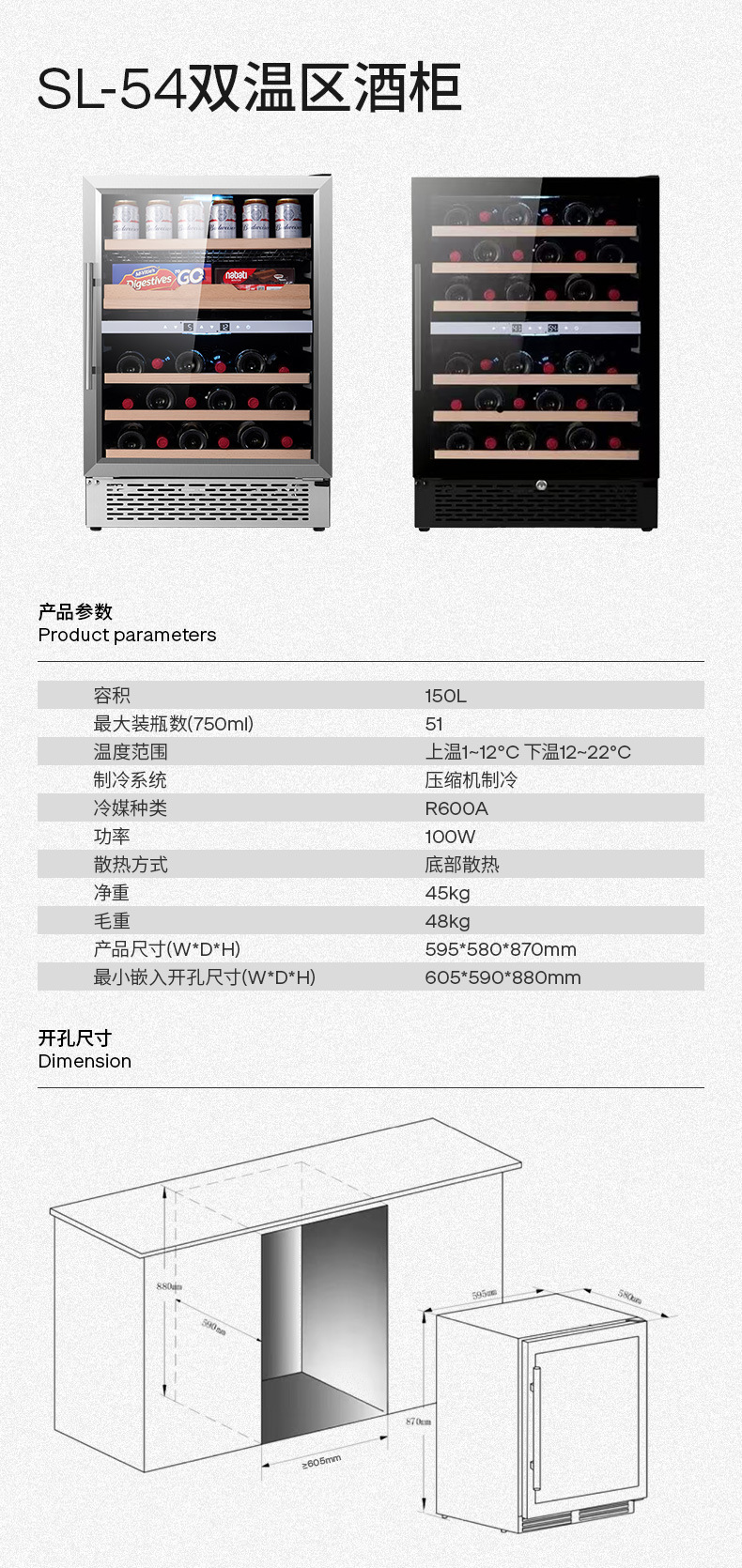 • 150L 이중 온도 구역 와인 쿨러 스테인레스 스틸 SL-54