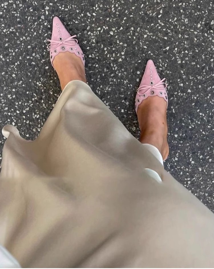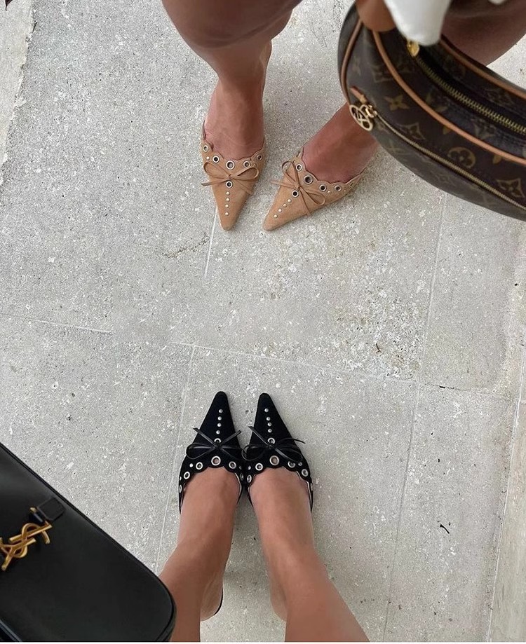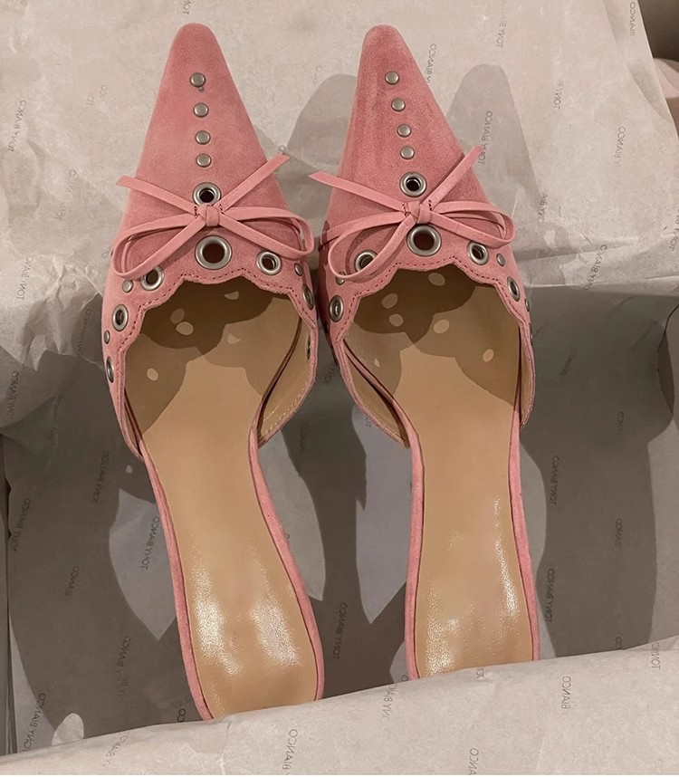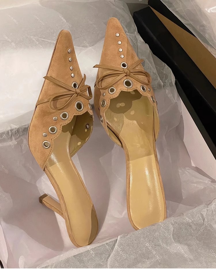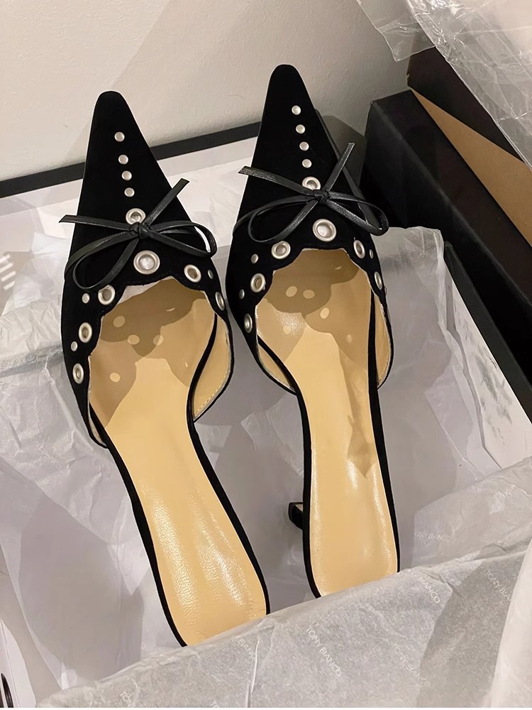 2024 년 봄과 가을 새로운 스웨이드 보우 할로우 뾰족한 하이힐 샌들 여성용 기질 Baotou 하프 슬리퍼