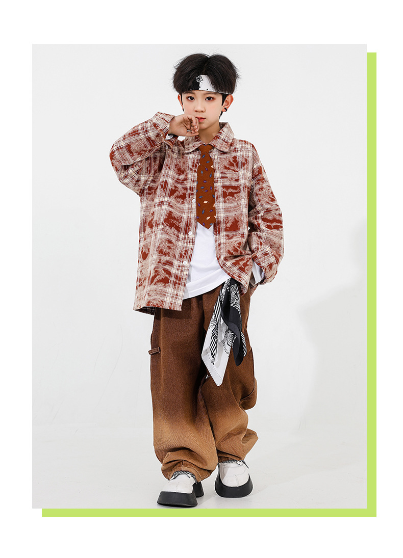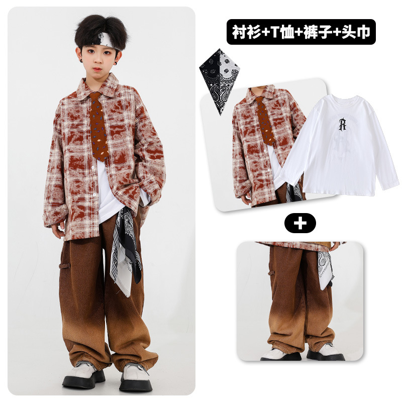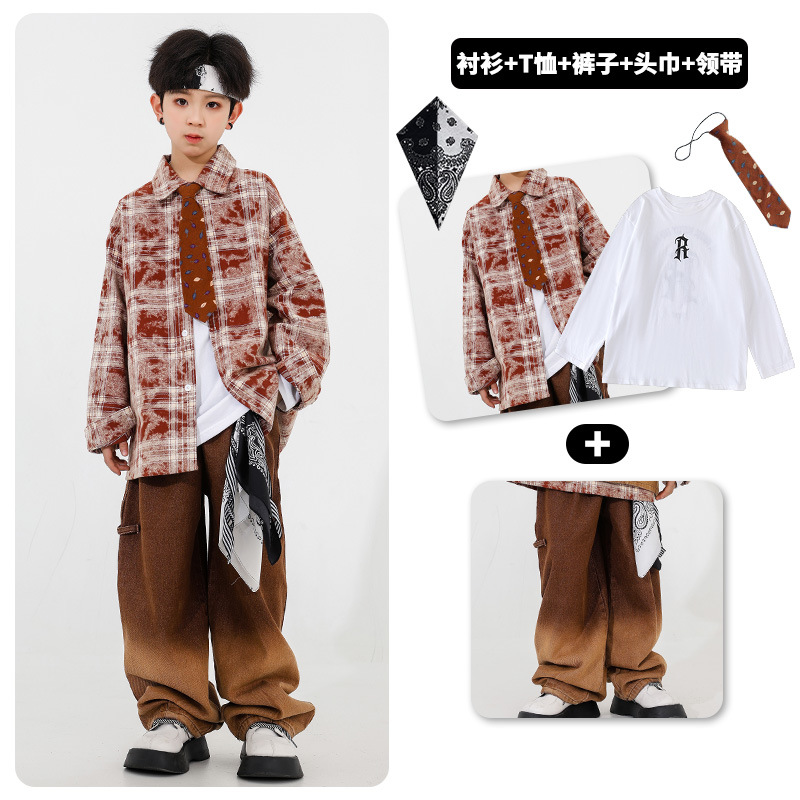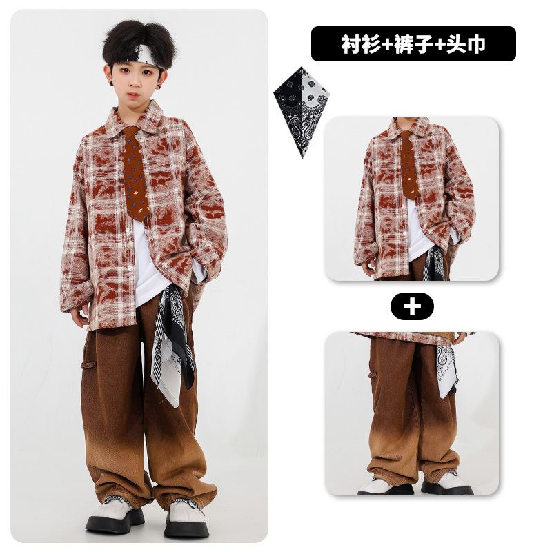• 셔츠 3 피스 세트 [커피 체크 무늬 셔츠 + 그라디언트 바지 + 화이트 R 긴 소매]]
