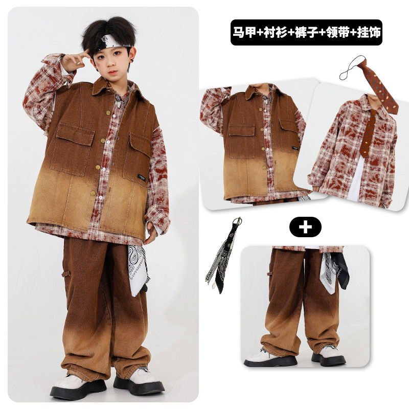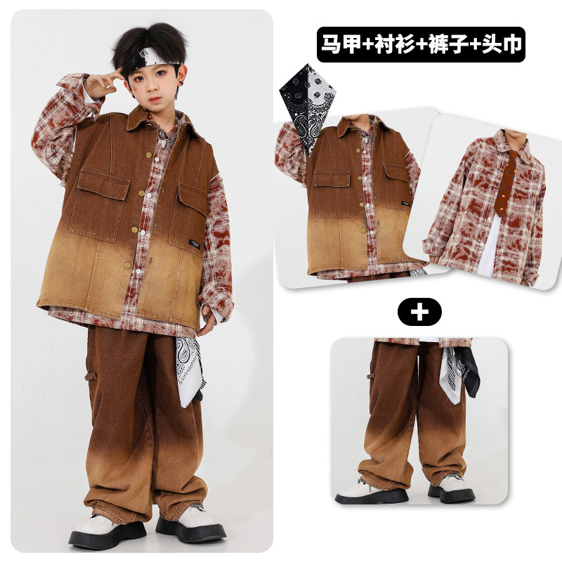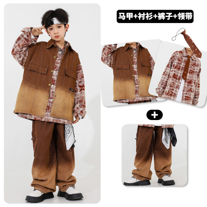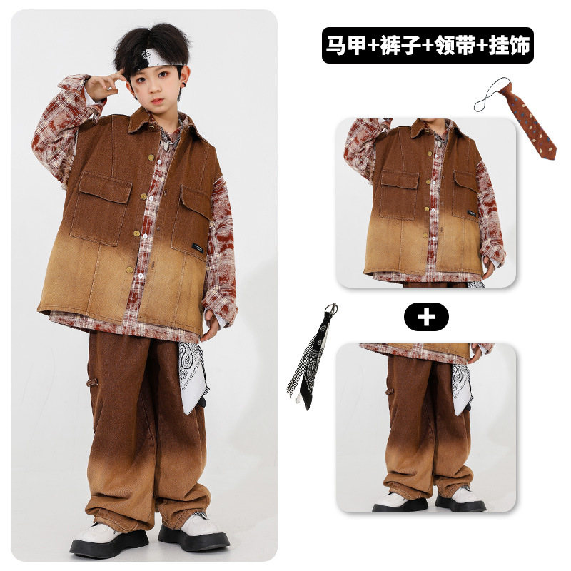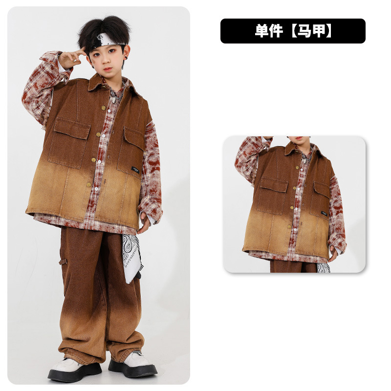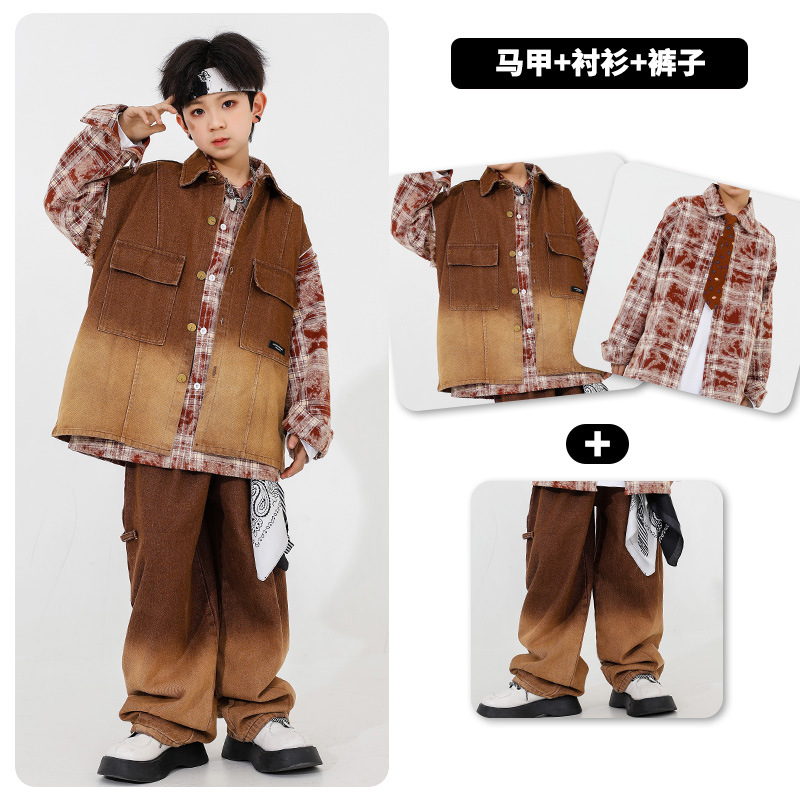 • 조끼 3 피스 세트 [그라디언트 조끼 + 그라디언트 바지 + 커피 체크 무늬 셔츠 긴 소매]]