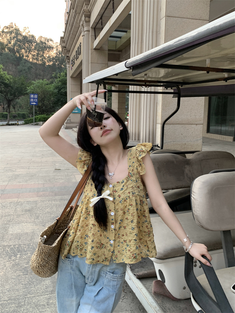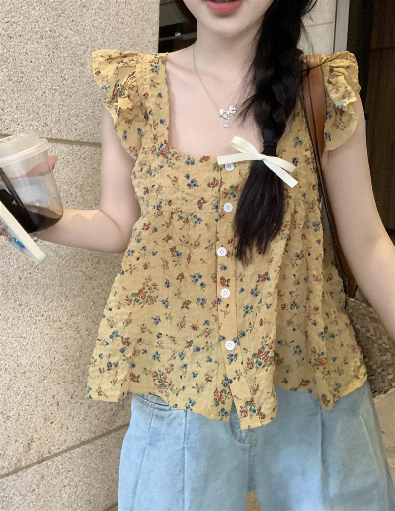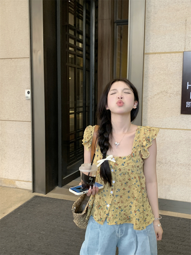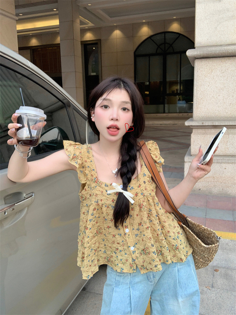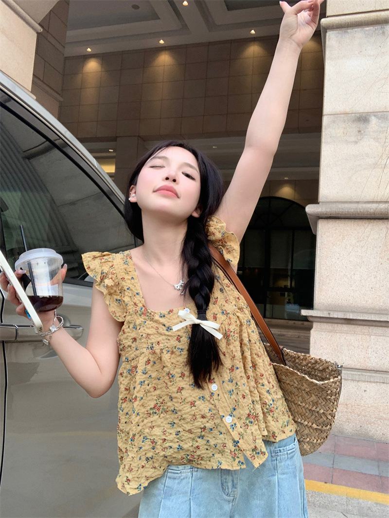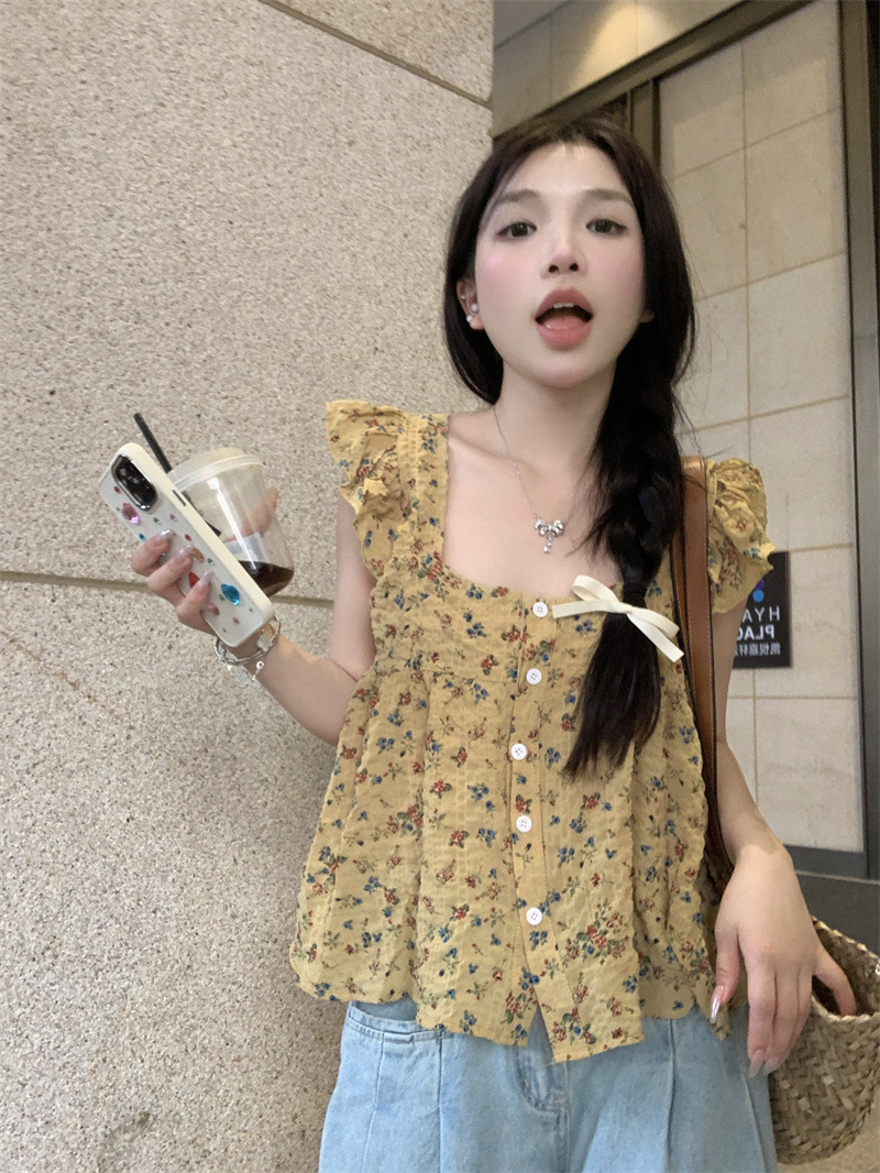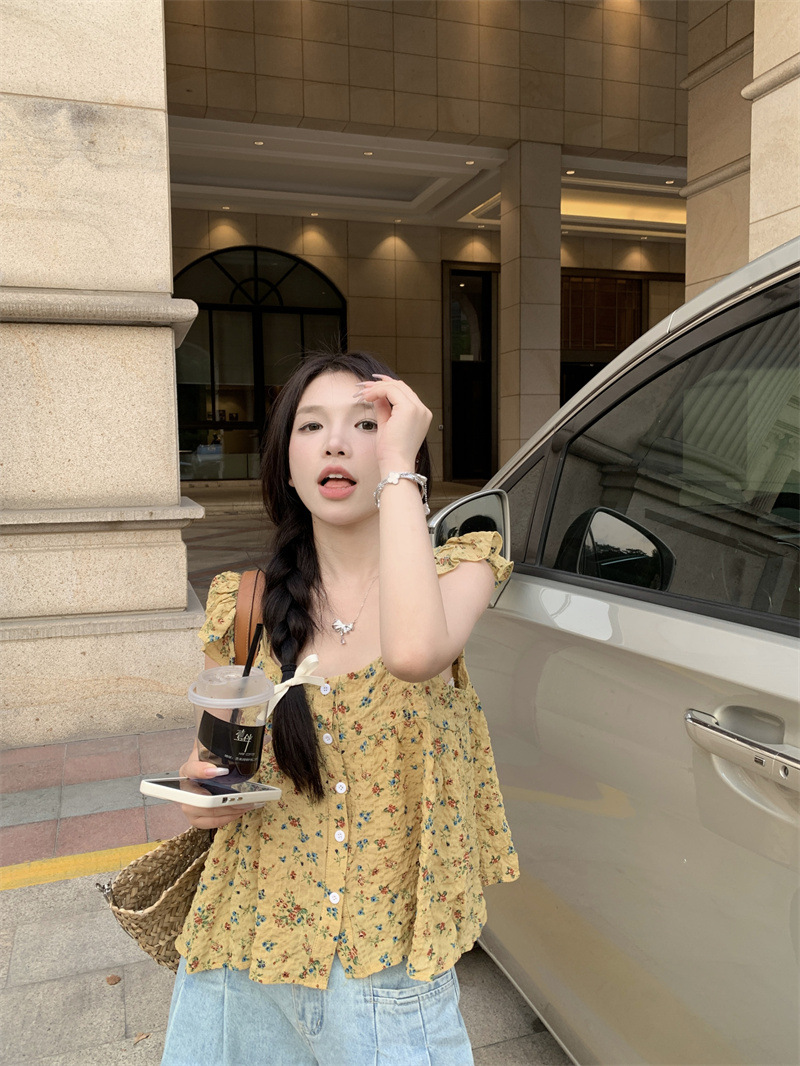 배꼽 노출 새로운 핫 소녀 셔츠 반팔 쉬폰 플라잉 슬리브 2025 스퀘어 넥 프렌치 짧은 셔츠 꽃 여름 드레스스토어 가기