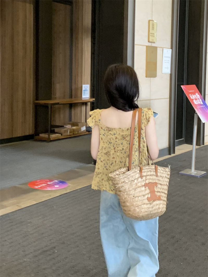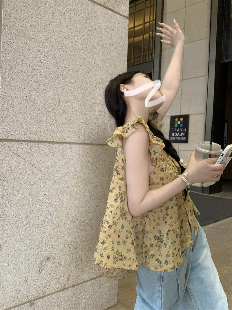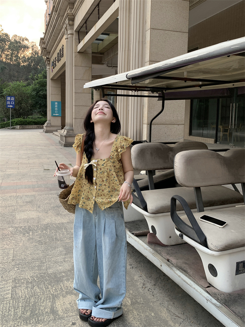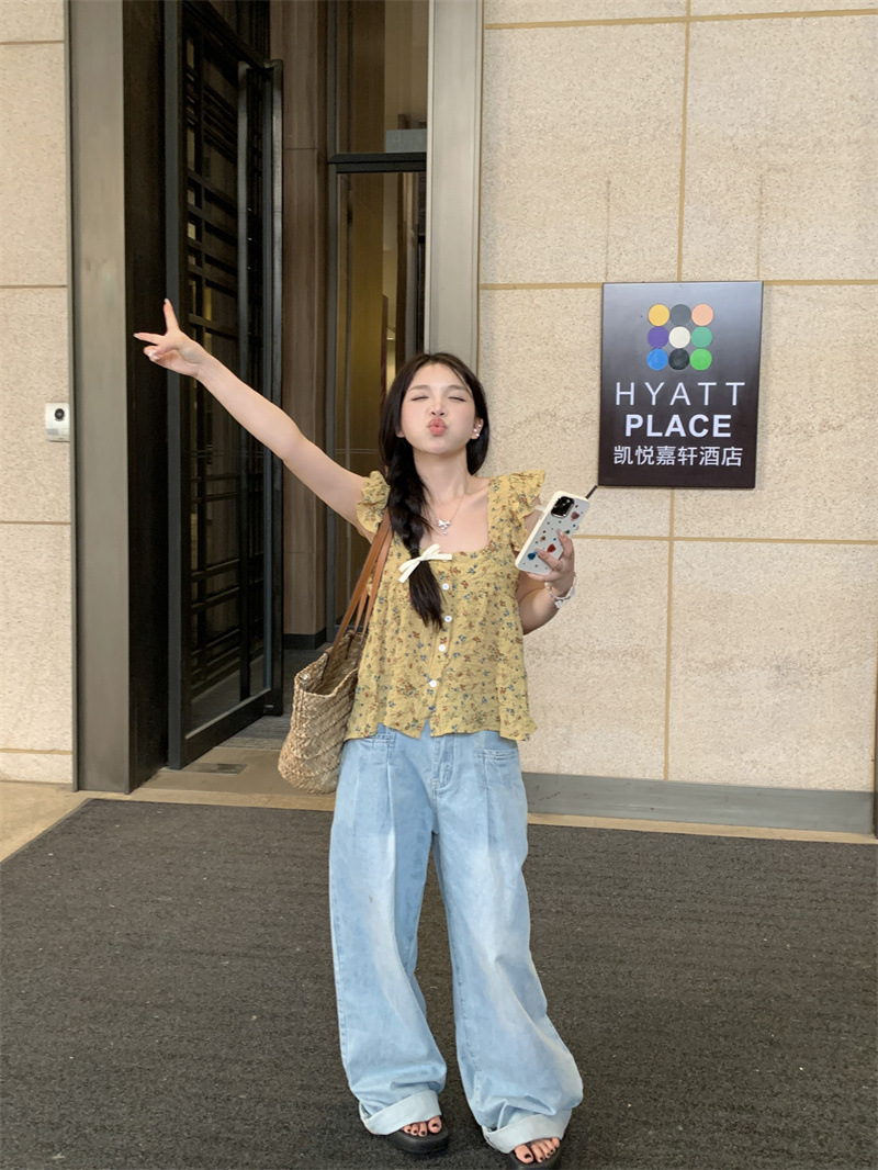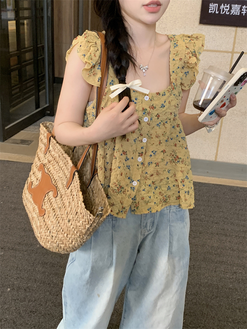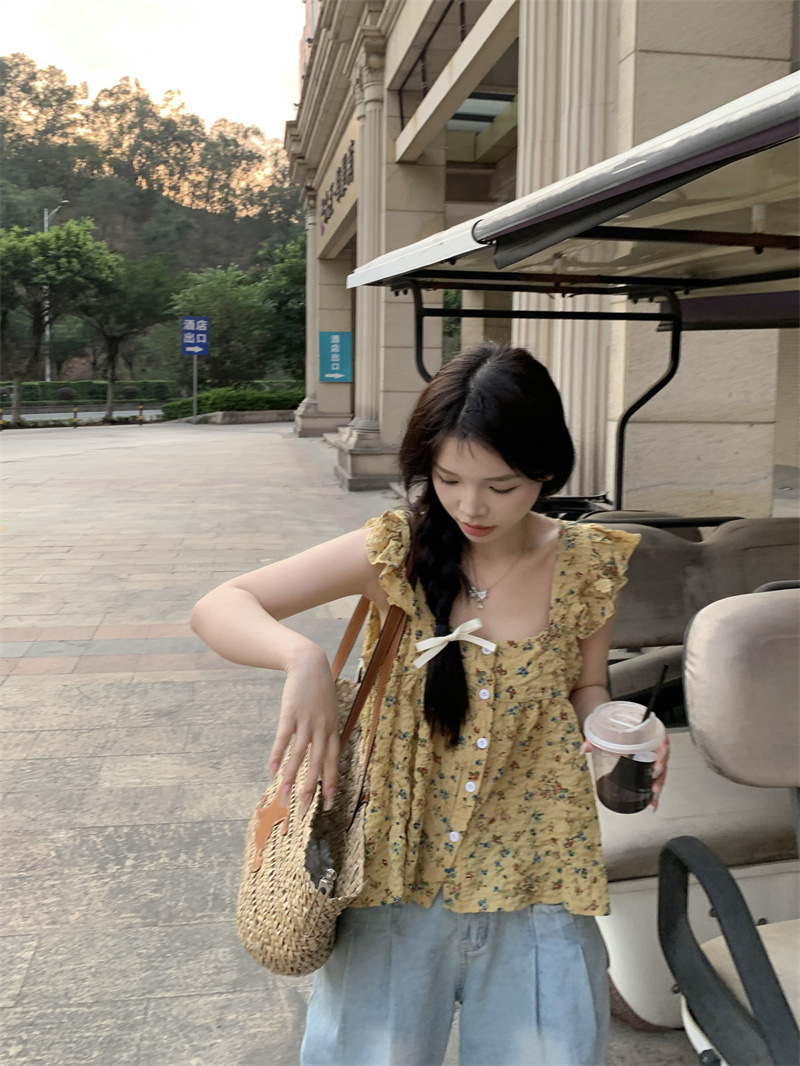 배꼽 노출 새로운 핫 소녀 셔츠 반팔 쉬폰 플라잉 슬리브 2025 스퀘어 넥 프렌치 짧은 셔츠 꽃 여름 드레스스토어 가기